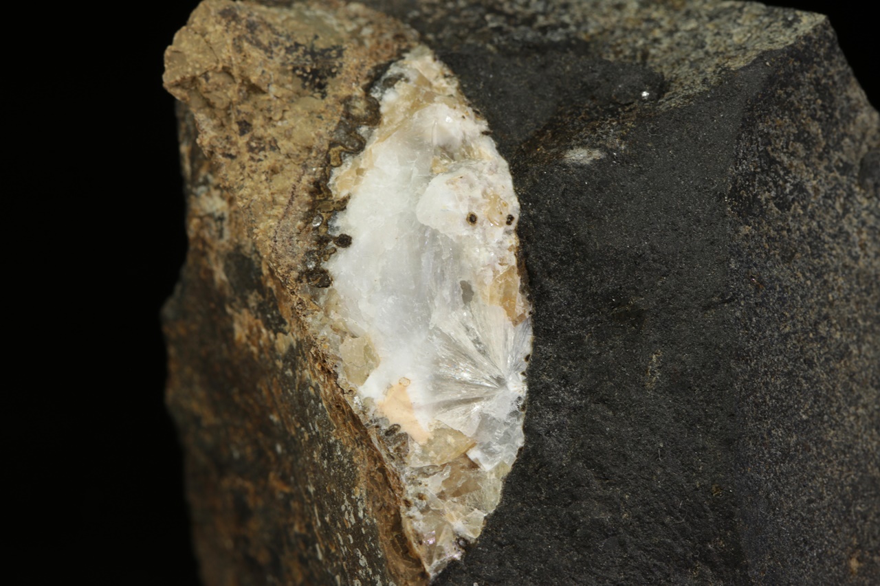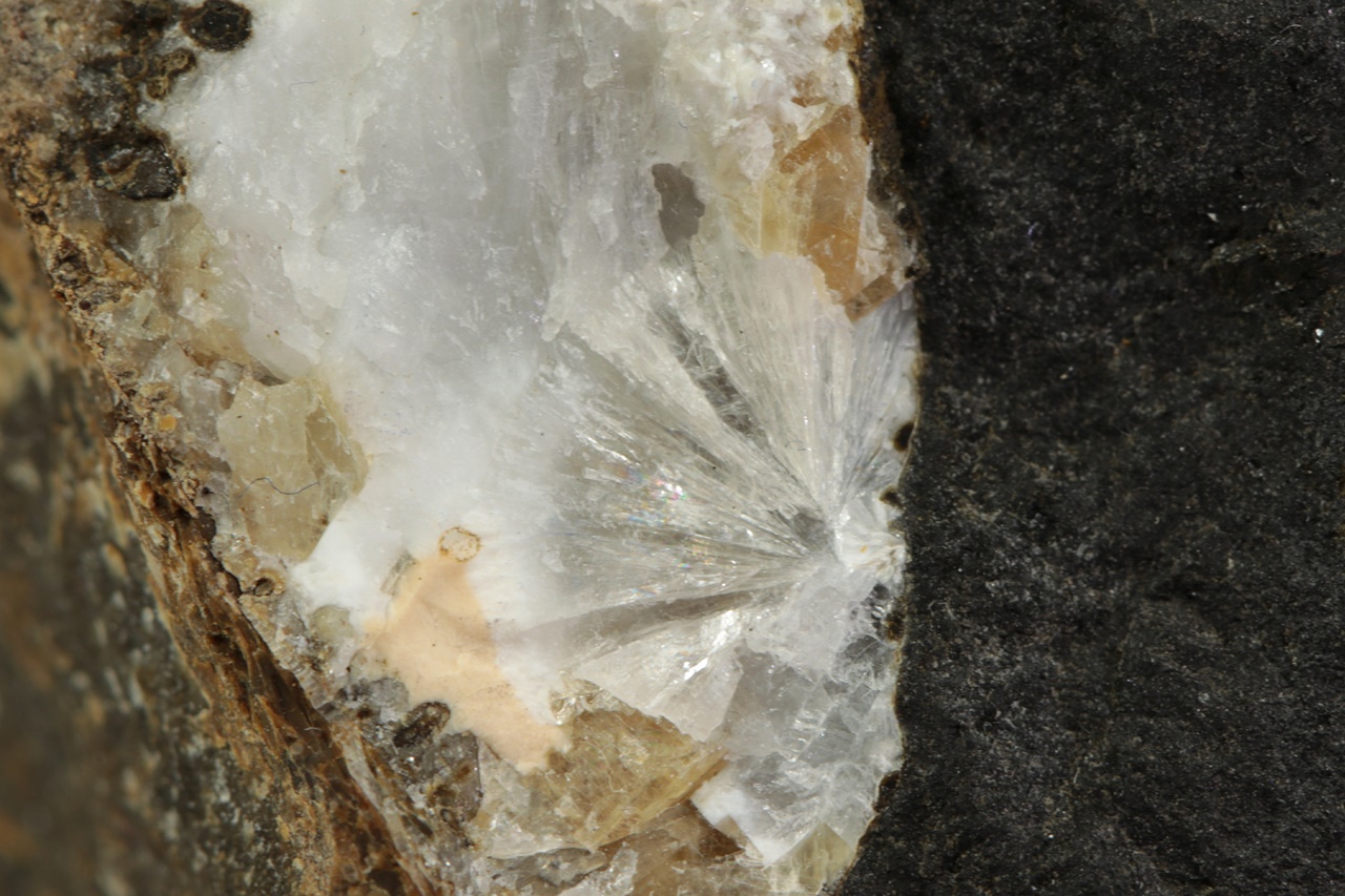 Vejfächerartige Aggregate des seltenen perlenartig glänzenden Zeofylitu. Die Größe der Höhle beträgt 4 × 1,5 cm.