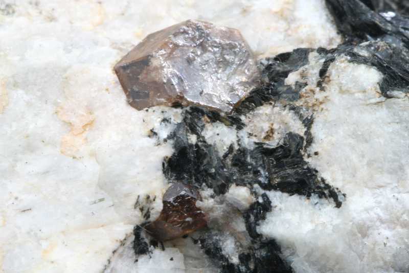 Braune Zirkon-Kristalle. Die Größe des eingeschränkten Zirkons beträgt bis zu 8 mm.