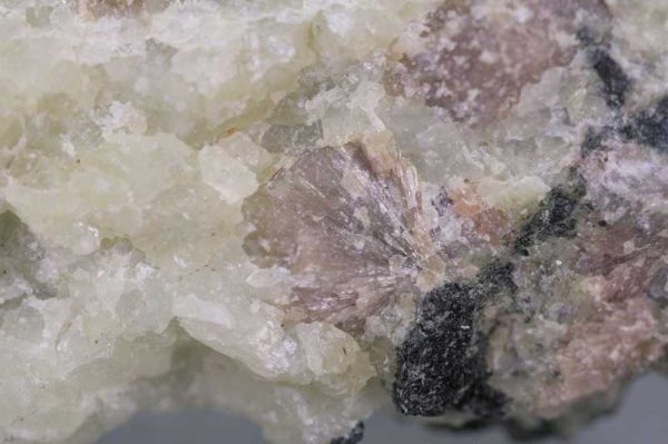 Reiche Stufe von alpinen Ader-Mineralen von Zoisit und Prehnit aus dem Steinbruch Markovice. Schöne Stufe von rosa bis braun gefärbten, stängeligen Aggregaten des Zoisits, die in hellgrüne Aggregate des Prehnits eingewachsen sind; die Probe hat eine abgeschnittene Basis .
