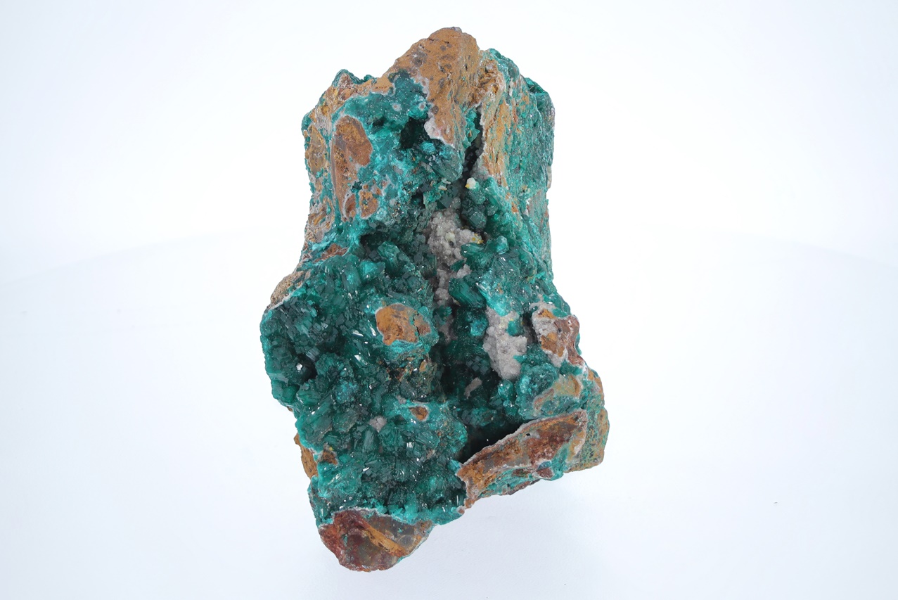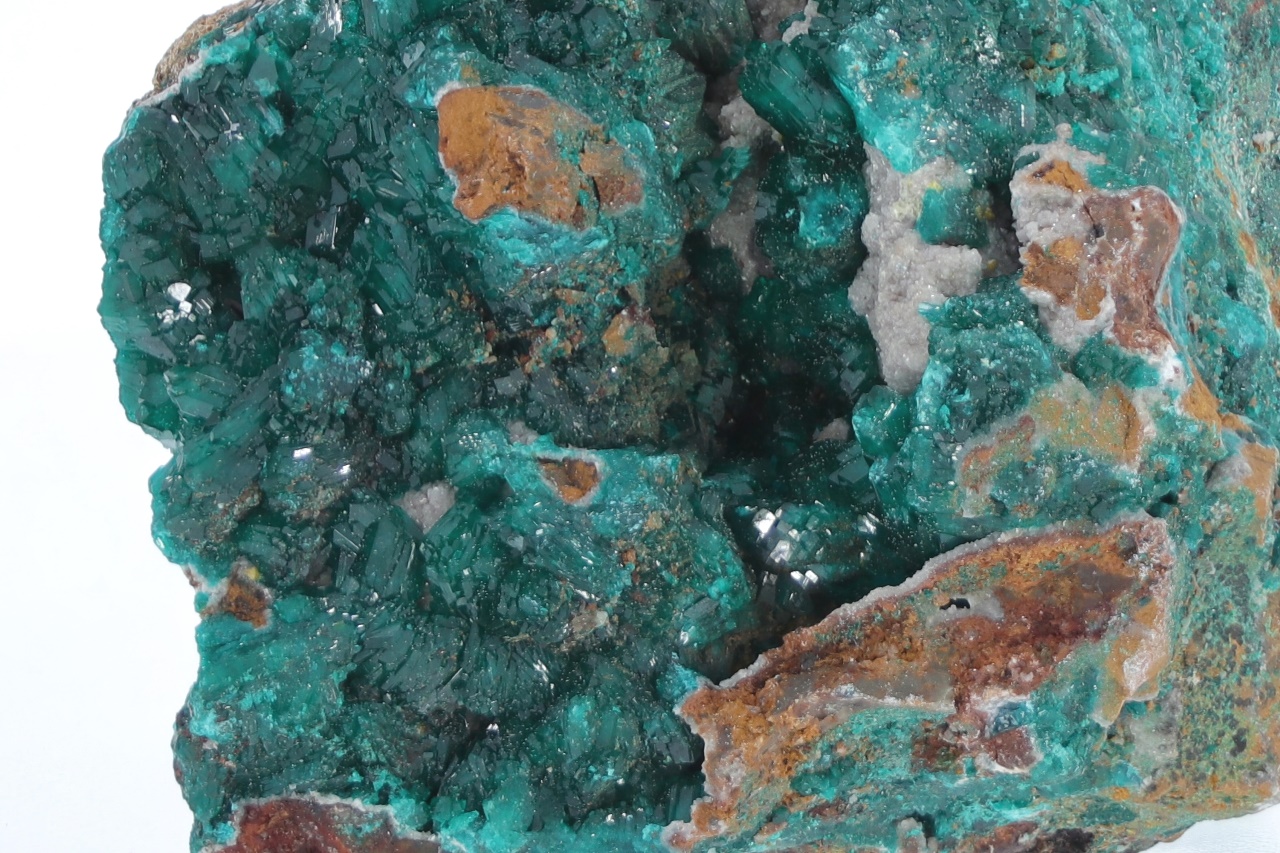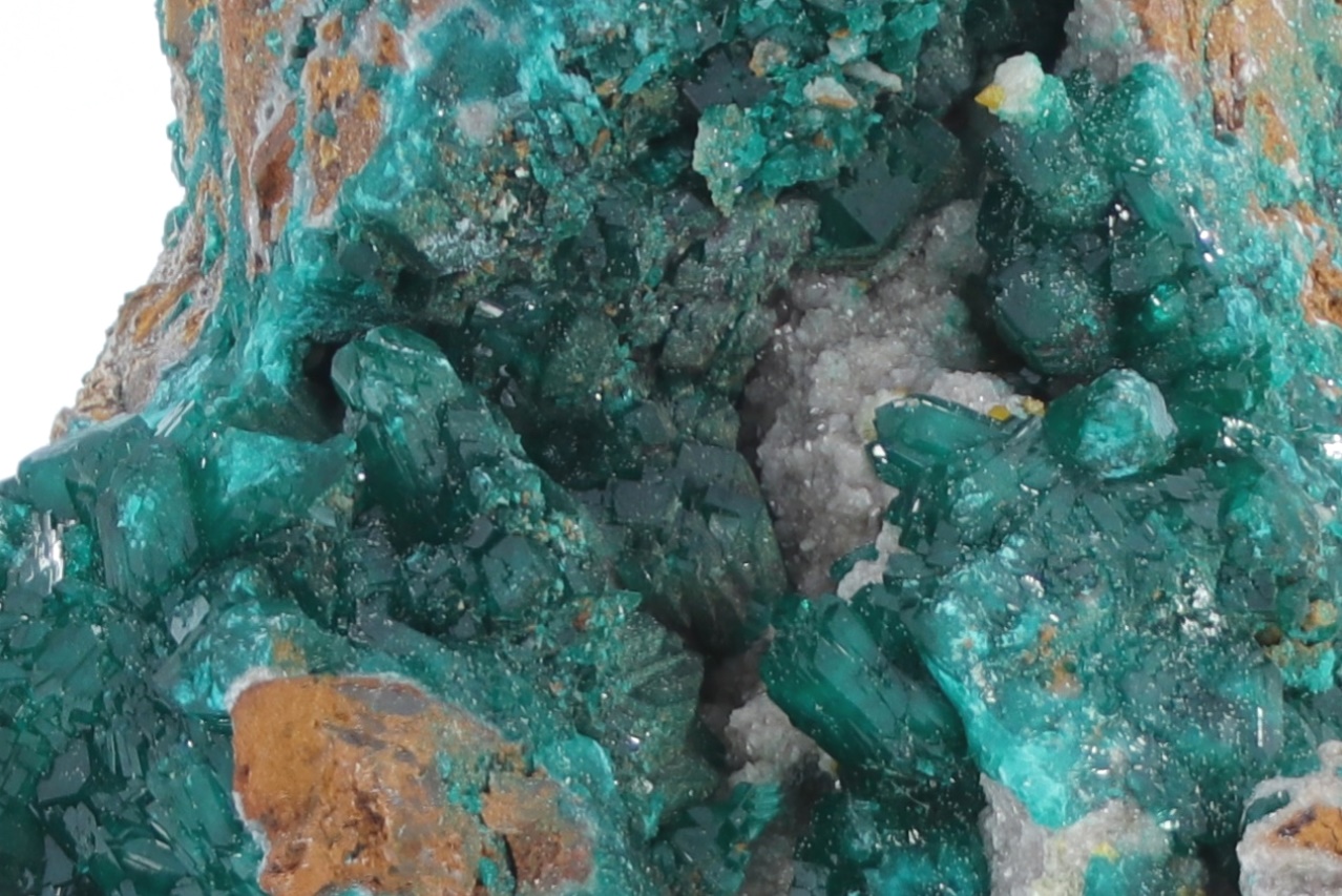 Die Größe des größten unbeschädigten Kristalls beträgt 1 cm. Drusen sind über die gesamte Probe verteilt. Wunderschönes Exemplar von Drusen Dioptas mit tannengrün gefärbten Kristallen und außergewöhnlichem Glanz.