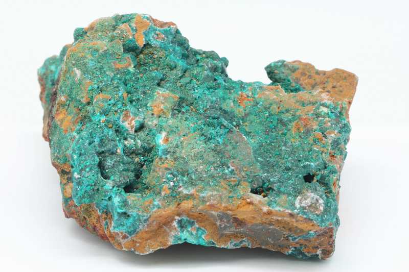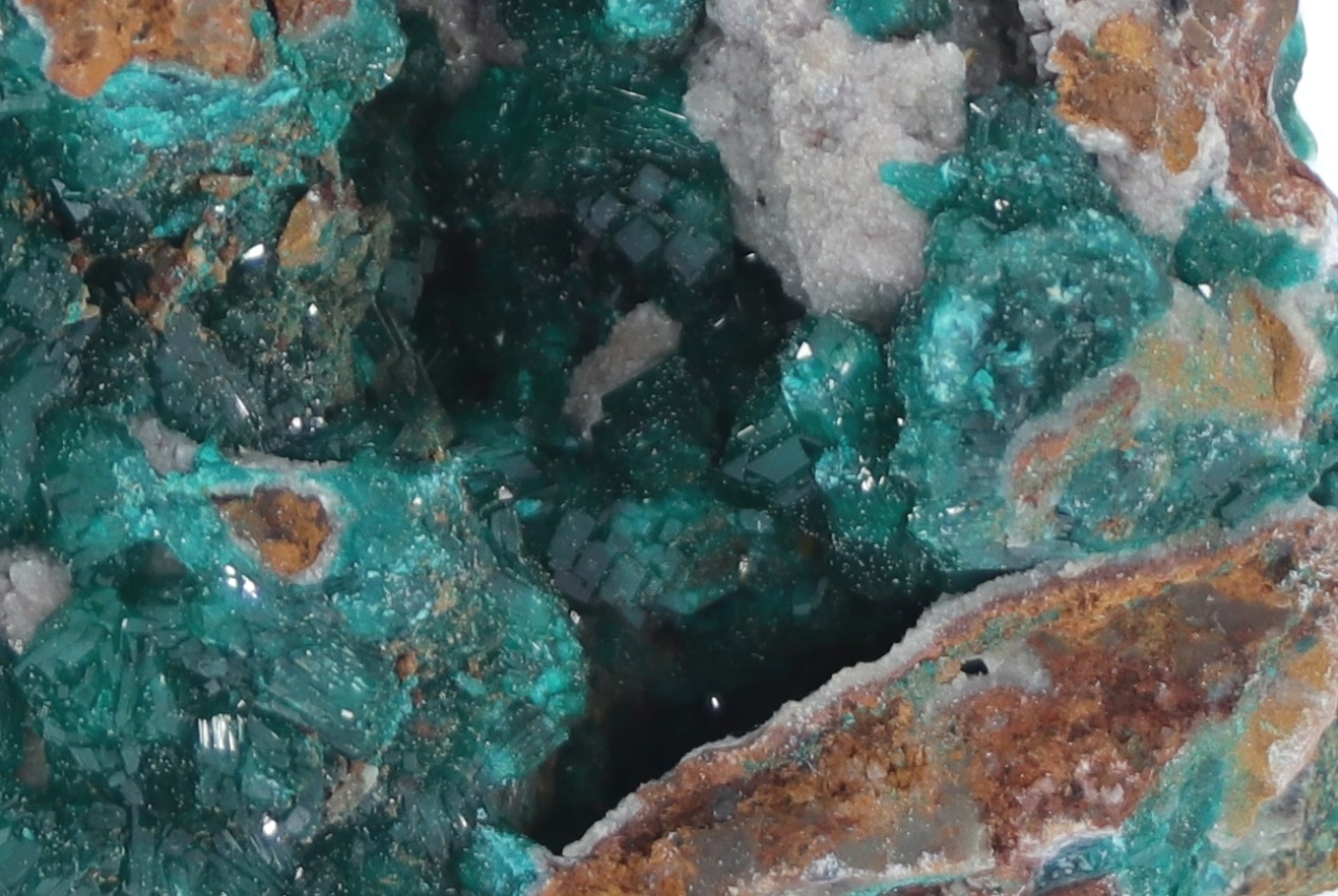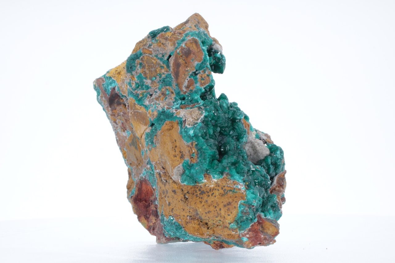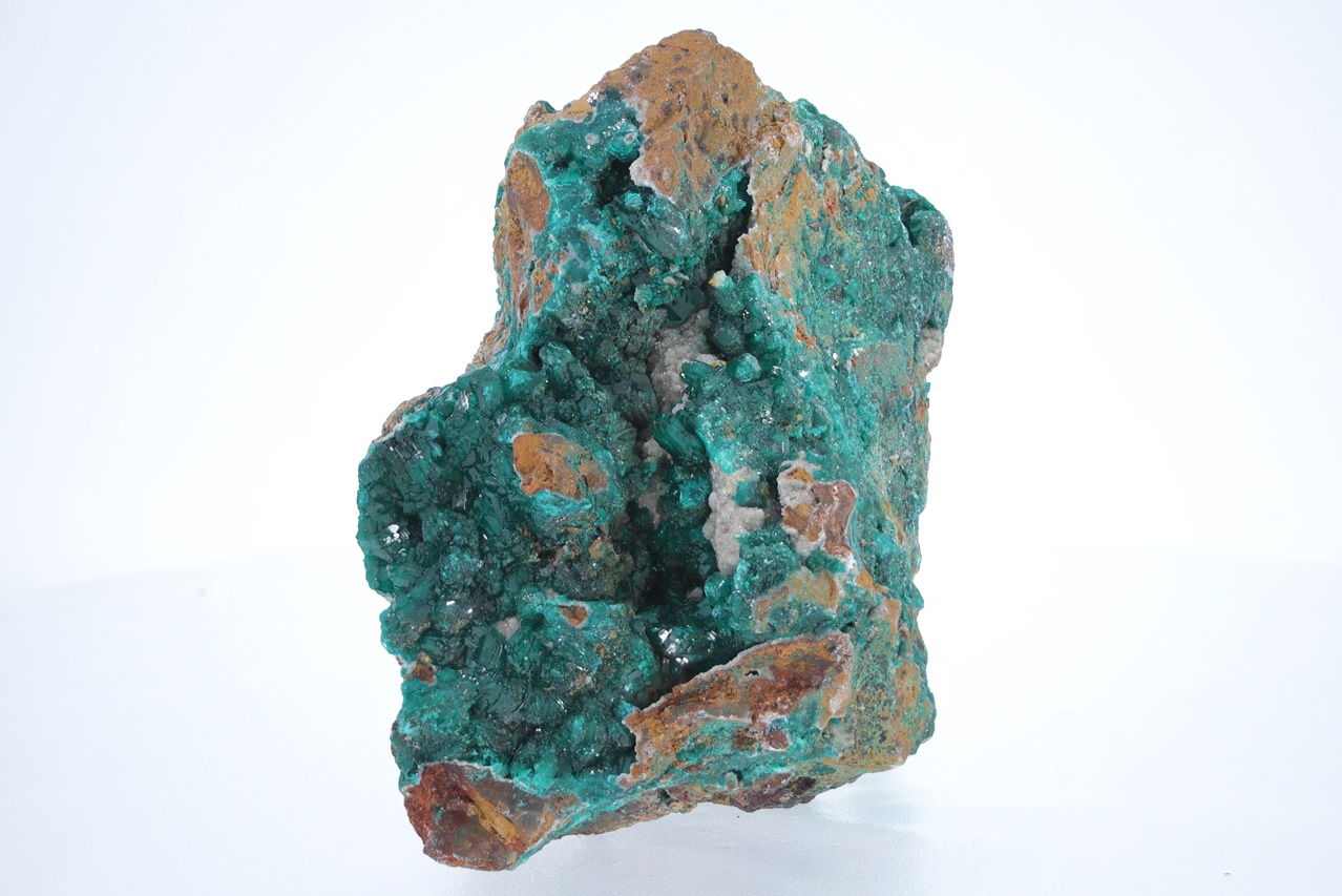 Die Größe des größten unbeschädigten Kristalls beträgt 1 cm. Drusen sind über die gesamte Probe verteilt. Wunderschönes Exemplar von Drusen Dioptas mit tannengrün gefärbten Kristallen und außergewöhnlichem Glanz.