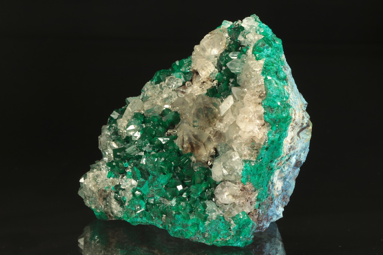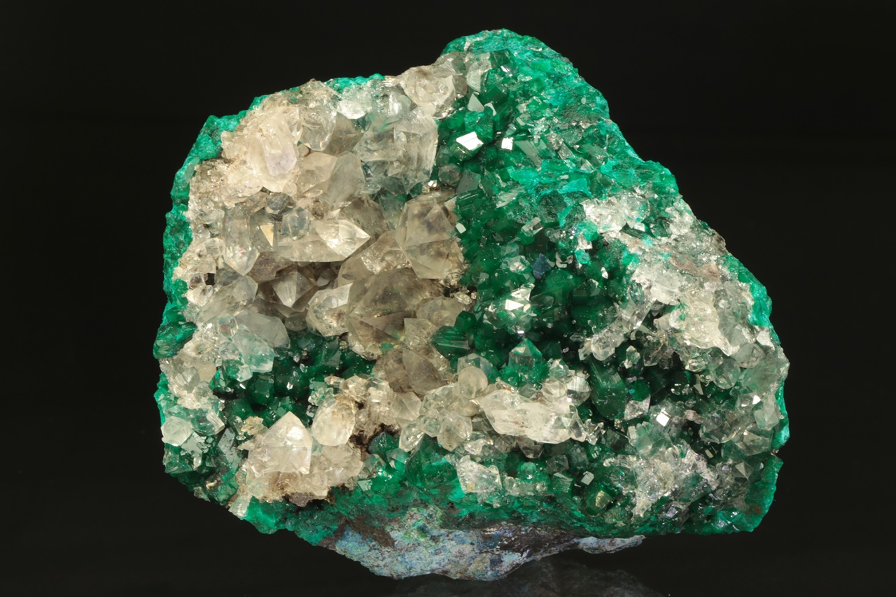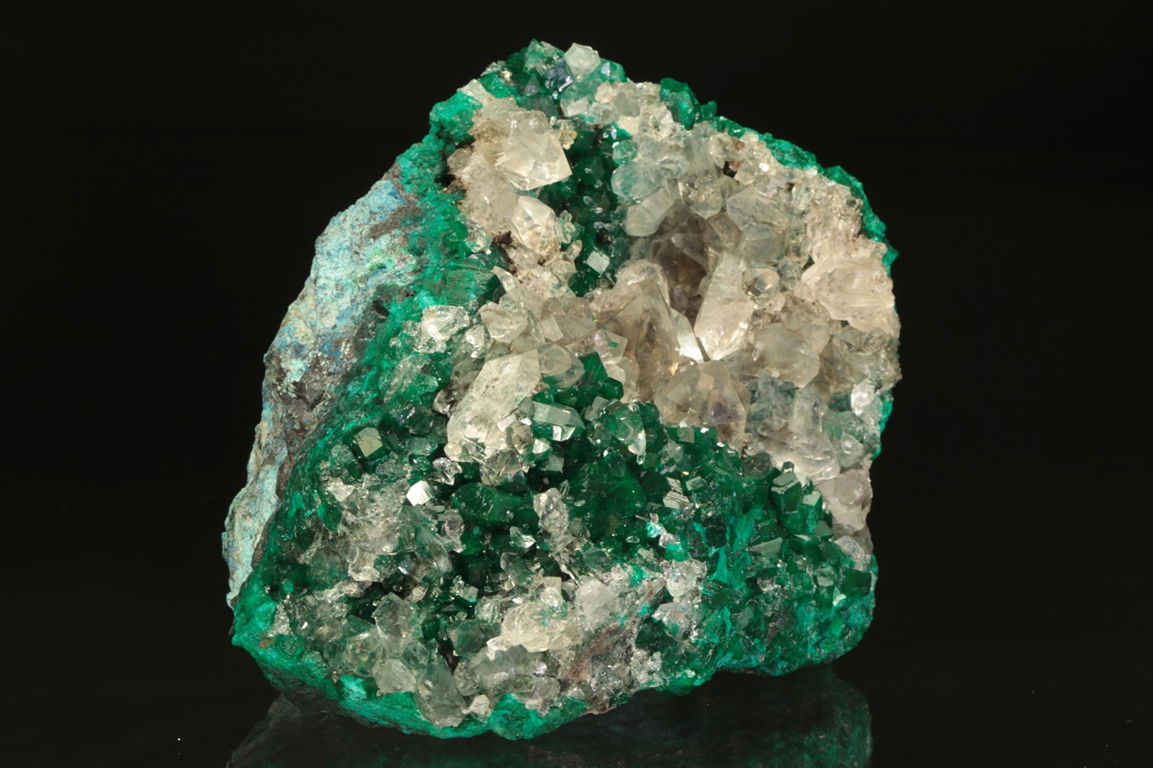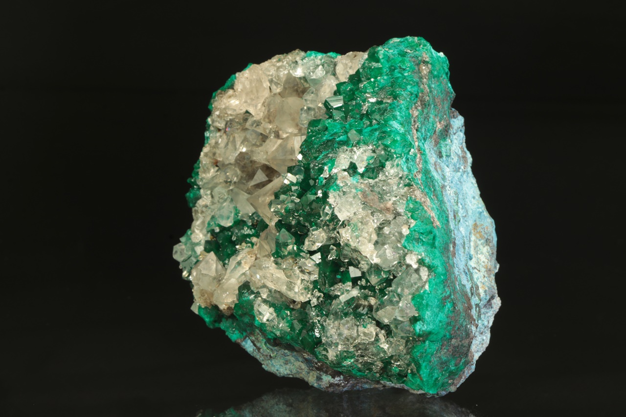Nádherný vzorek drúzy velmi lesklých krystalů intenzivně zelených krystalů diopsidu, na které narůstají krystaly velmi lesklé záhnědy a křišťálu. Podložku pak tvoří vzácný modrý shattuckit. Největší krystal záhnědy je 1,5 cm velký.