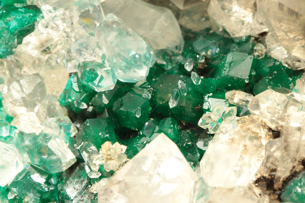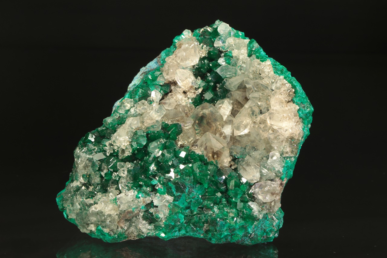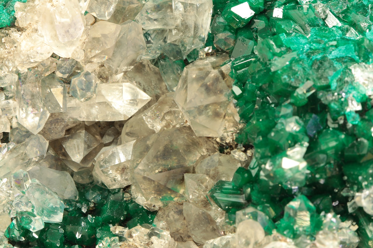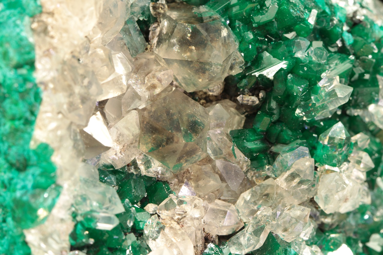 Nádherný vzorek drúzy velmi lesklých krystalů intenzivně zelených krystalů diopsidu, na které narůstají krystaly velmi lesklé záhnědy a křišťálu. Podložku pak tvoří vzácný modrý shattuckit. Největší krystal záhnědy je 1,5 cm velký.