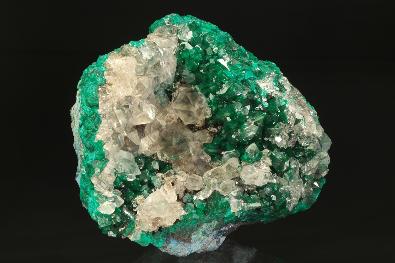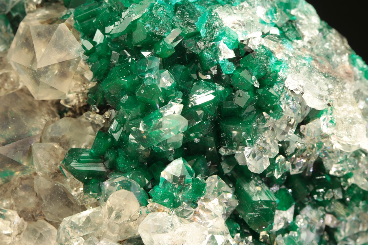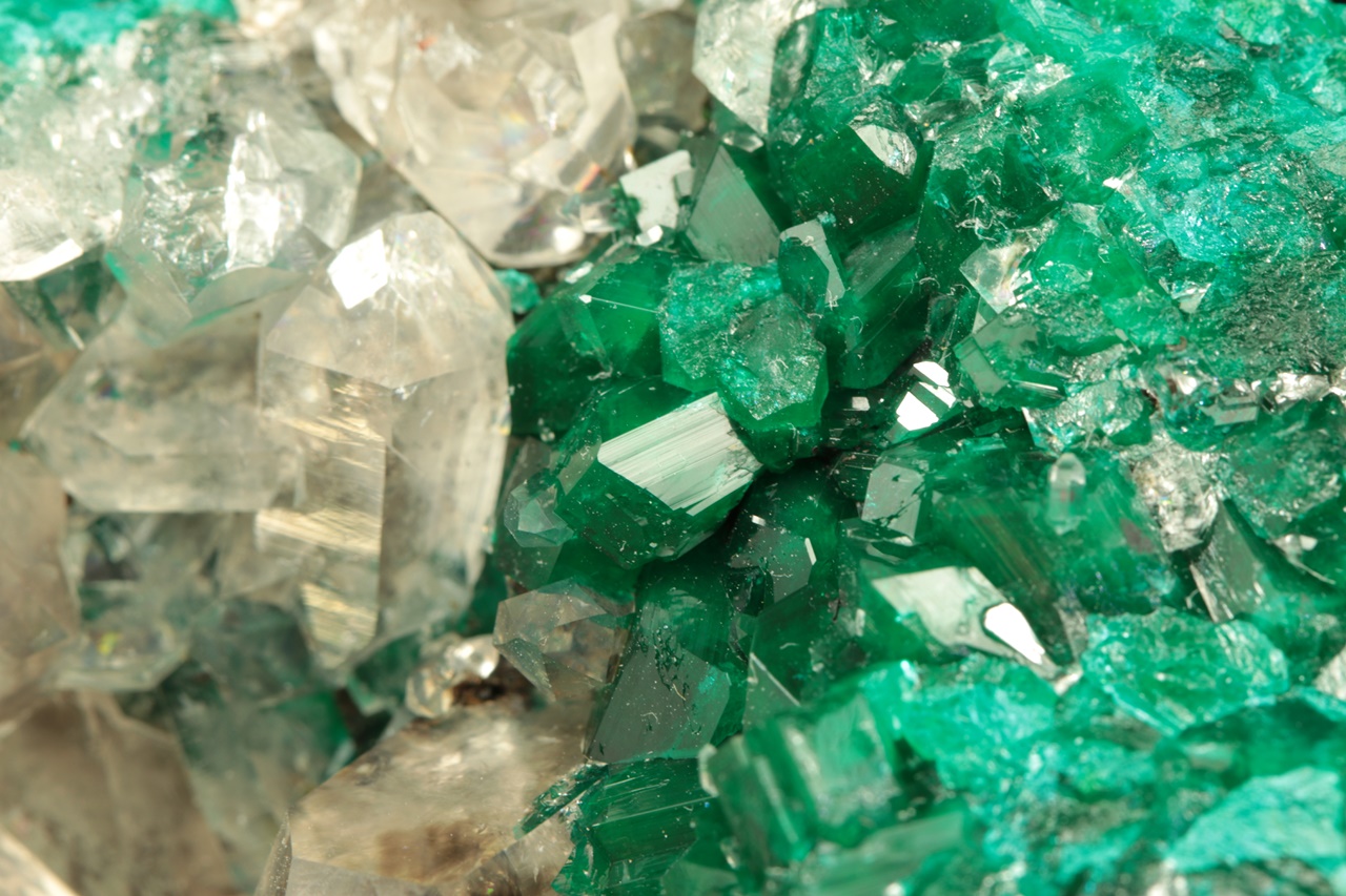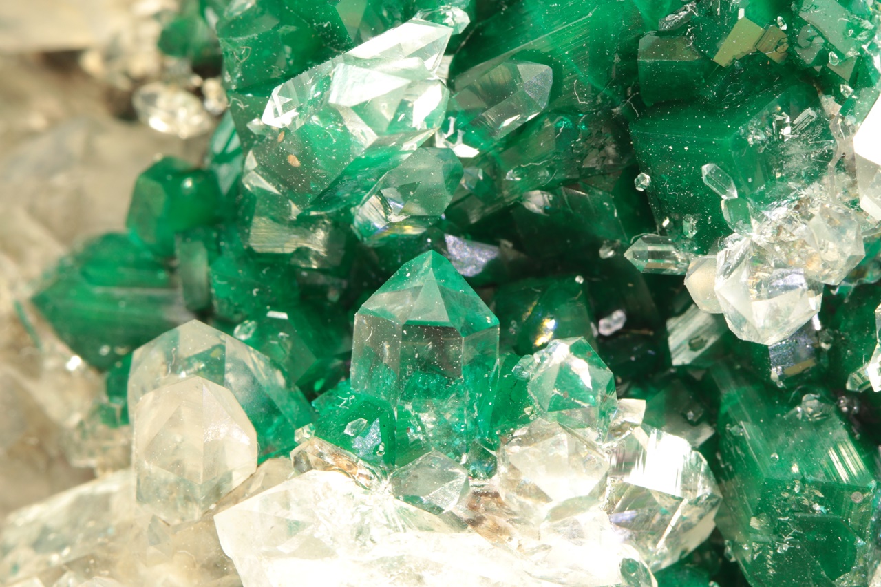 Nádherný vzorek drúzy velmi lesklých krystalů intenzivně zelených krystalů diopsidu, na které narůstají krystaly velmi lesklé záhnědy a křišťálu. Podložku pak tvoří vzácný modrý shattuckit. Největší krystal záhnědy je 1,5 cm velký.