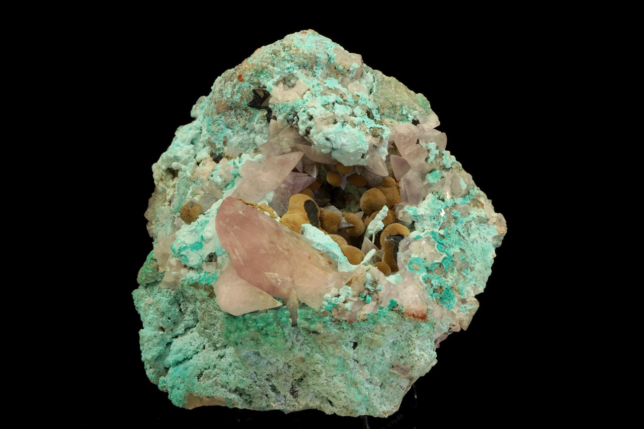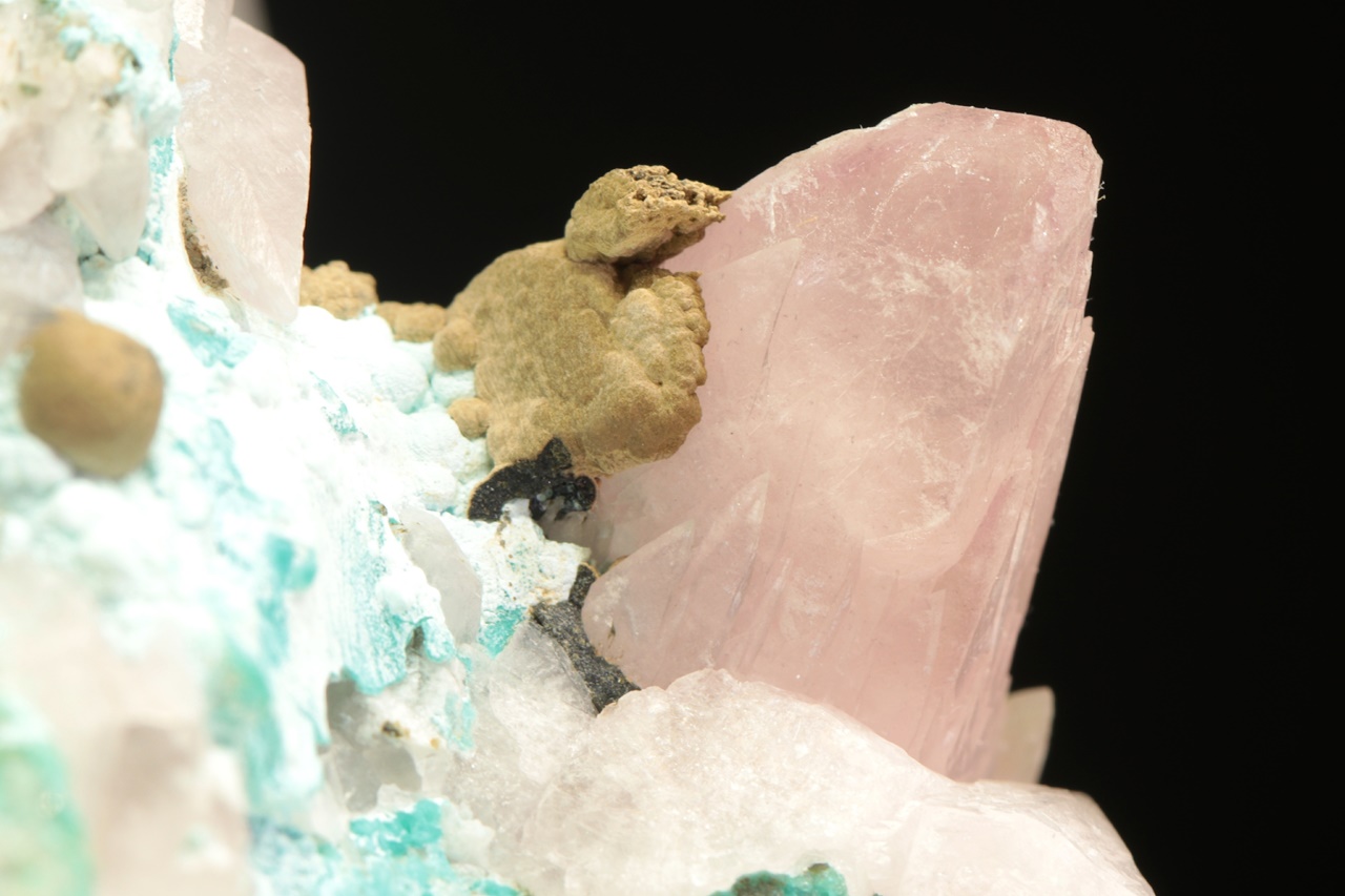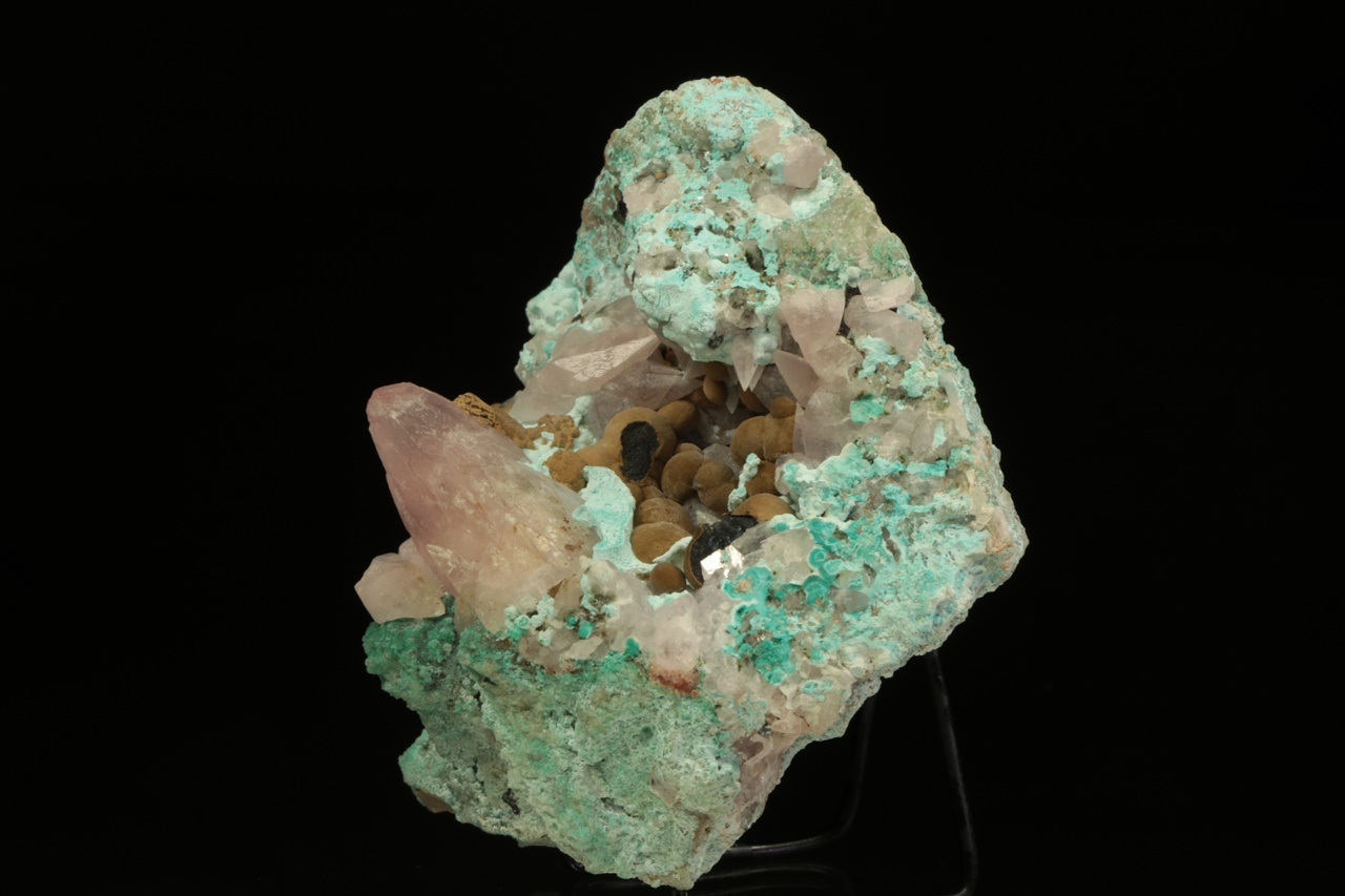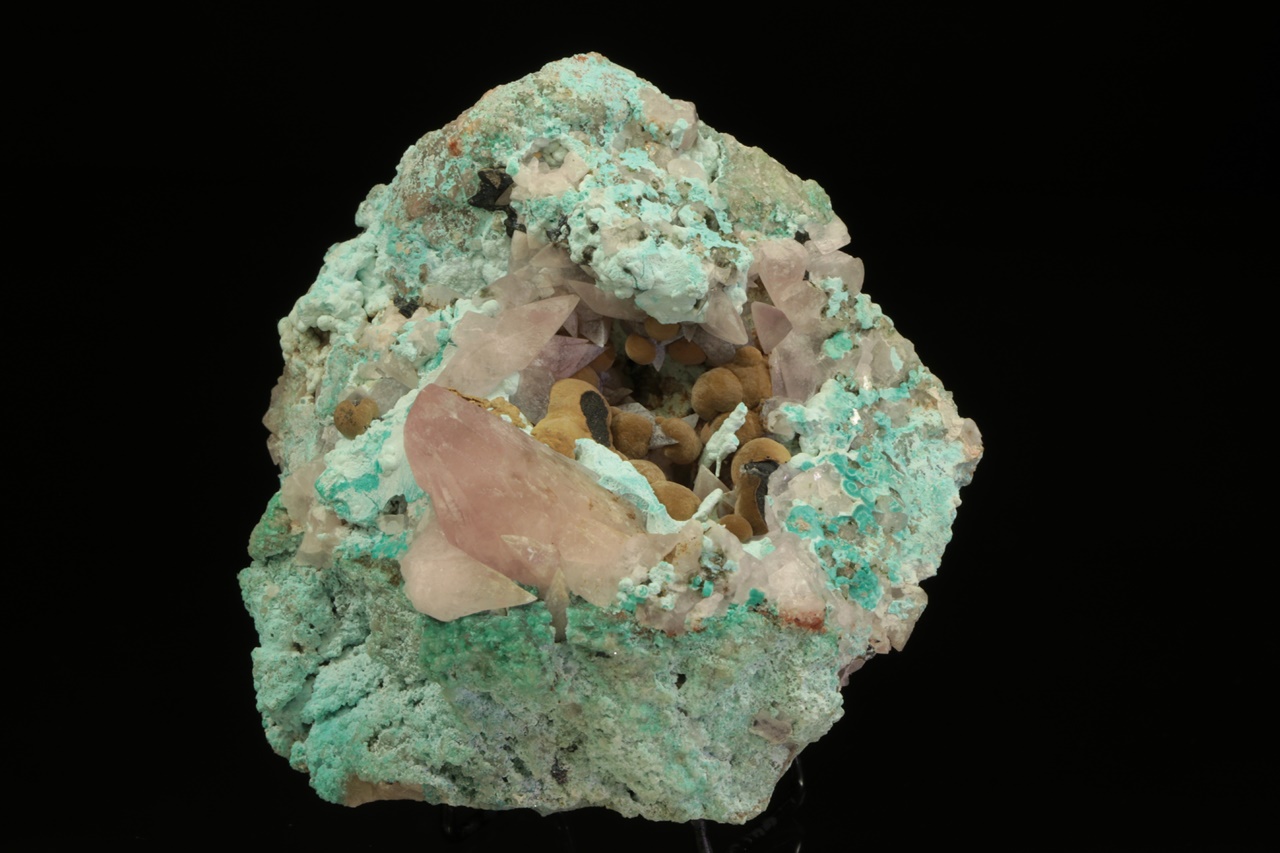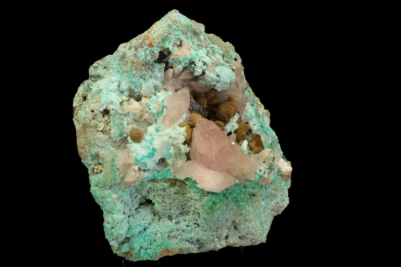 Béžové radiální agregáty sametově lesklého kolwezitu (z typové lokality) s růžovým, kobaltem bohatým kalcitem v dutině v modrém chryzokolu. Největší krystal kobaltokalcitu je 2,5 cm velký, špička krystalu je uštíplá. Velmi estetický vzorek.