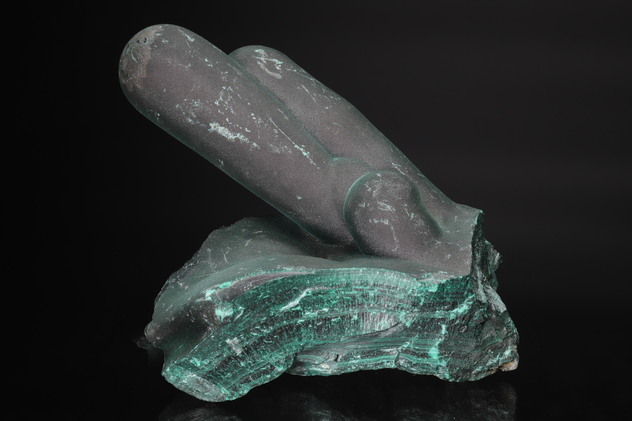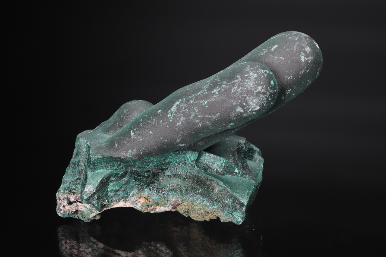 Esthetische Stücke von krabbenartigen Formationen aus dunkelgrünem Malachit von ca. 10 cm Größe, die aus einer dicken nierigen Malachitkruste herauswachsen.