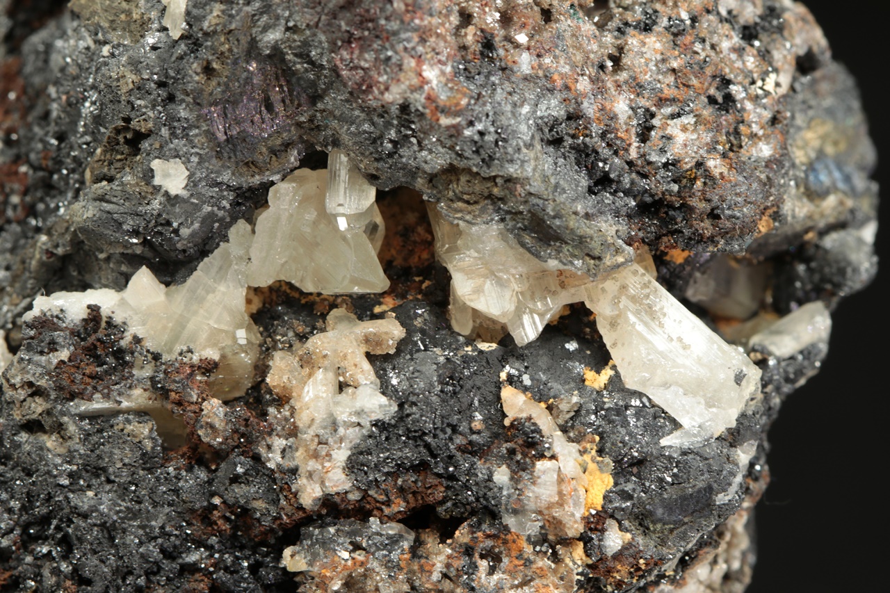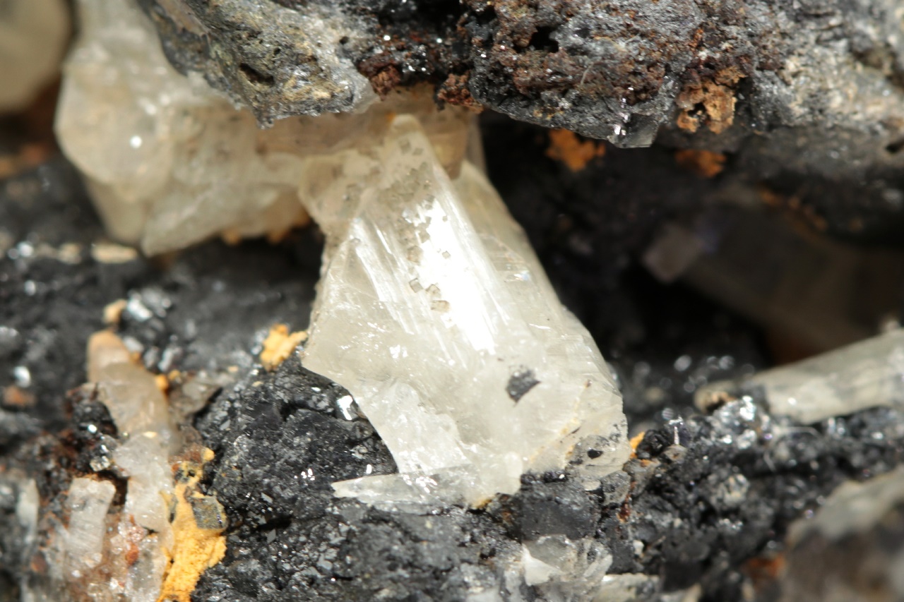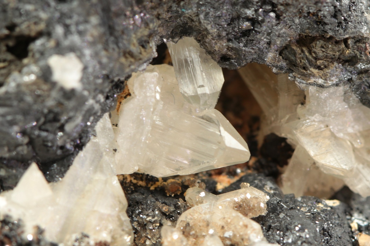 Weiße, glänzende Kristalle des Bleisulfids Anglesit, gewachsen in einer Höhle des schwarzen, massiven Galenits. Der größte Kristall ist 15 mm groß.