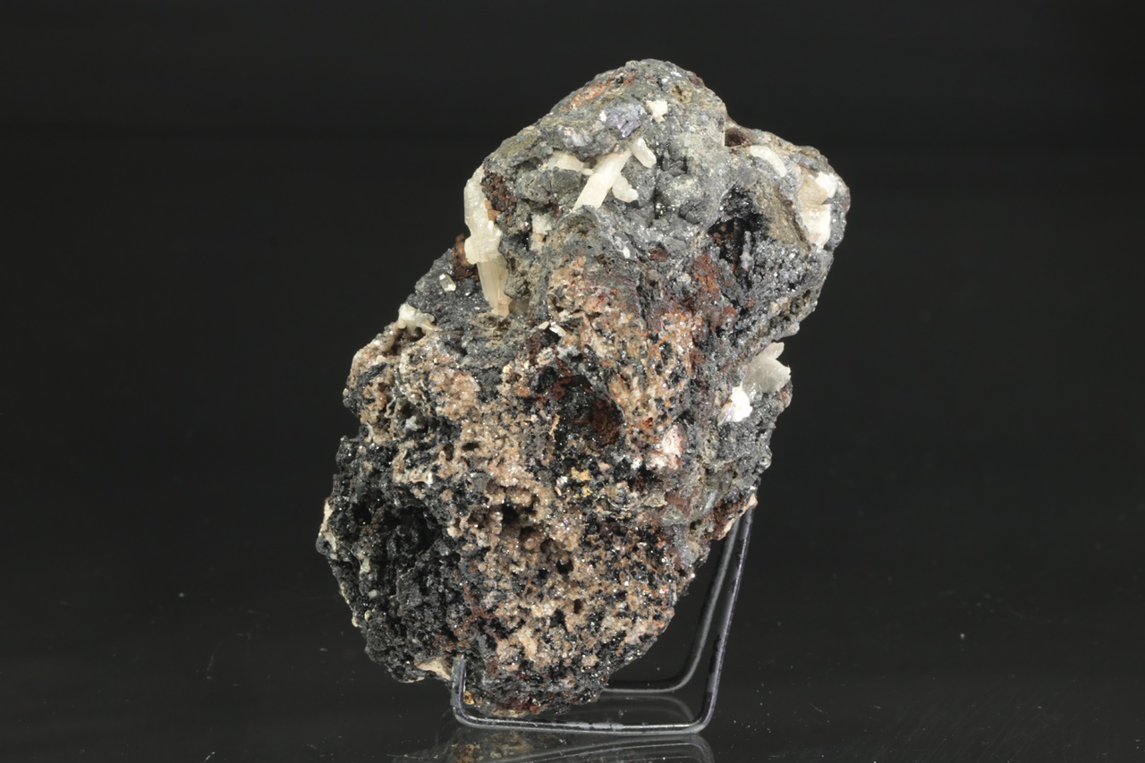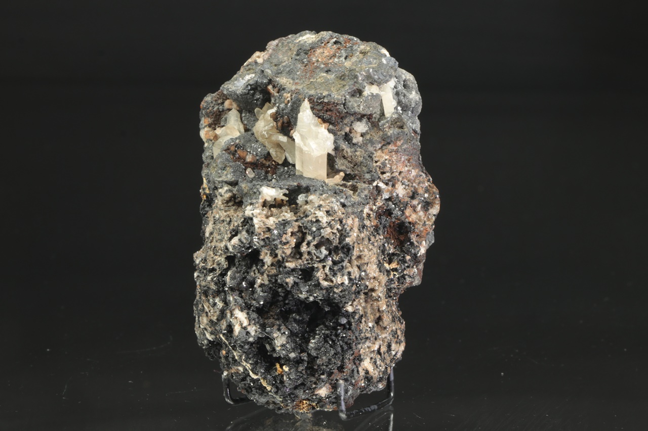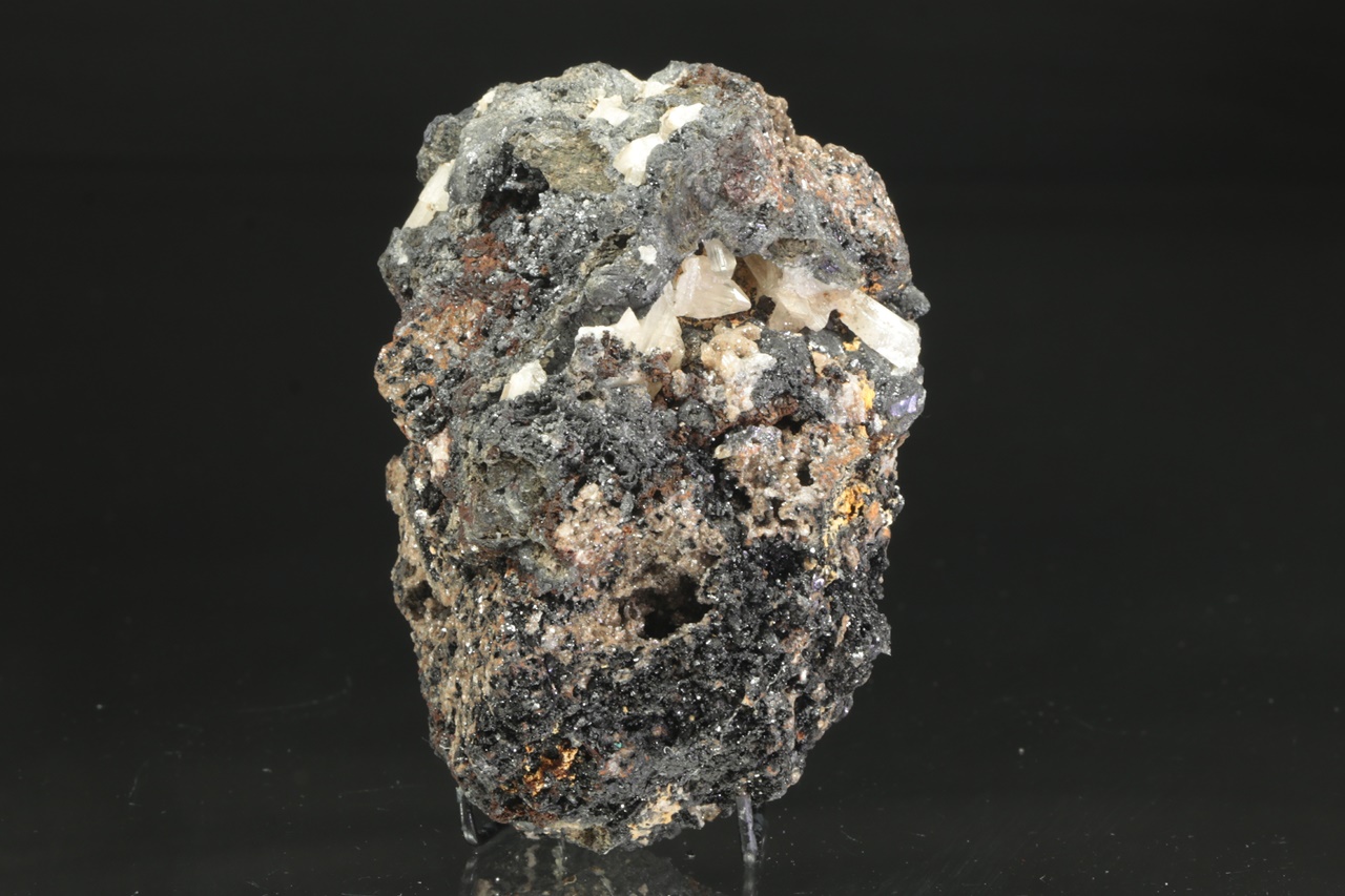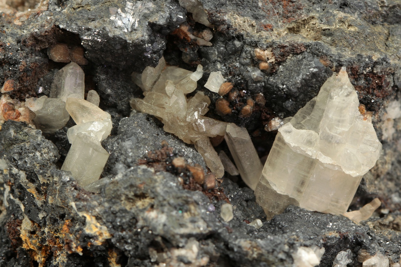 Weiße, glänzende Kristalle des Bleisulfids Anglesit, gewachsen in einer Höhle des schwarzen, massiven Galenits. Der größte Kristall ist 15 mm groß.