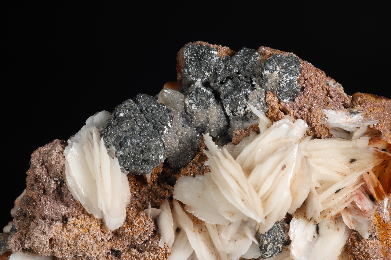 Sehr ästhetische Kombination mehrerer Minerale aus der marokkanischen Fundstelle Mibladen. Verwachsungen von weißen, tafeligen Baryt-Kristallen bis zu 25 mm sind ergänzt durch Galenit-Kristalle bis zu 14 mm, Cerusit-Kristalle bis zu 7 mm und kleinen Dolomit-Kristallen.