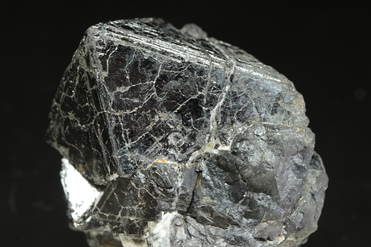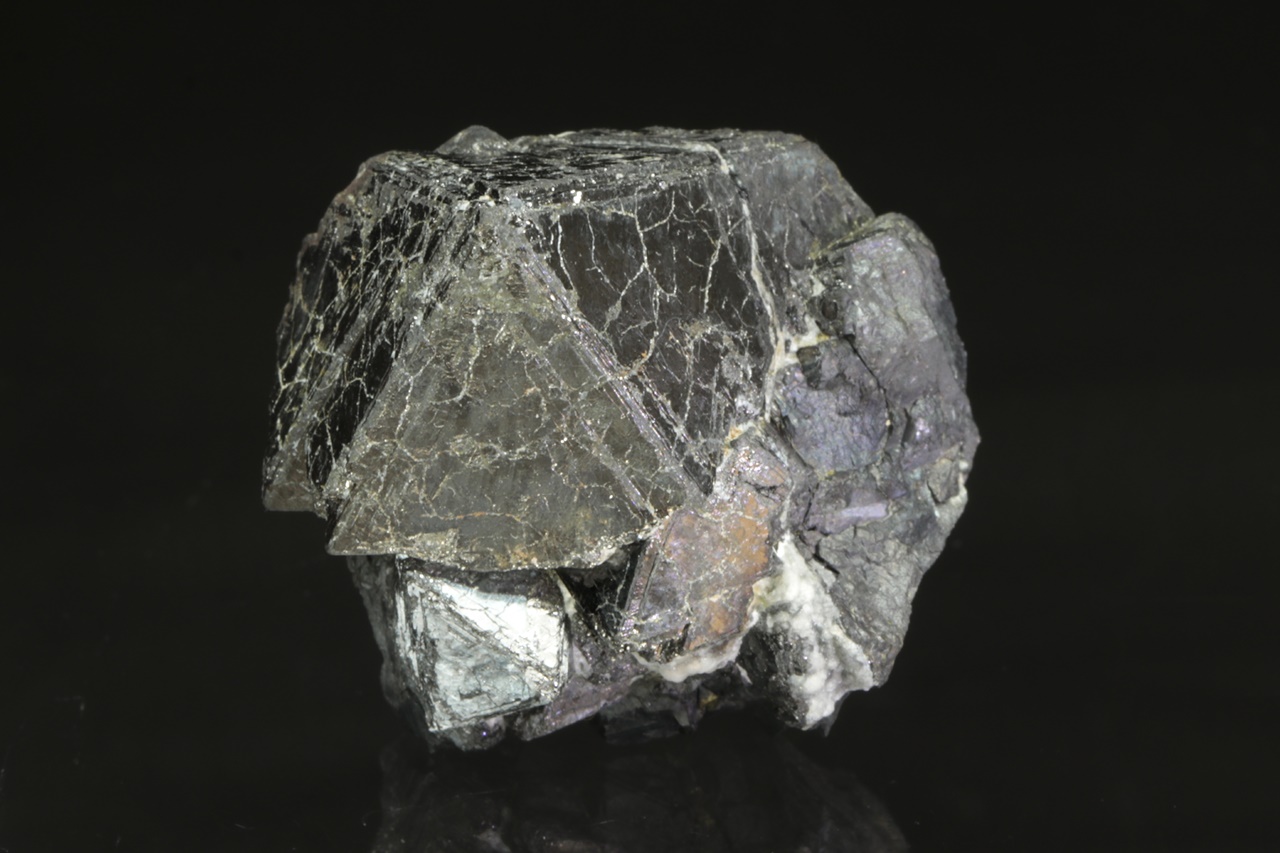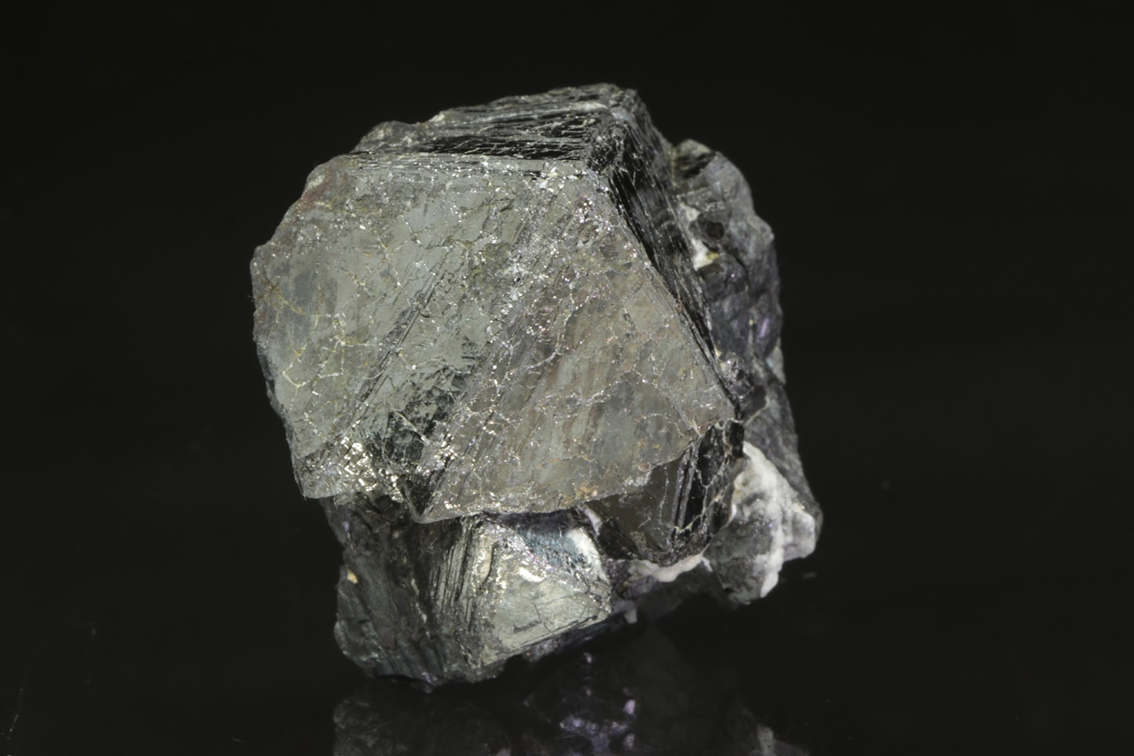 Dreieinhalb Zentimeter großer, glänzender Magnetitkristall verwachsen mit kleineren Kristallen.
