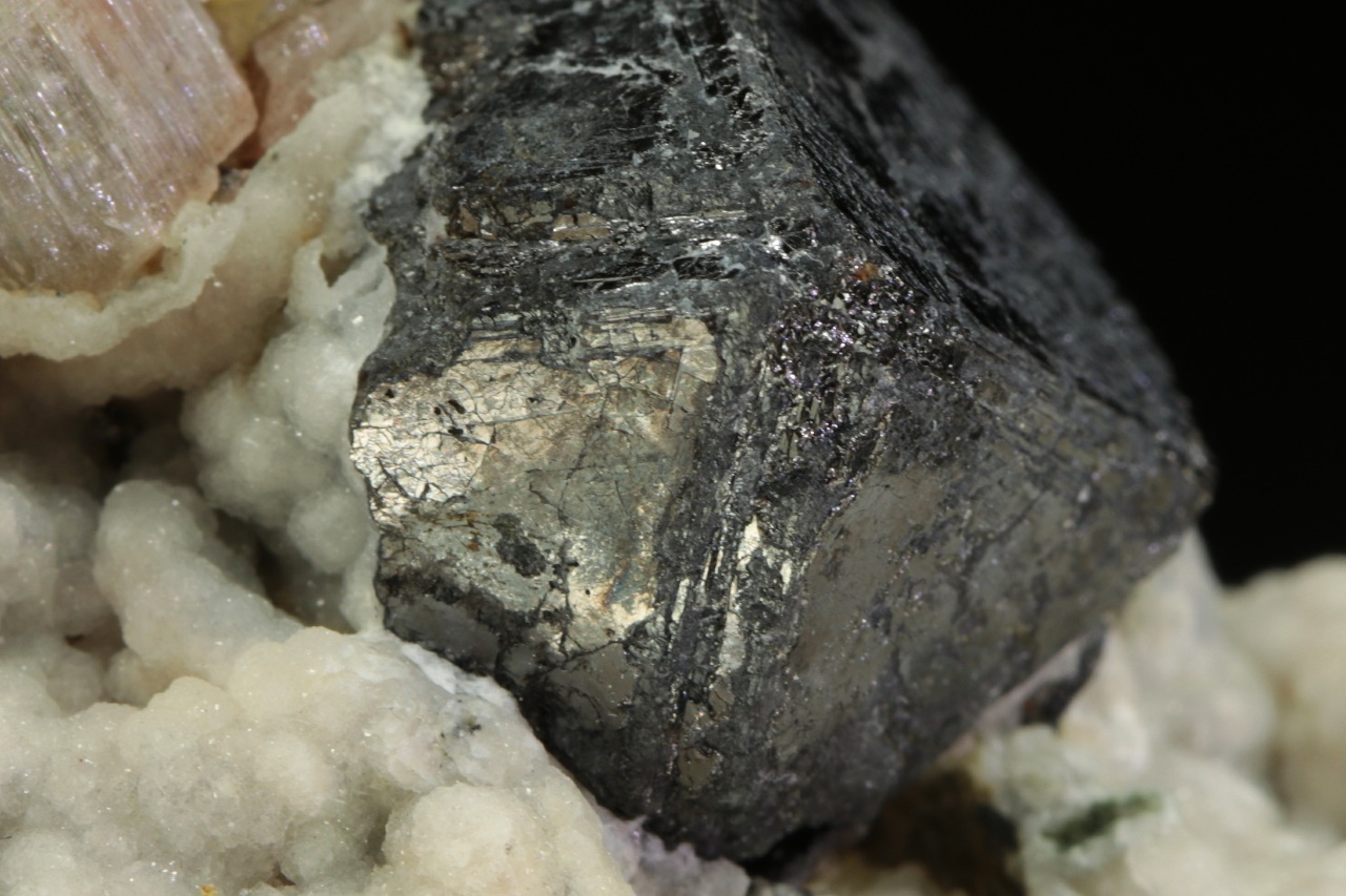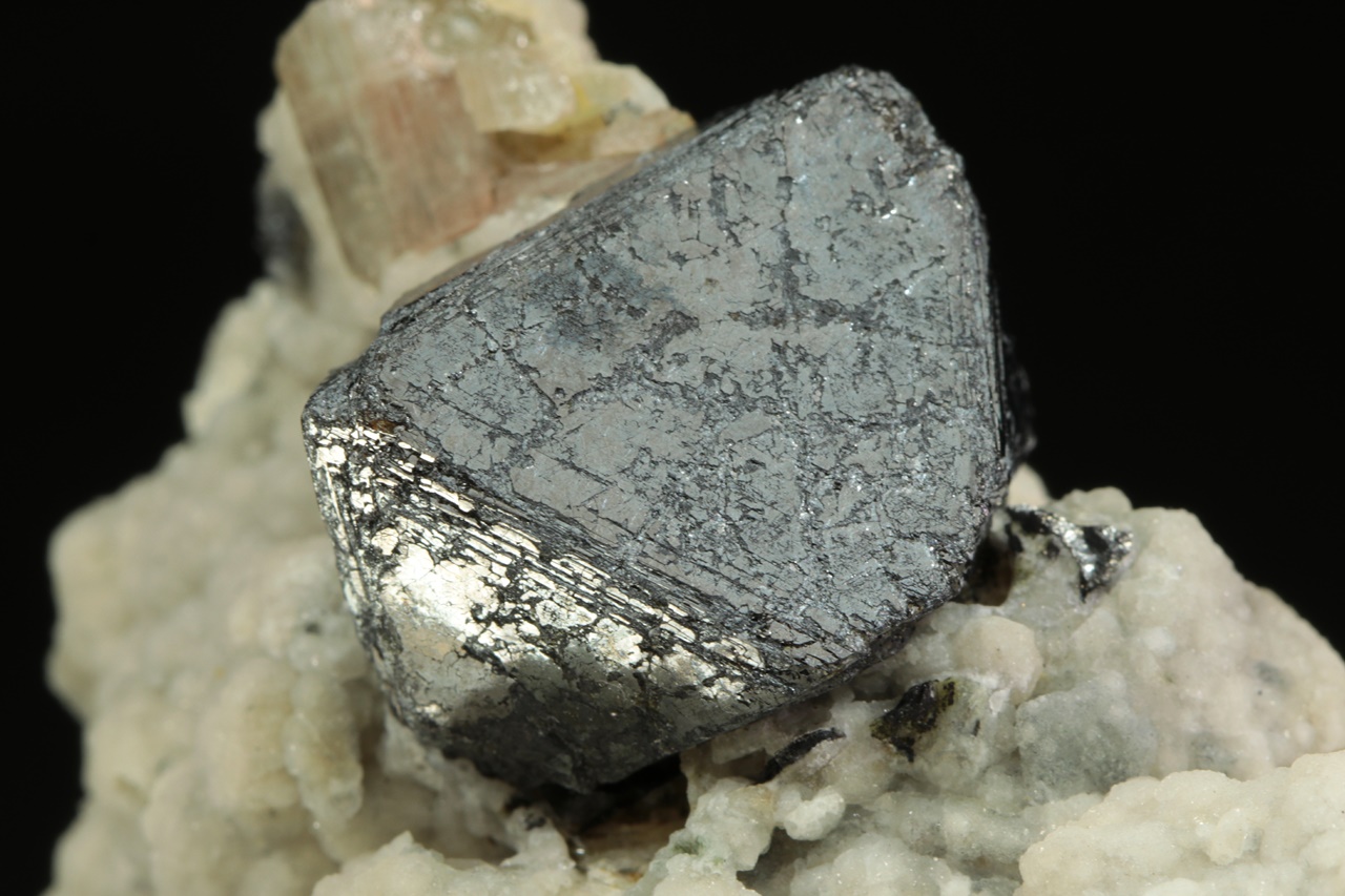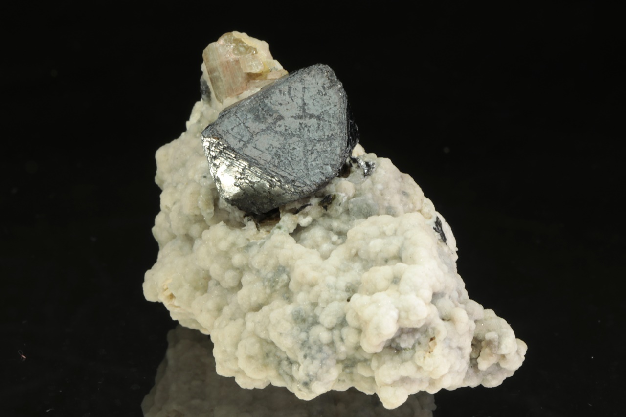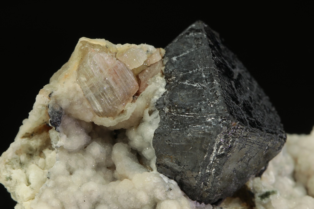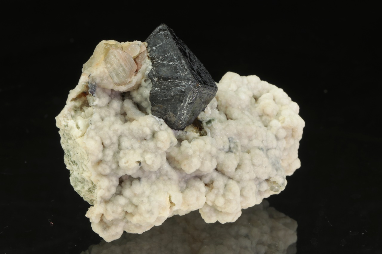 Zwei Zentimeter großer Oktaeder aus Magnetit mit beigem Apatit (7 mm groß) mit ausgeprägter prismatischer Riefung, umgeben von traubenförmigem weißen Calcit.