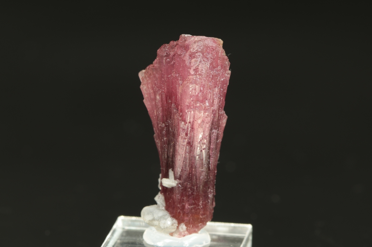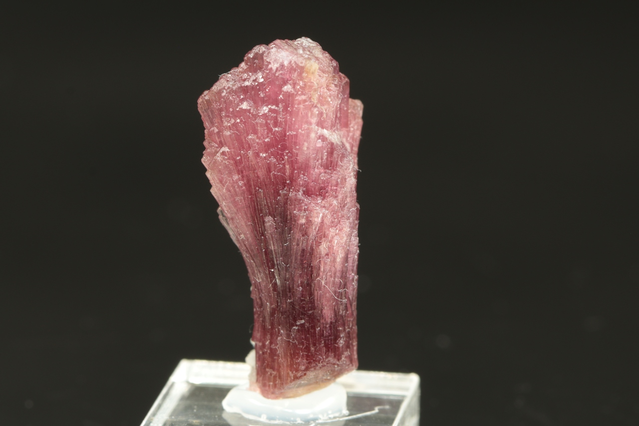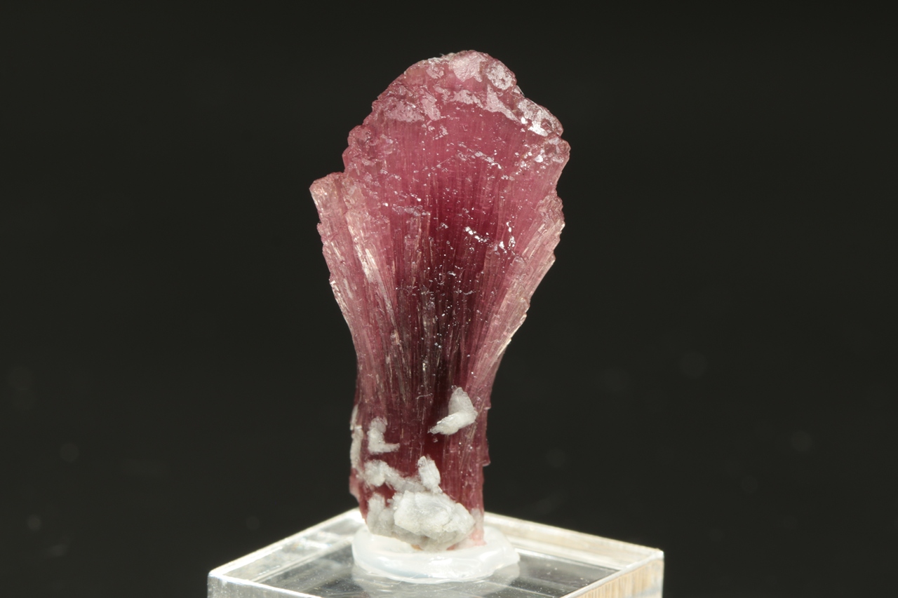 Krystal červeného, tzv. houbového turmalínu s vějířovitě narostlým vrškem krystalu.