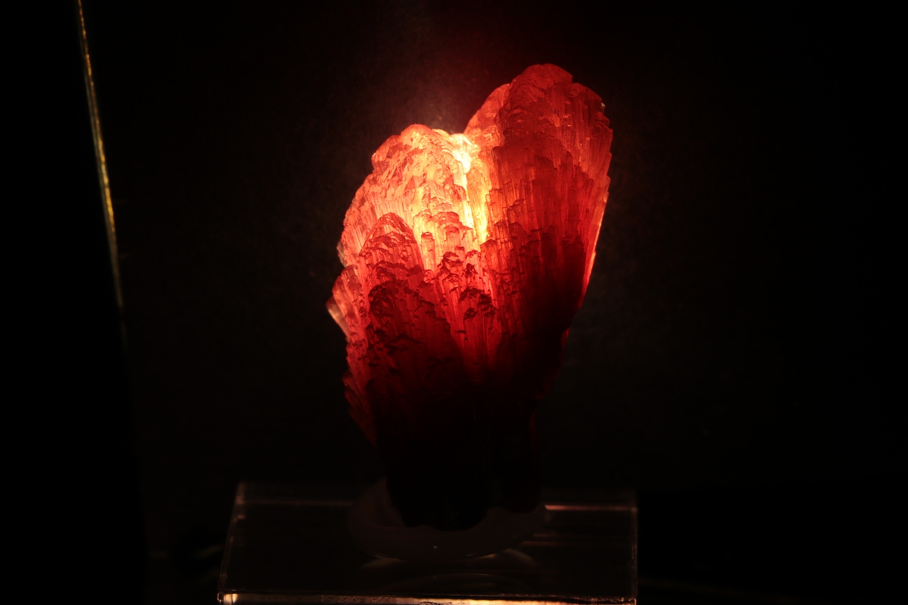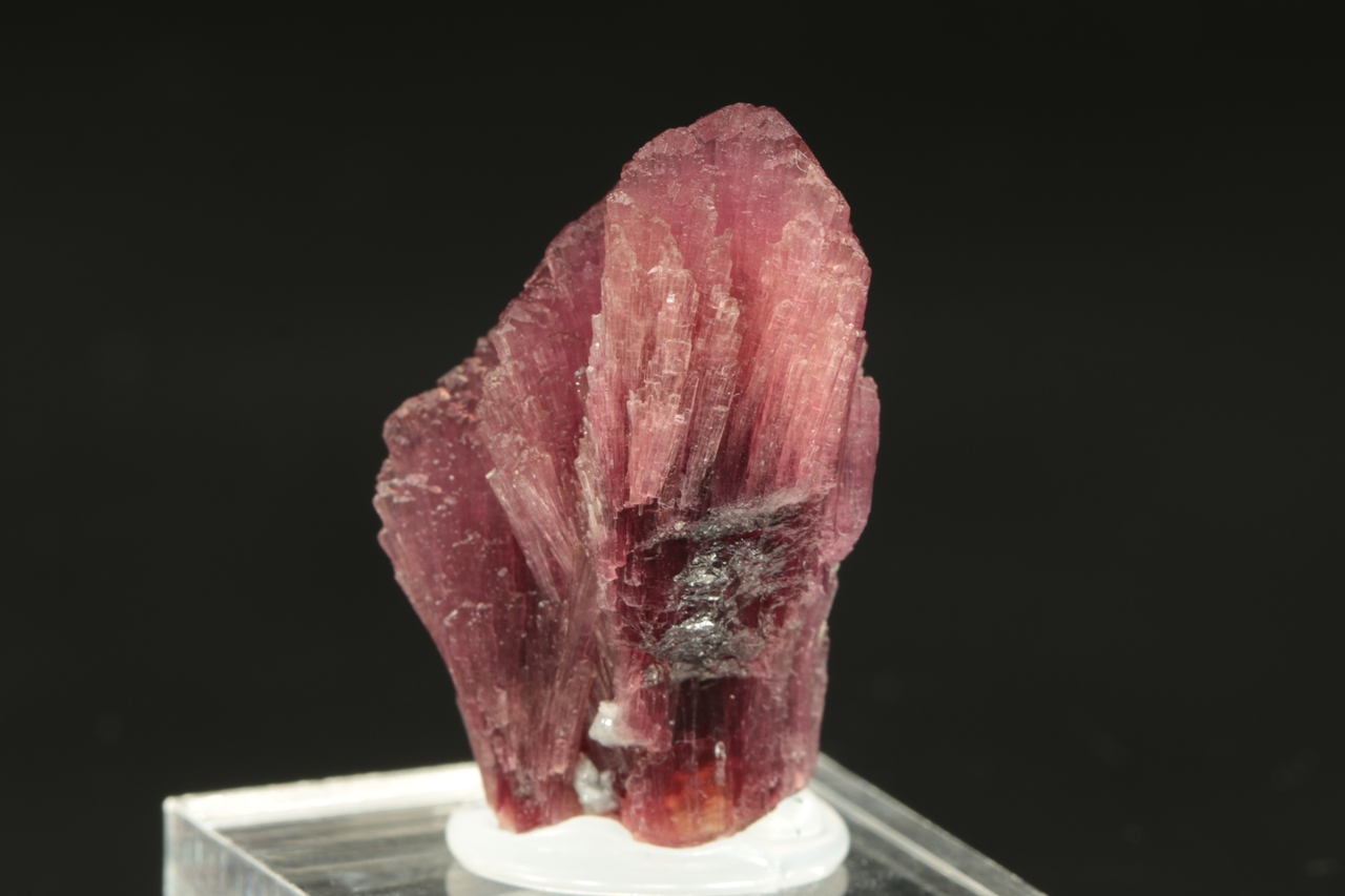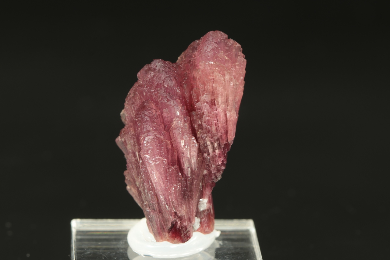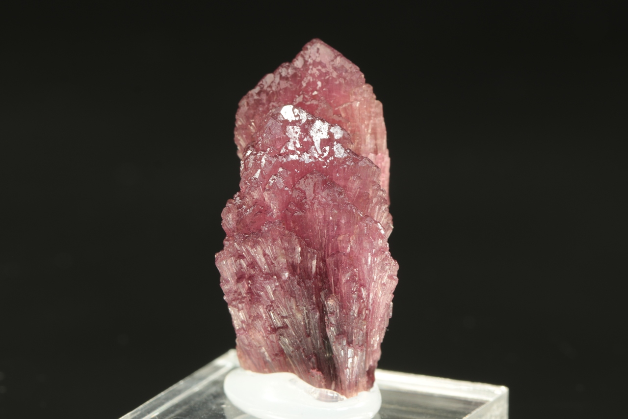 Srostlice tří krystalů červeného, tzv. houbového turmalínu s vějířovitě narostlými vršky krystalů.