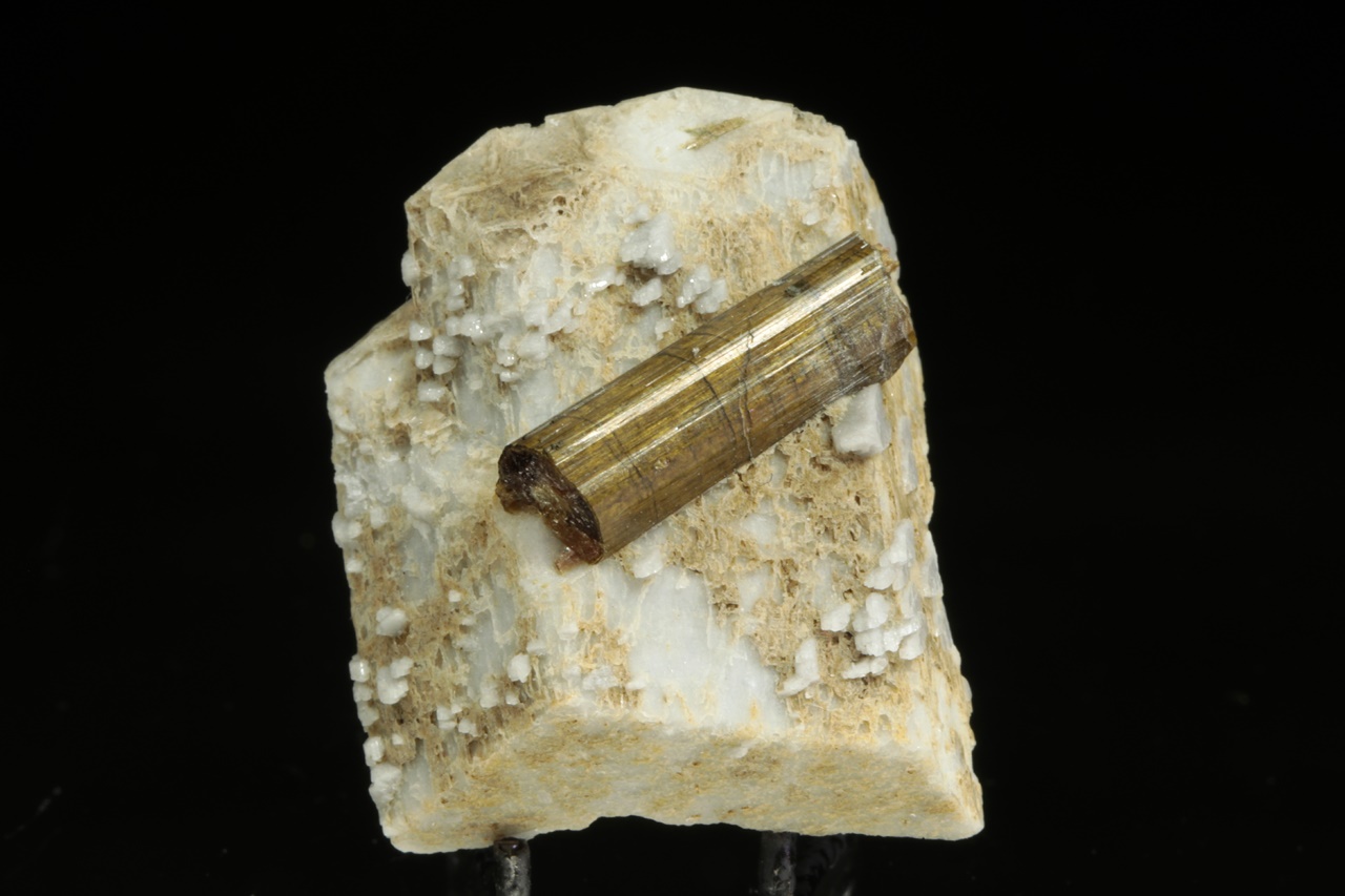 Ein zwei Zentimeter großer Säule aus braunem Turmalín gewachsen auf grauweißem Orthoklas.