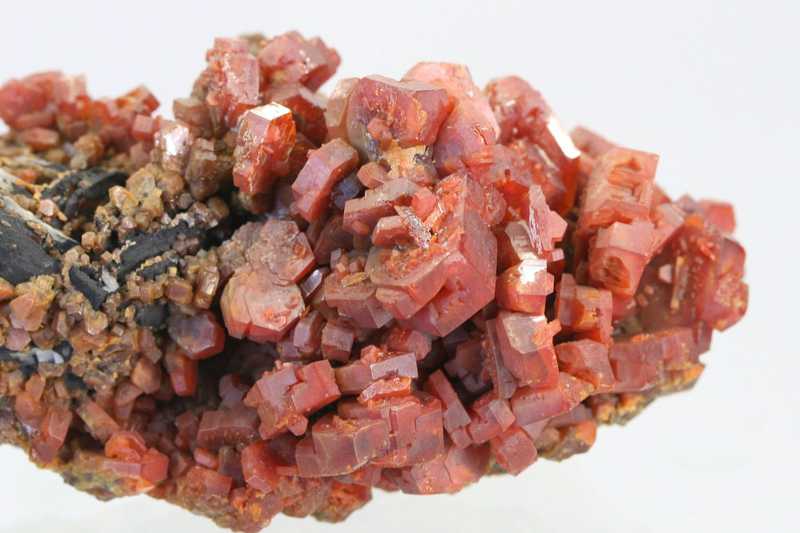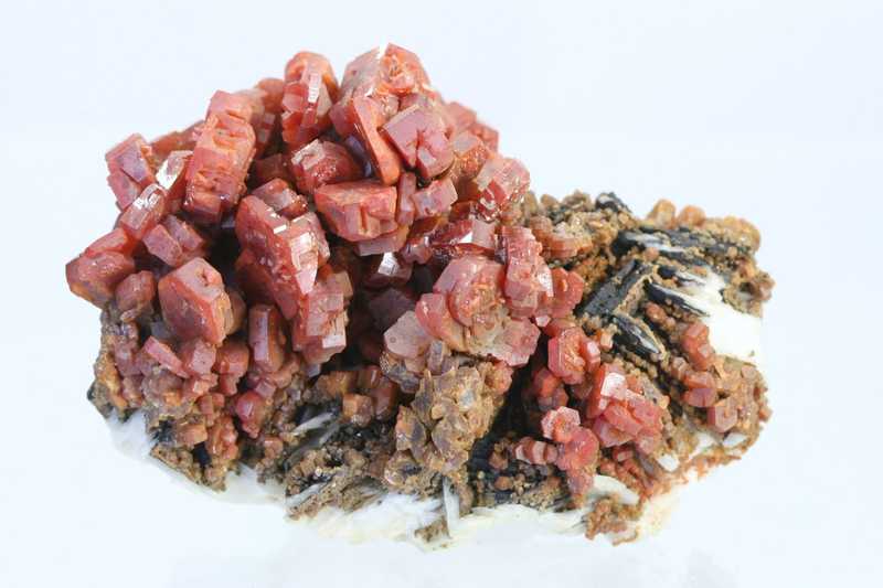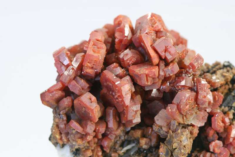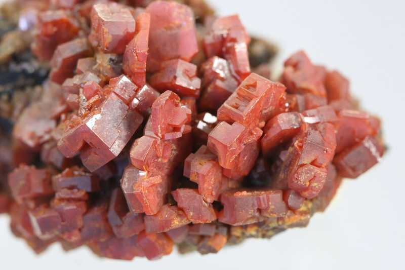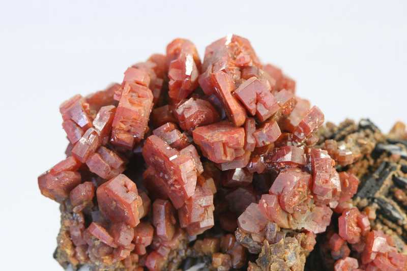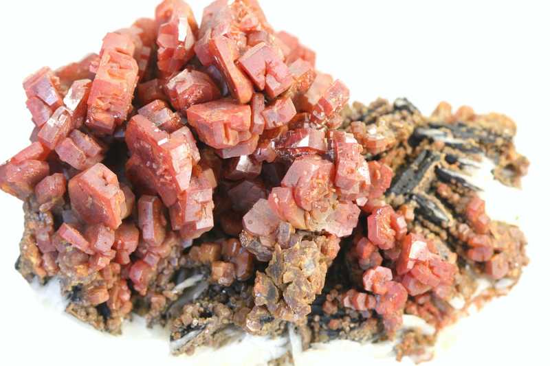 Sehr ästhetisches Exemplar von Vanadinit aus der klassischen Fundstätte Mibladen, Marokko. Eine reiche Druse von einzigartig großen Kristallen des roten Vanadinit.