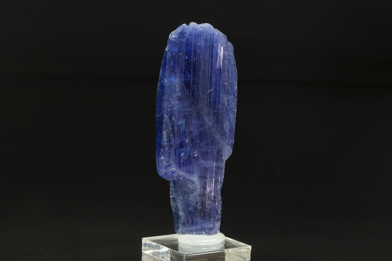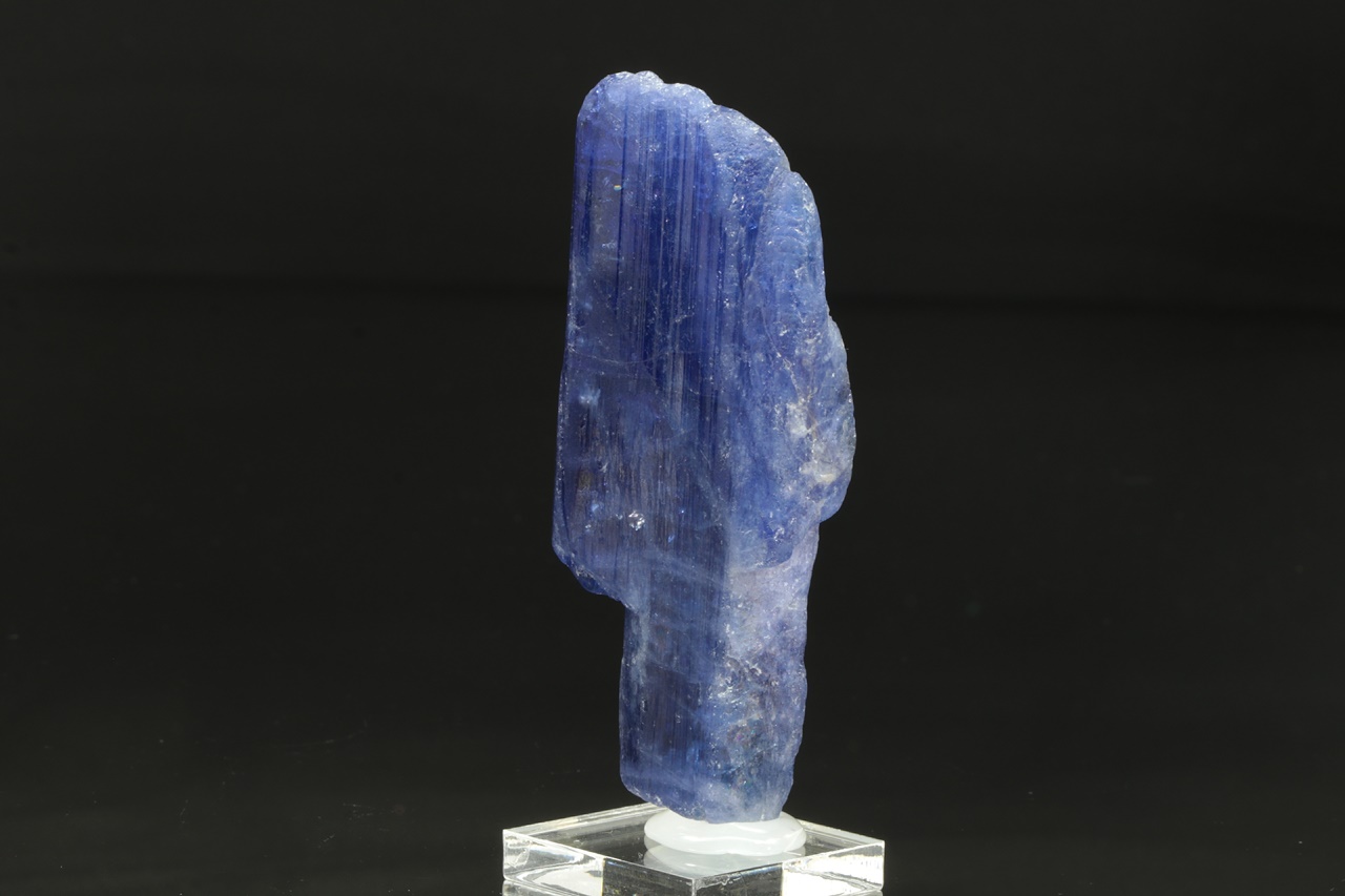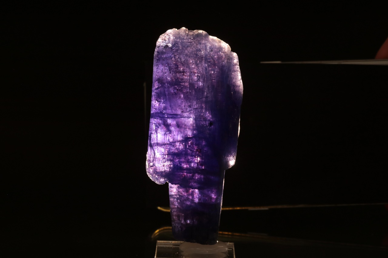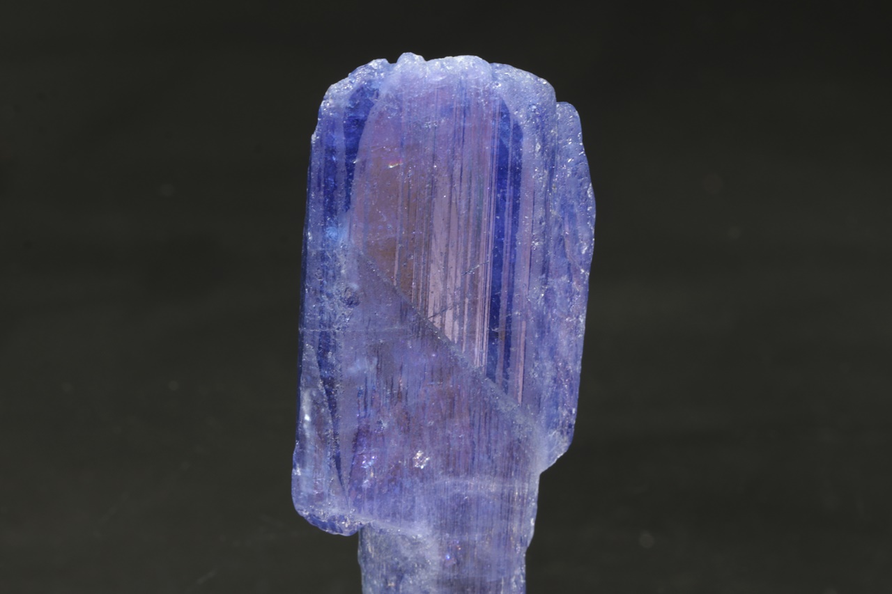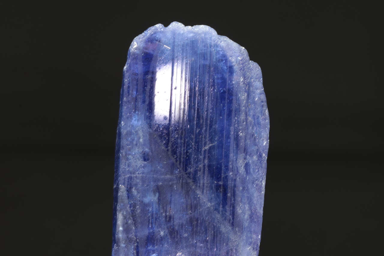 Osm centimerů velký krystal chrpově modrého, průsvitného tanzanitu z jediného známého naleziště. Krystal je ze přední strany ukončený krystalovými plochami.