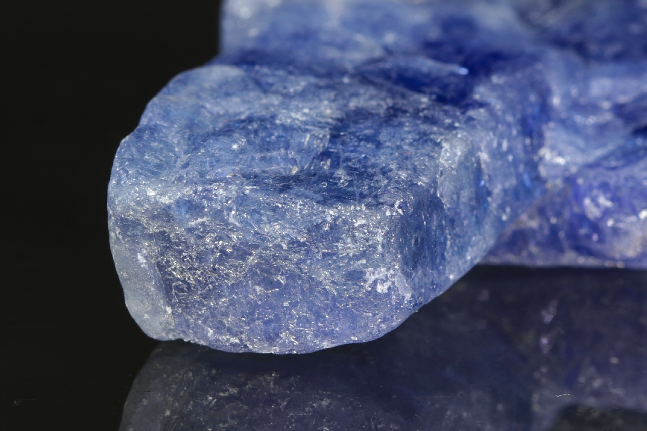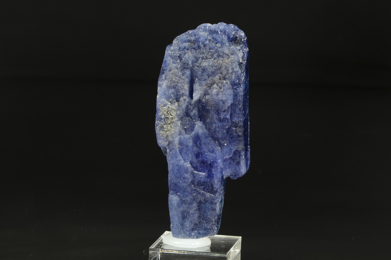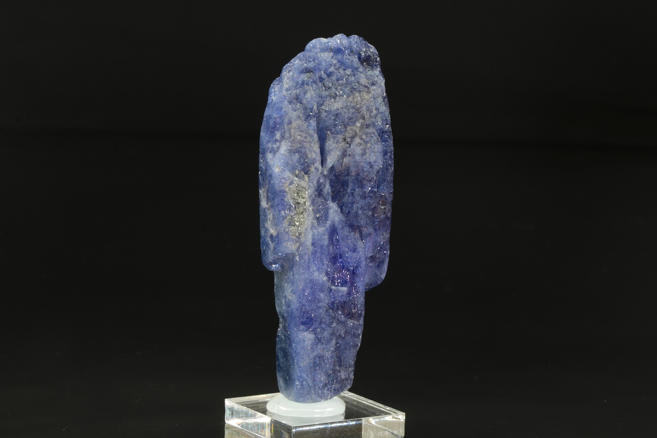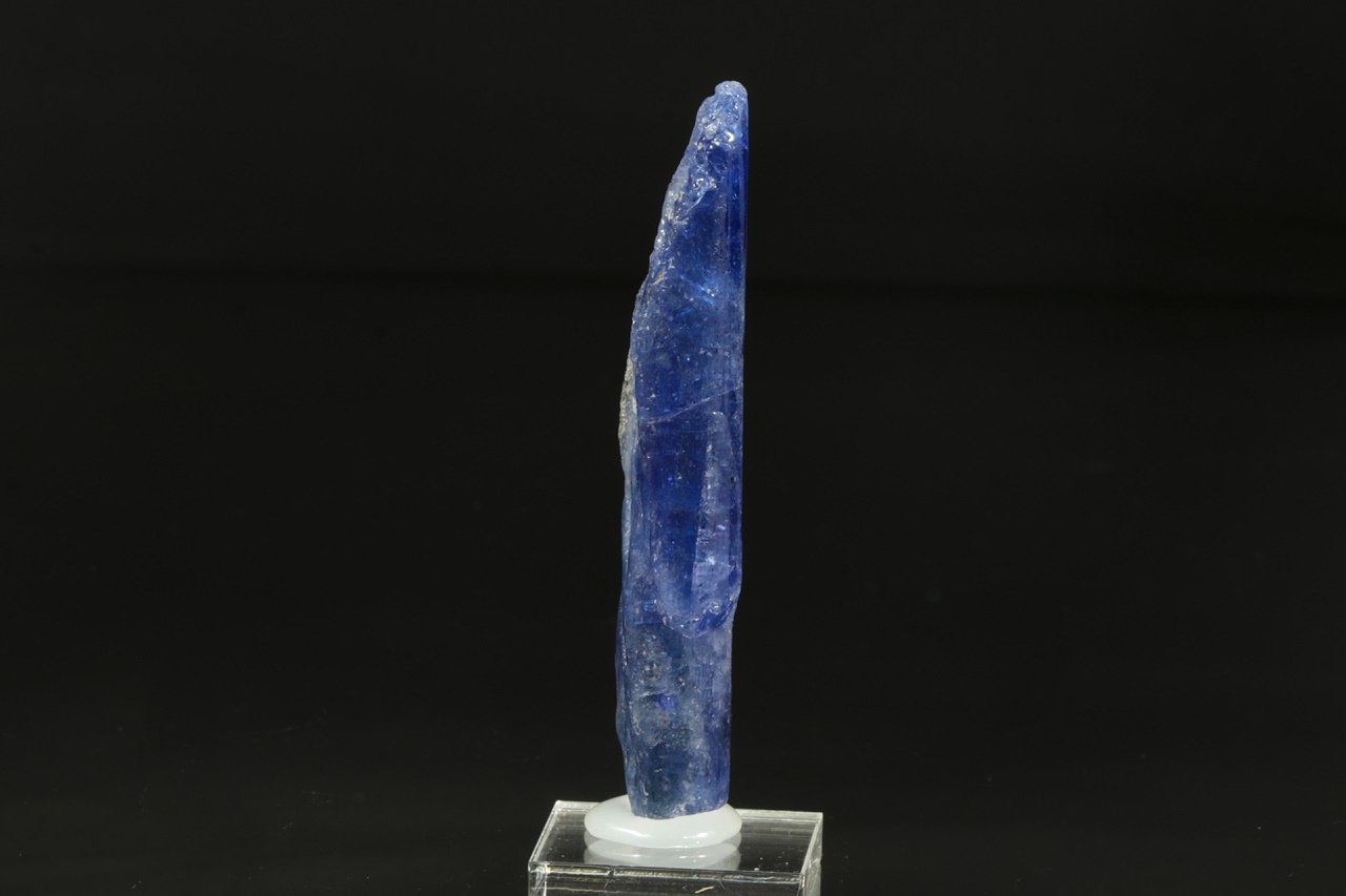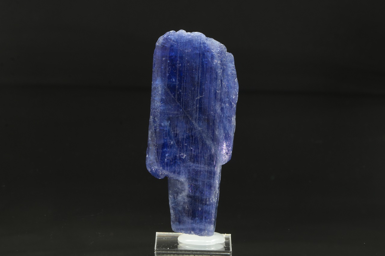 Osm centimerů velký krystal chrpově modrého, průsvitného tanzanitu z jediného známého naleziště. Krystal je ze přední strany ukončený krystalovými plochami.