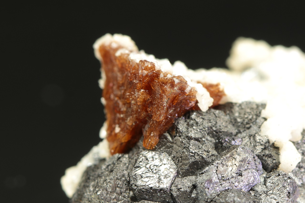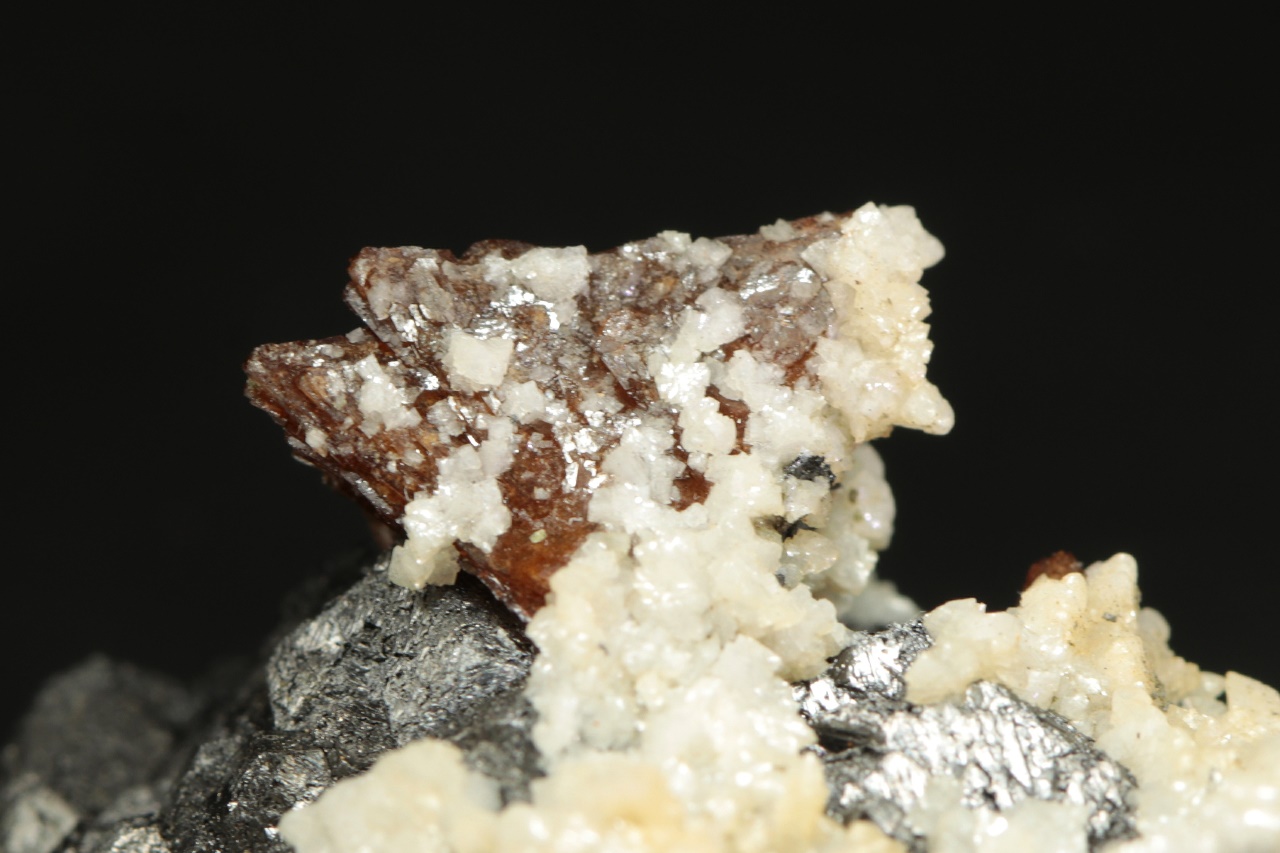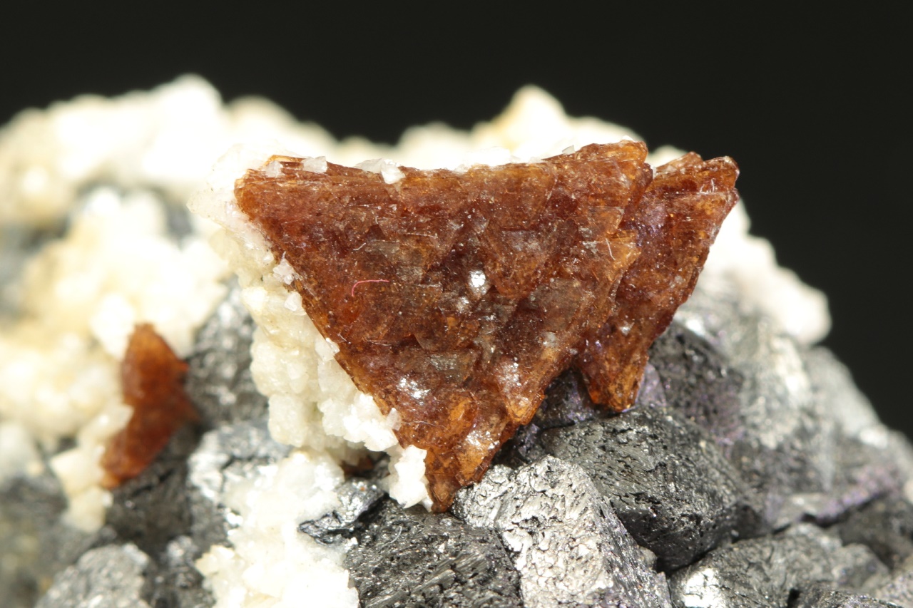 Dvanáct milimetrů velká hypopararelní srostlice tmavě hnědého helvínu narostlá na magnetitové položce. Vzorek pak pokrývají drobné krystaly bílého dolomitu.