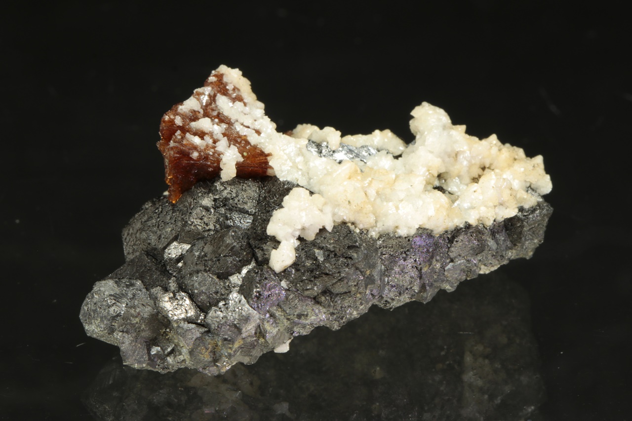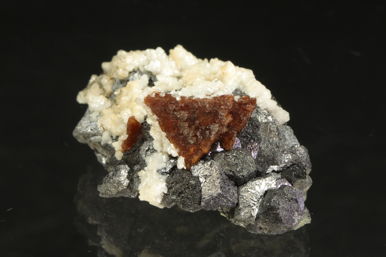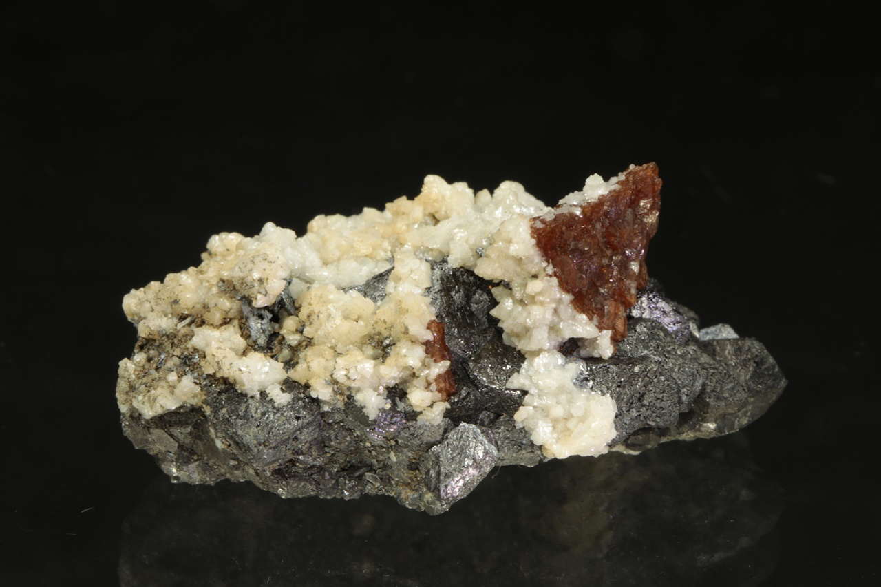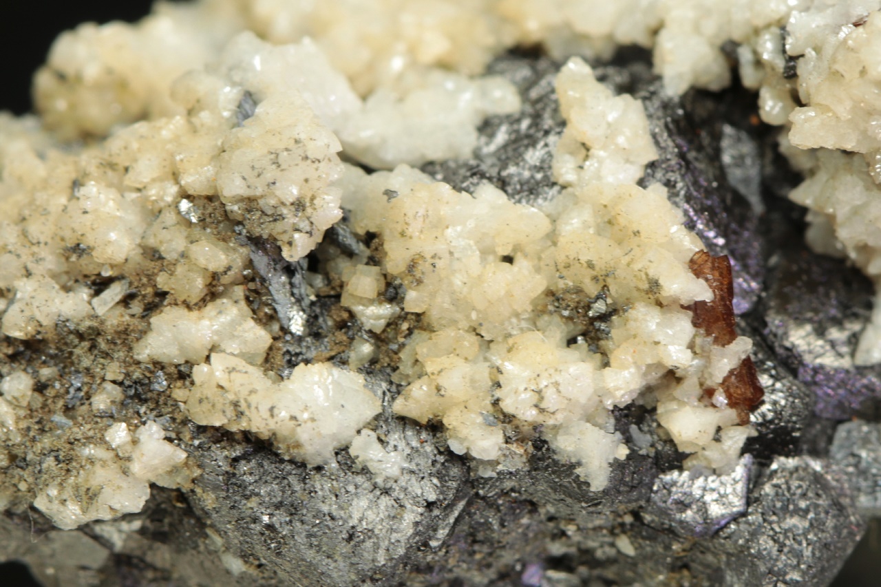 Dvanáct milimetrů velká hypopararelní srostlice tmavě hnědého helvínu narostlá na magnetitové položce. Vzorek pak pokrývají drobné krystaly bílého dolomitu.