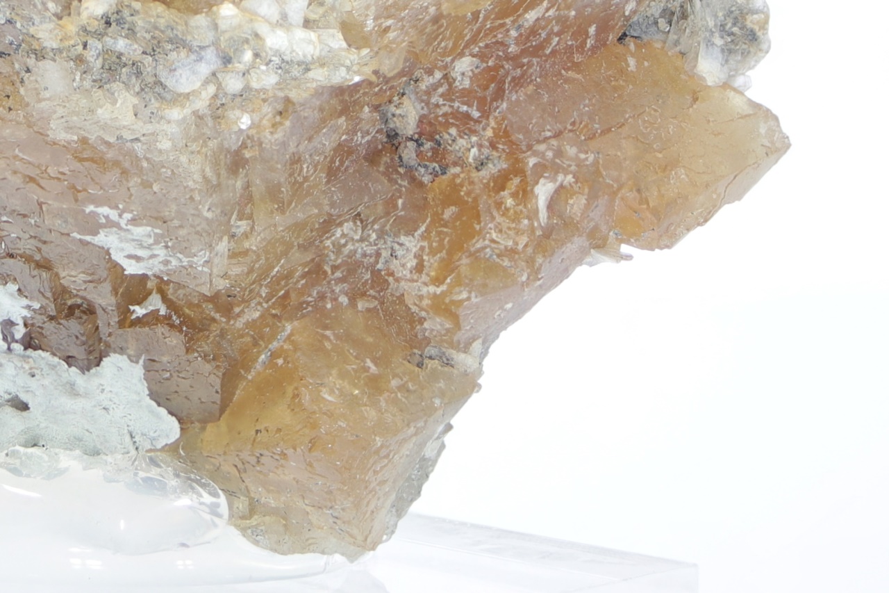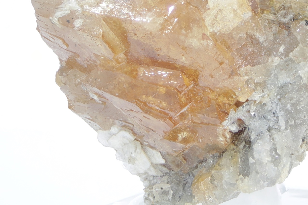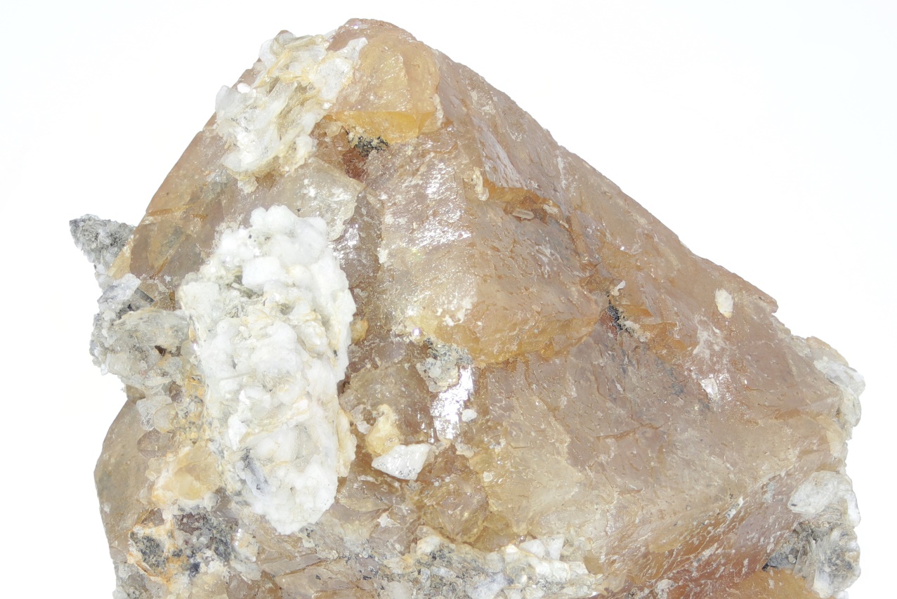 Wunderschöner großer Kristall von honiggelbem Scheelit, stellenweise mit blättrigem Muskovit bewachsen.