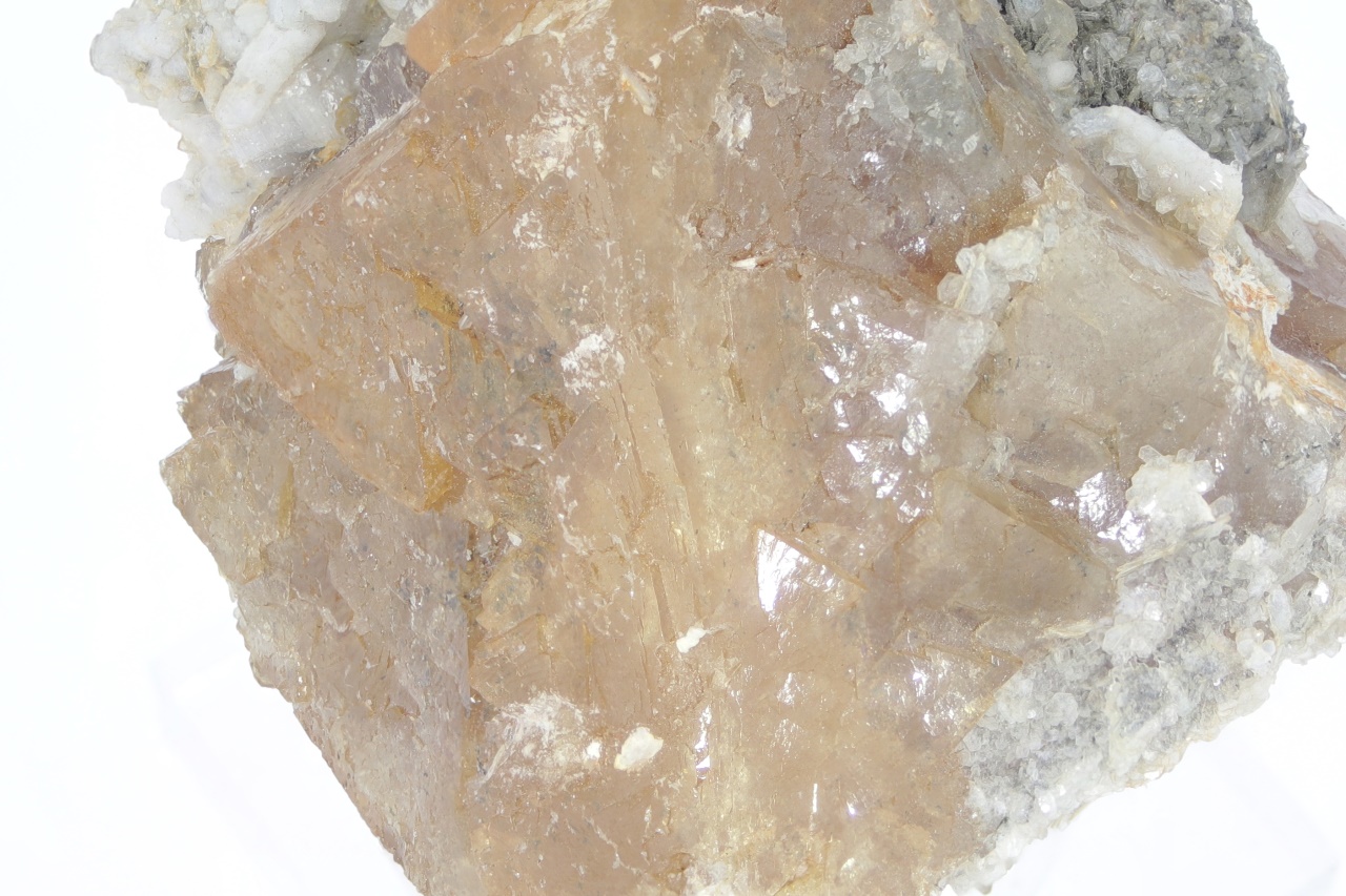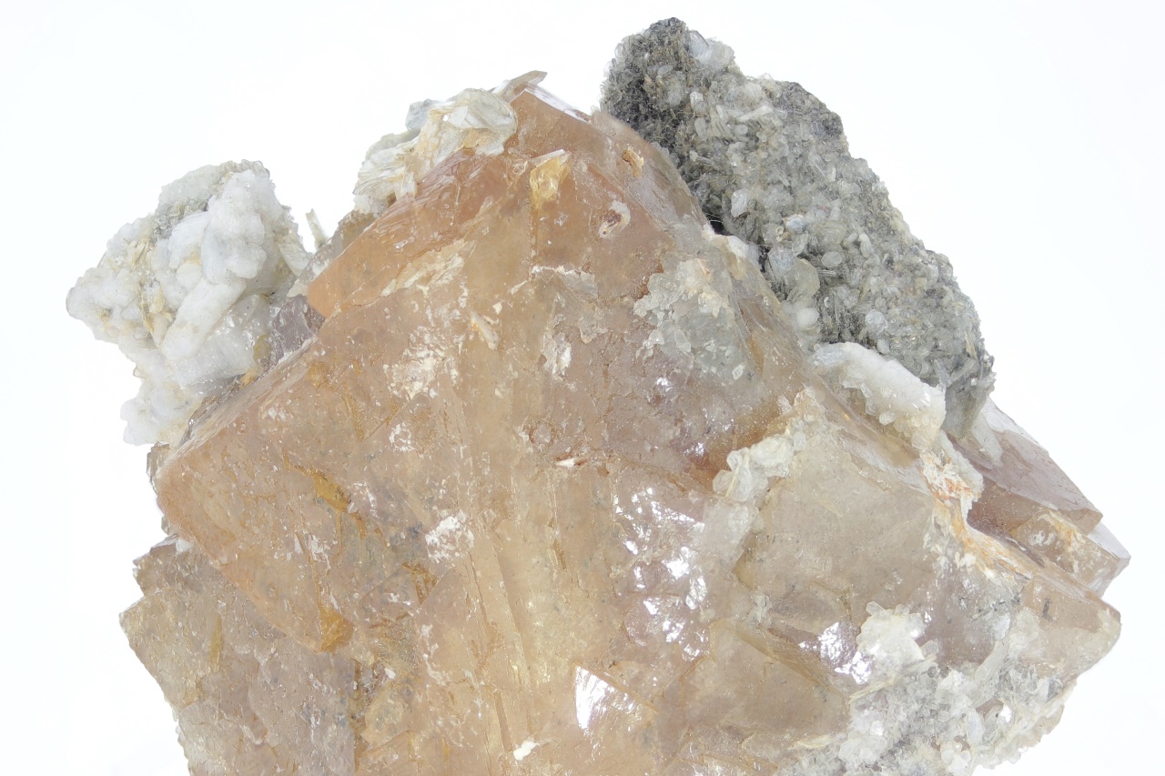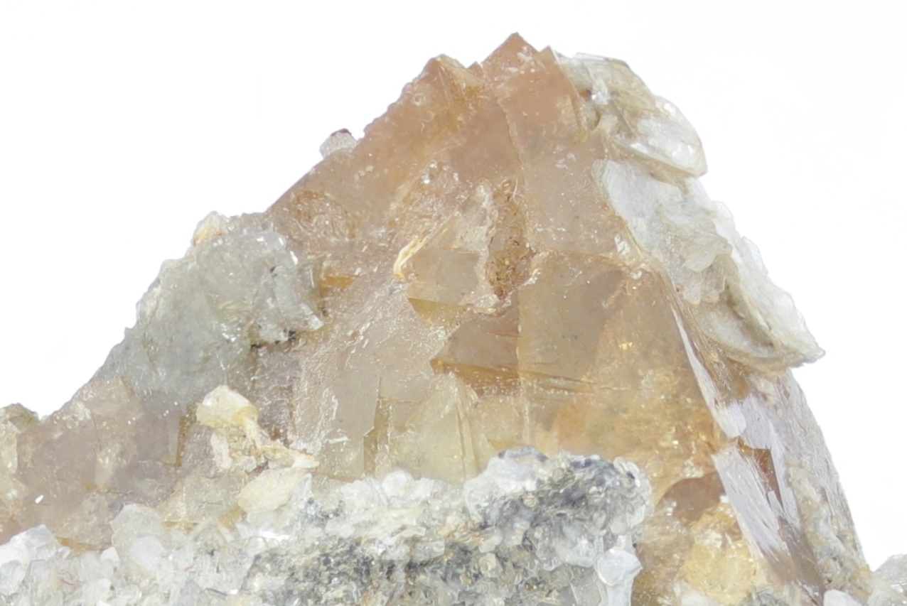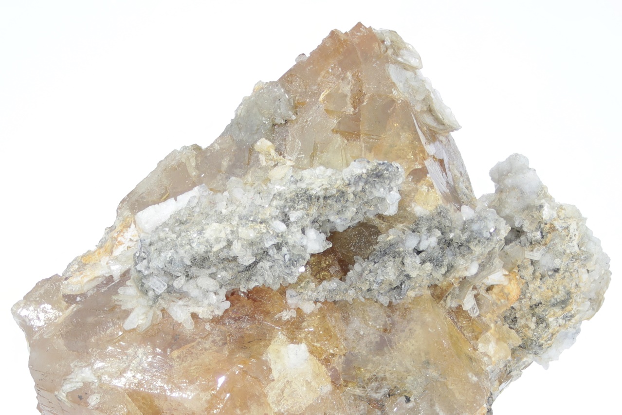 Wunderschöner großer Kristall von honiggelbem Scheelit, stellenweise mit blättrigem Muskovit bewachsen.