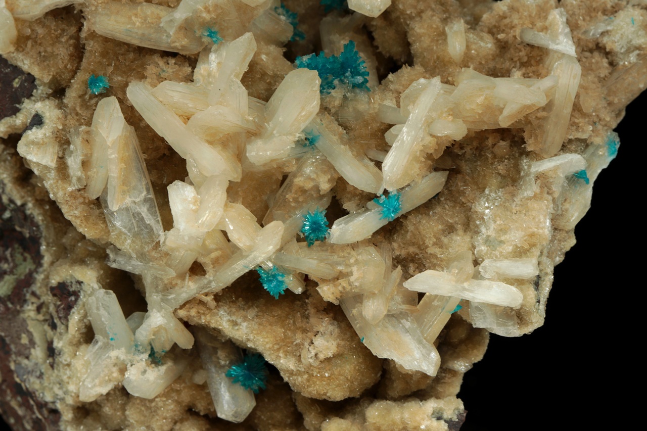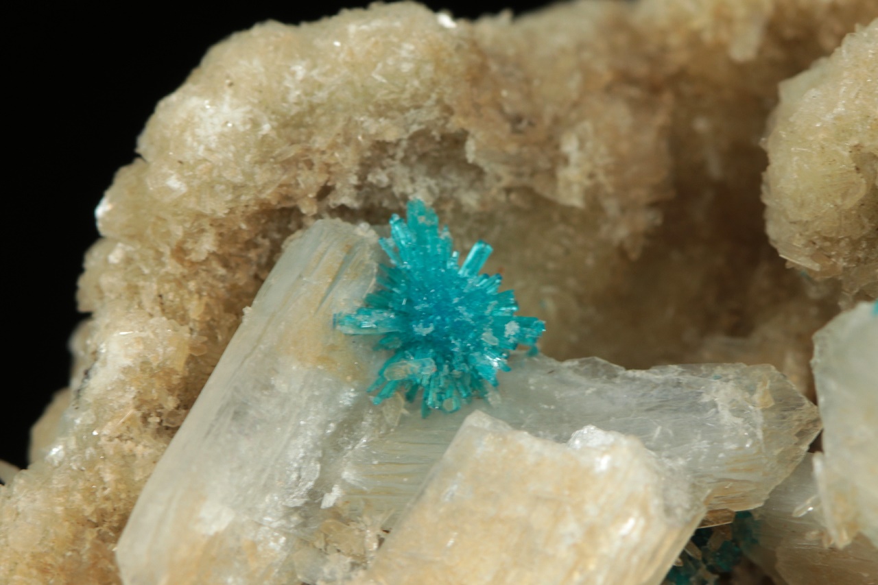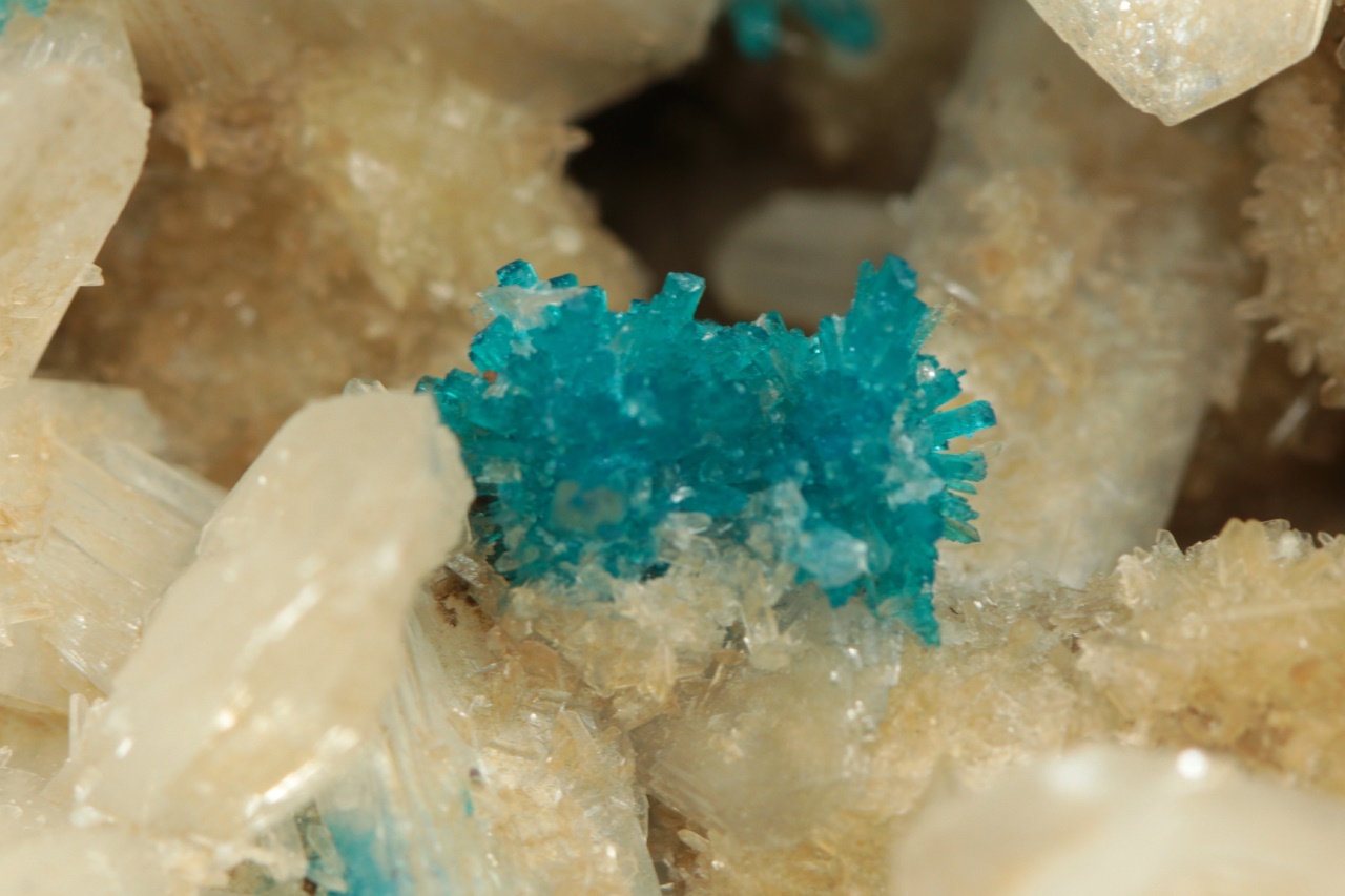 Keříky nádherně modrého cavansitu narostlé na světle béžovém stilbitu. Největší agregát cavansitu je 8 mm velký.