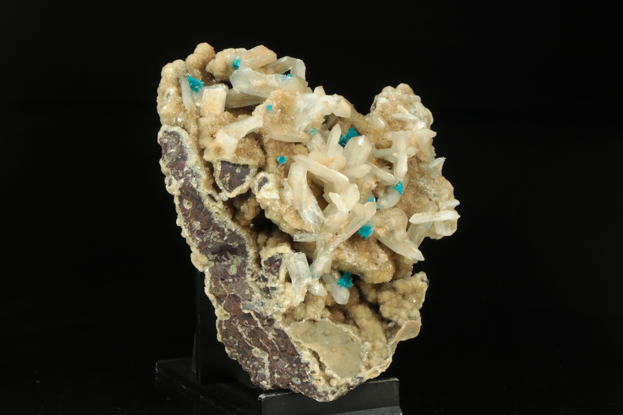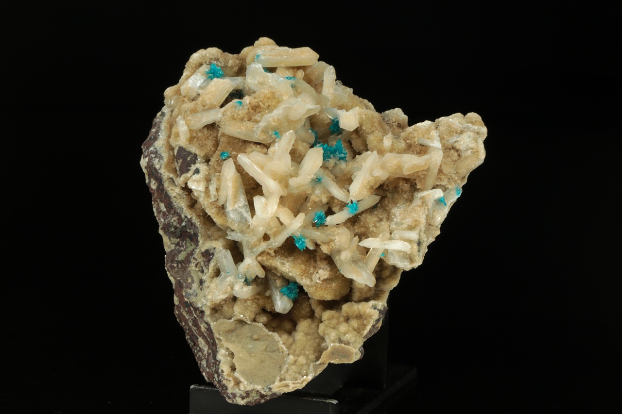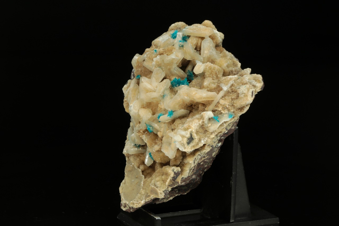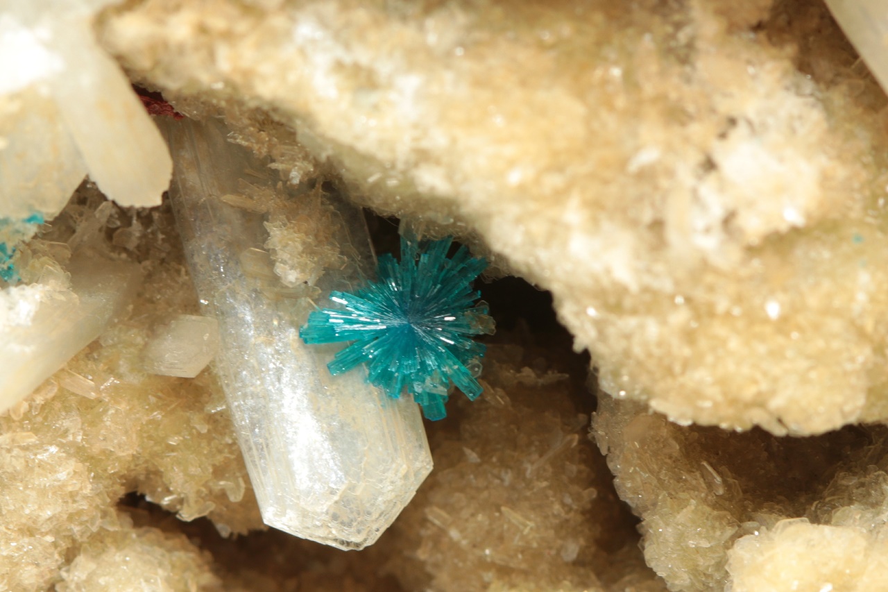 Keříky nádherně modrého cavansitu narostlé na světle béžovém stilbitu. Největší agregát cavansitu je 8 mm velký.