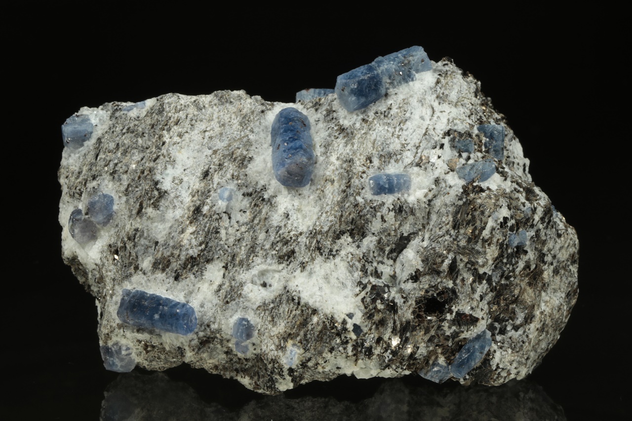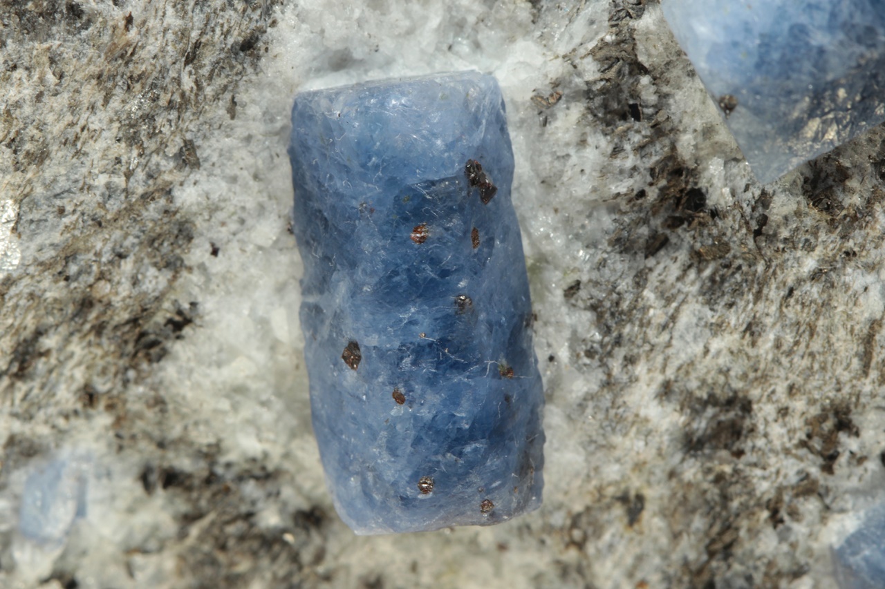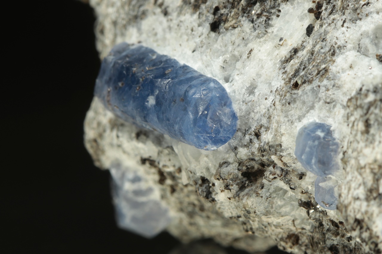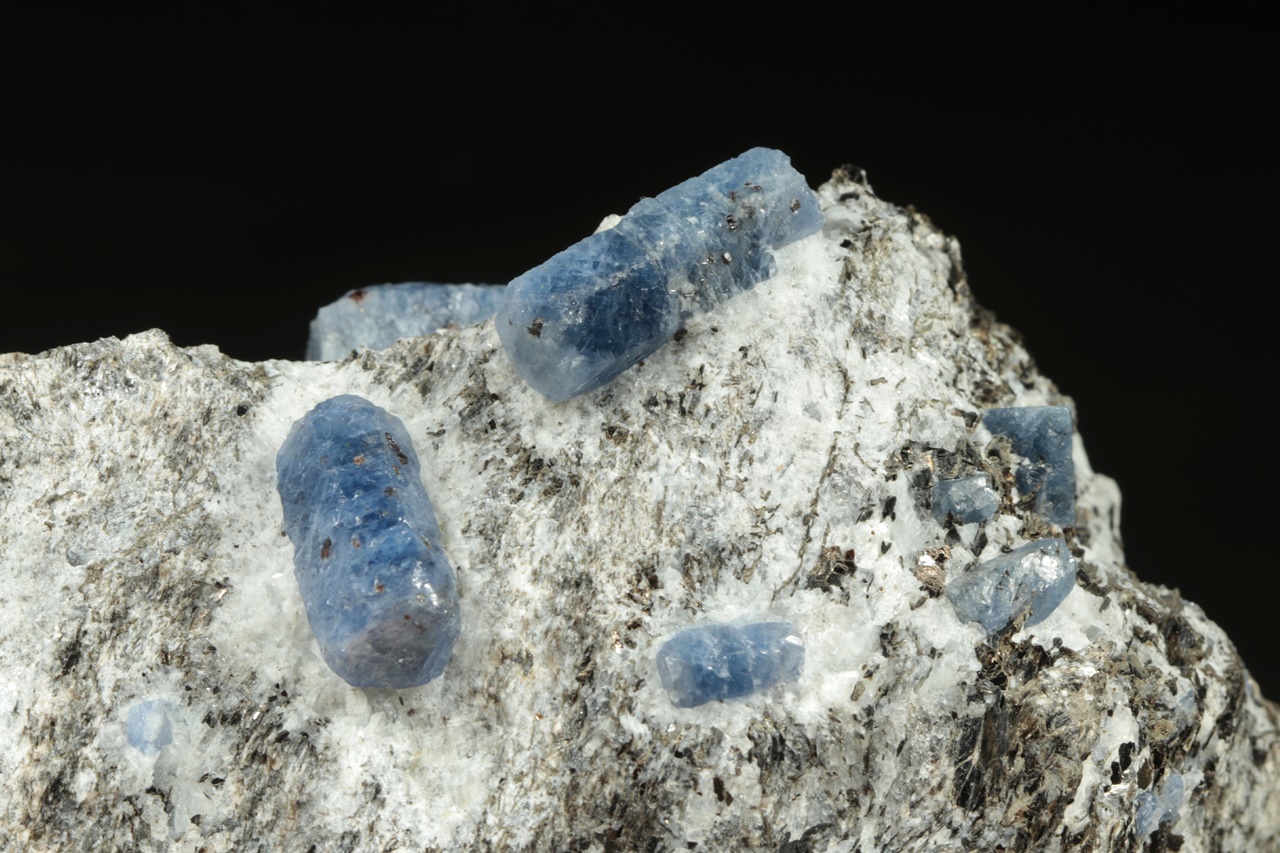 Sloupcovité, dobře omezené krystaly modrého safíru bohatě narostlé v mateční hornině. Největší krystal je 18 mm velký.