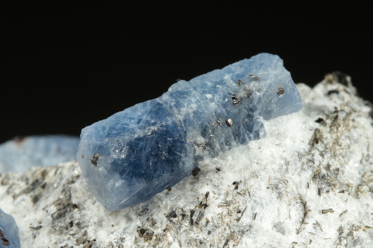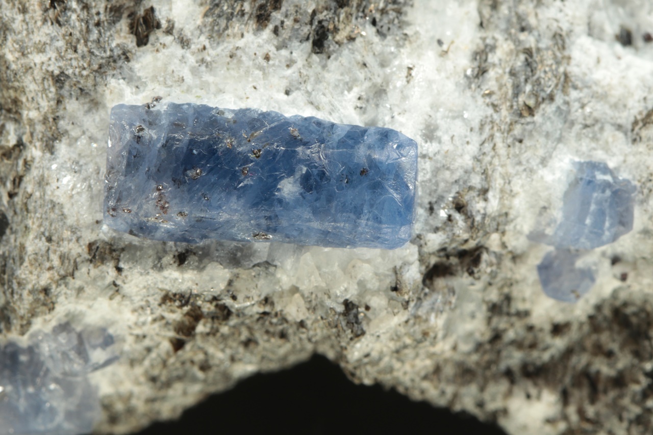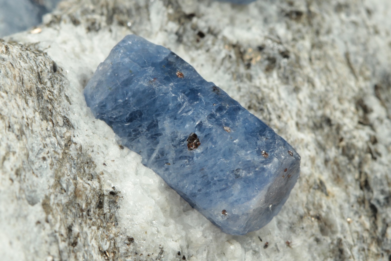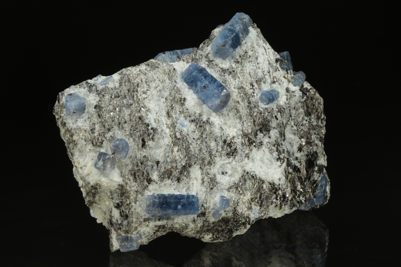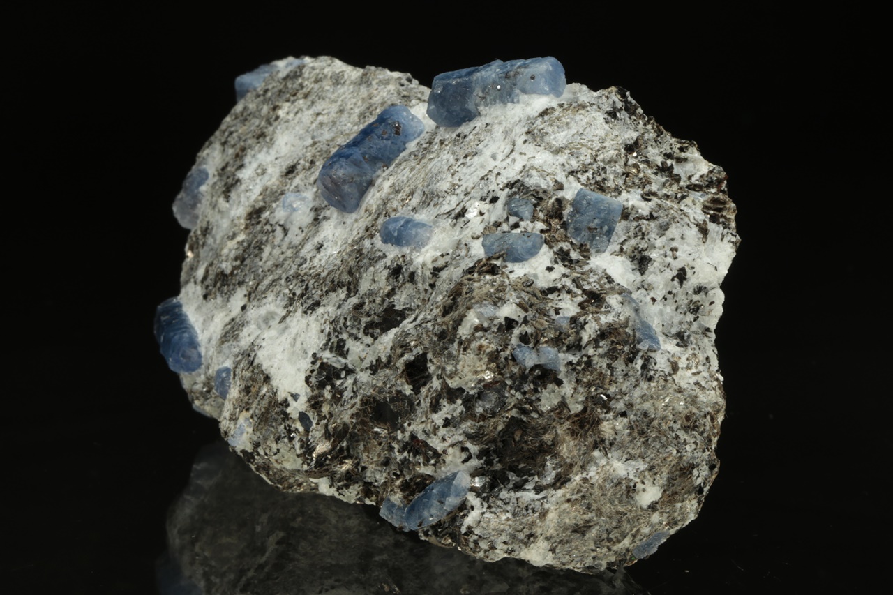 Sloupcovité, dobře omezené krystaly modrého safíru bohatě narostlé v mateční hornině. Největší krystal je 18 mm velký.