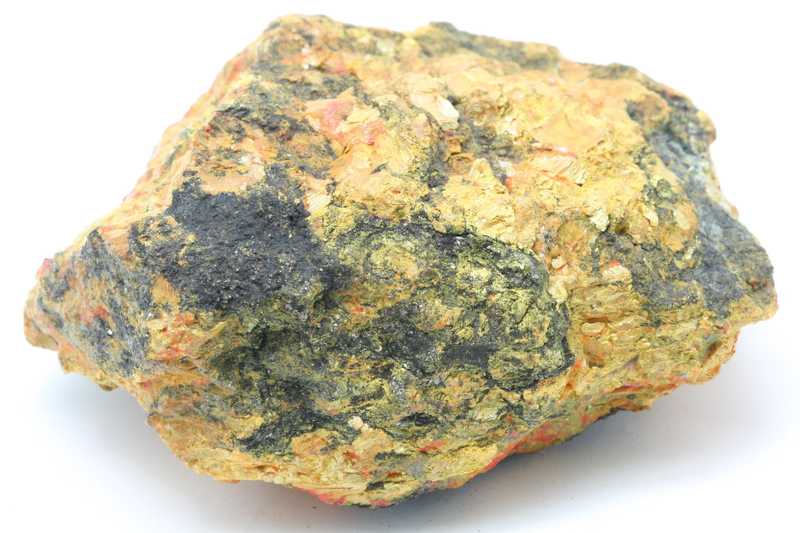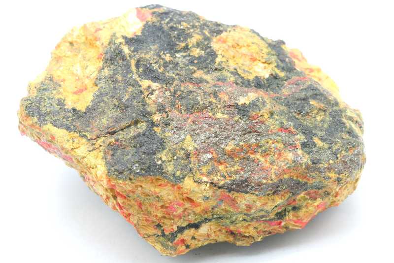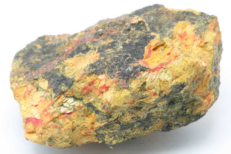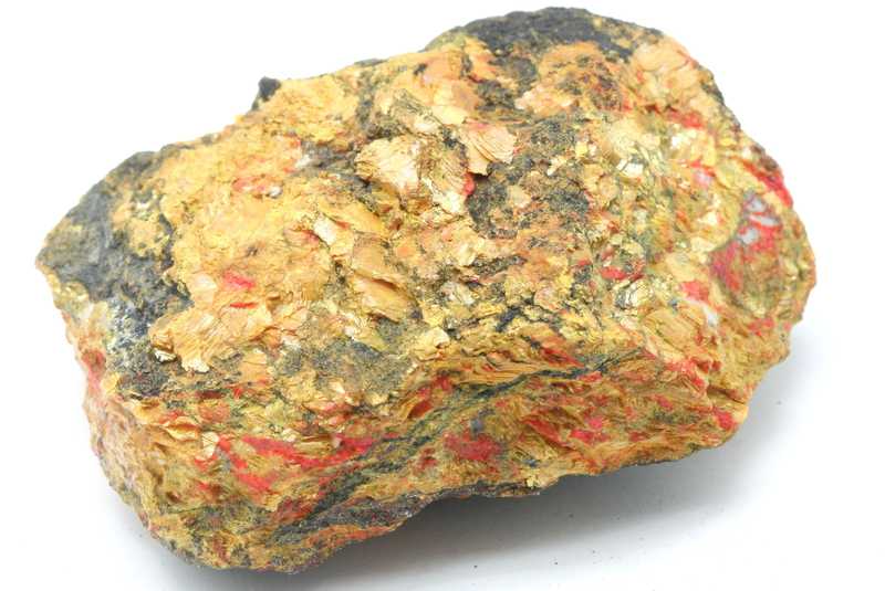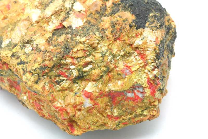 Schöne farbige Stufe von Auripigment mit Realgar. Probe von gelbem Auripigment mit Aggregaten von orangem Realgar .