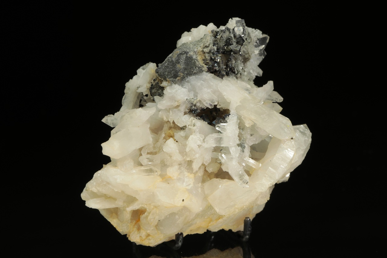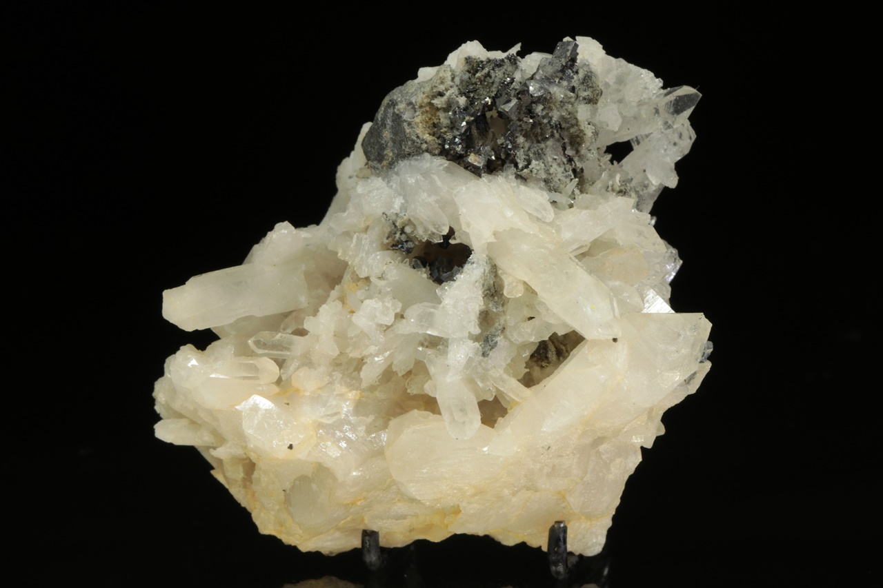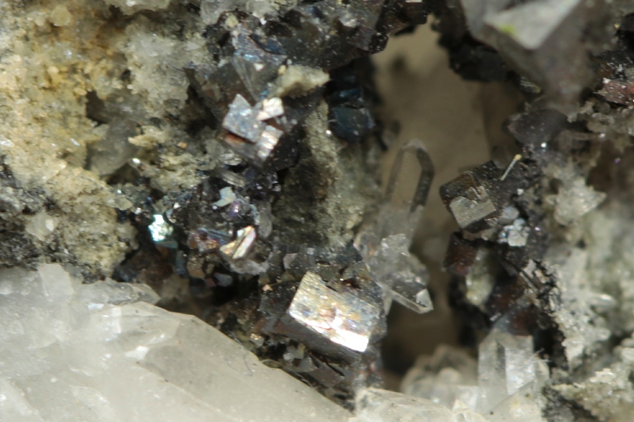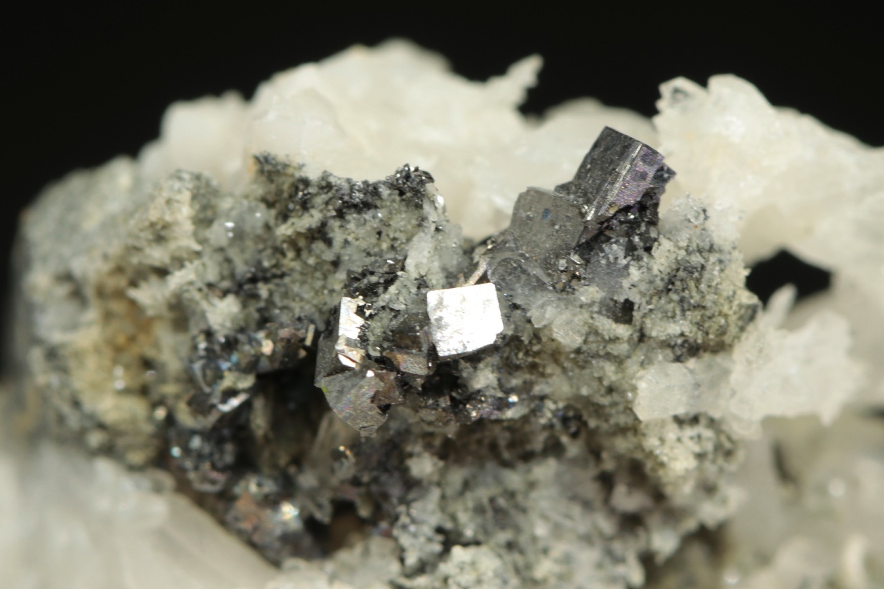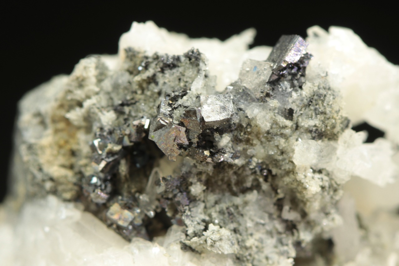 Historický vzorek kovově lesklých krystalů sulfidu antimonu a niklu – ullmannitu narostlé na bílém křemeni. Největší krystal ullmanitu je necelé 2 mm velký.