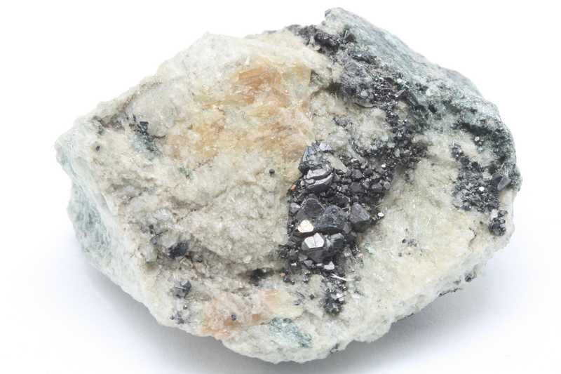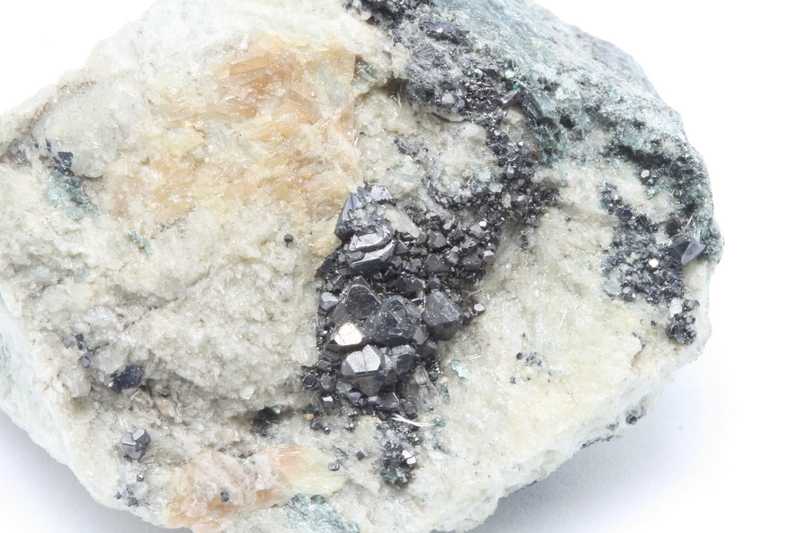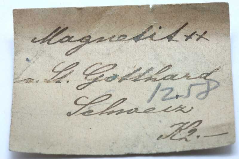 Schöne Probe von Magnetit mit historischem Etikett aus der Lokalität St. Gotthard, Schweiz. Ein schönes Beispiel für kleine oktaedrische Magnetitkristalle mit einer Größe von bis zu 2 mm.