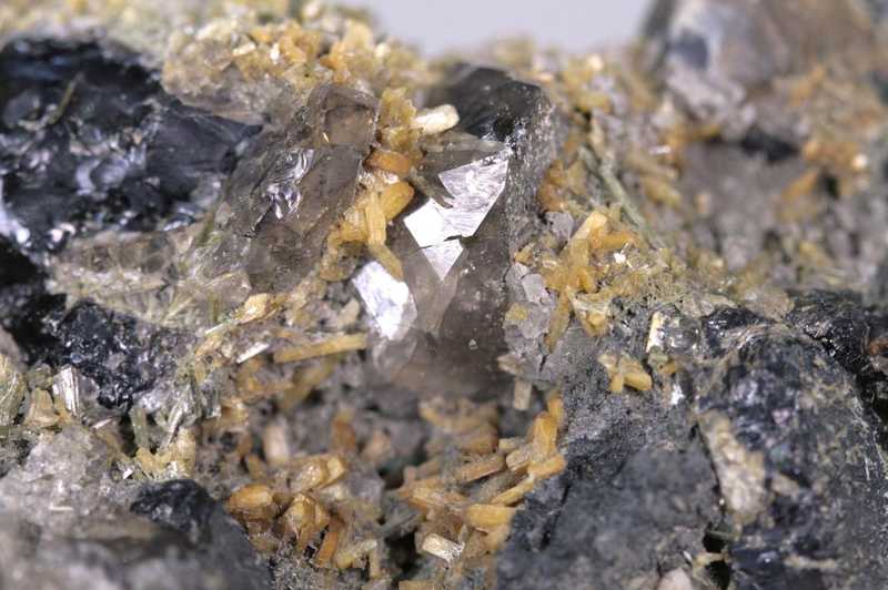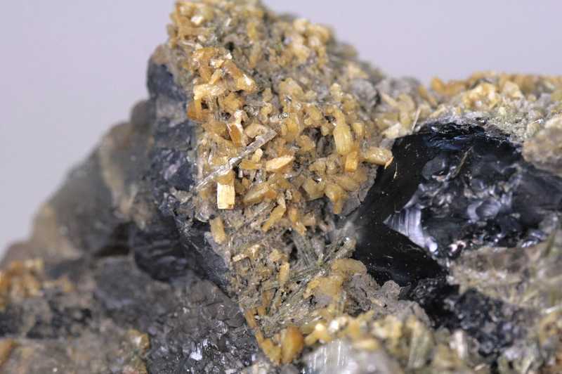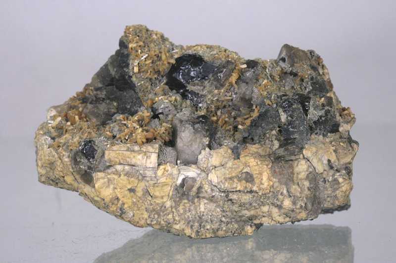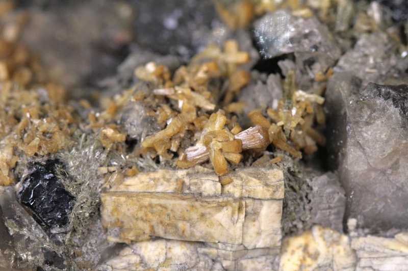 Ansprechendes Exemplar von Stilbit, Epidot und Záhněda-Kristallen aus dem polnischen Strzegom. Sehr schöne Probe einer Pegmatit-Höhle, gebildet aus Záhněda- bis Morion-Kristallen, die auf gelblichen Aggregaten von Stilbit-Kristallen und grünlichen dünnen Epidot-Kristallen aufwachsen.