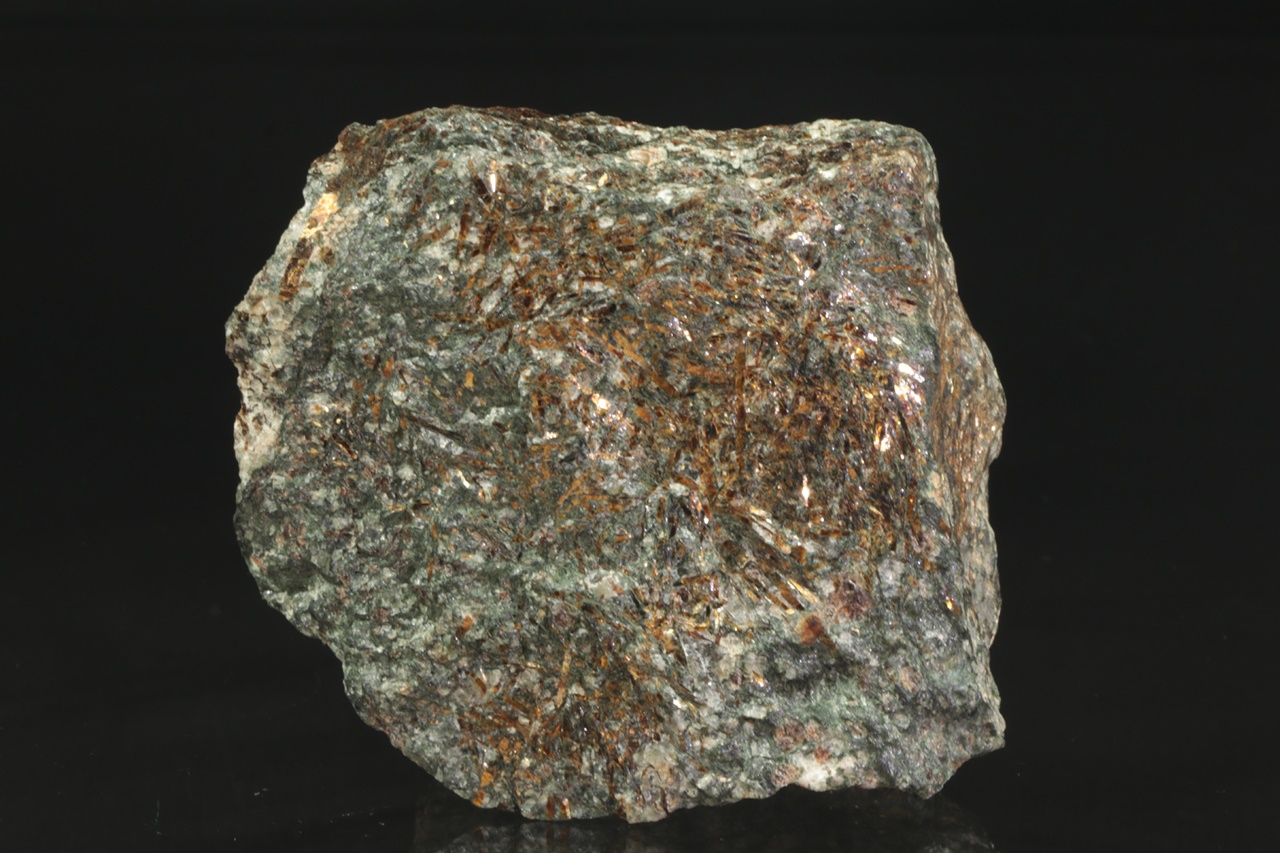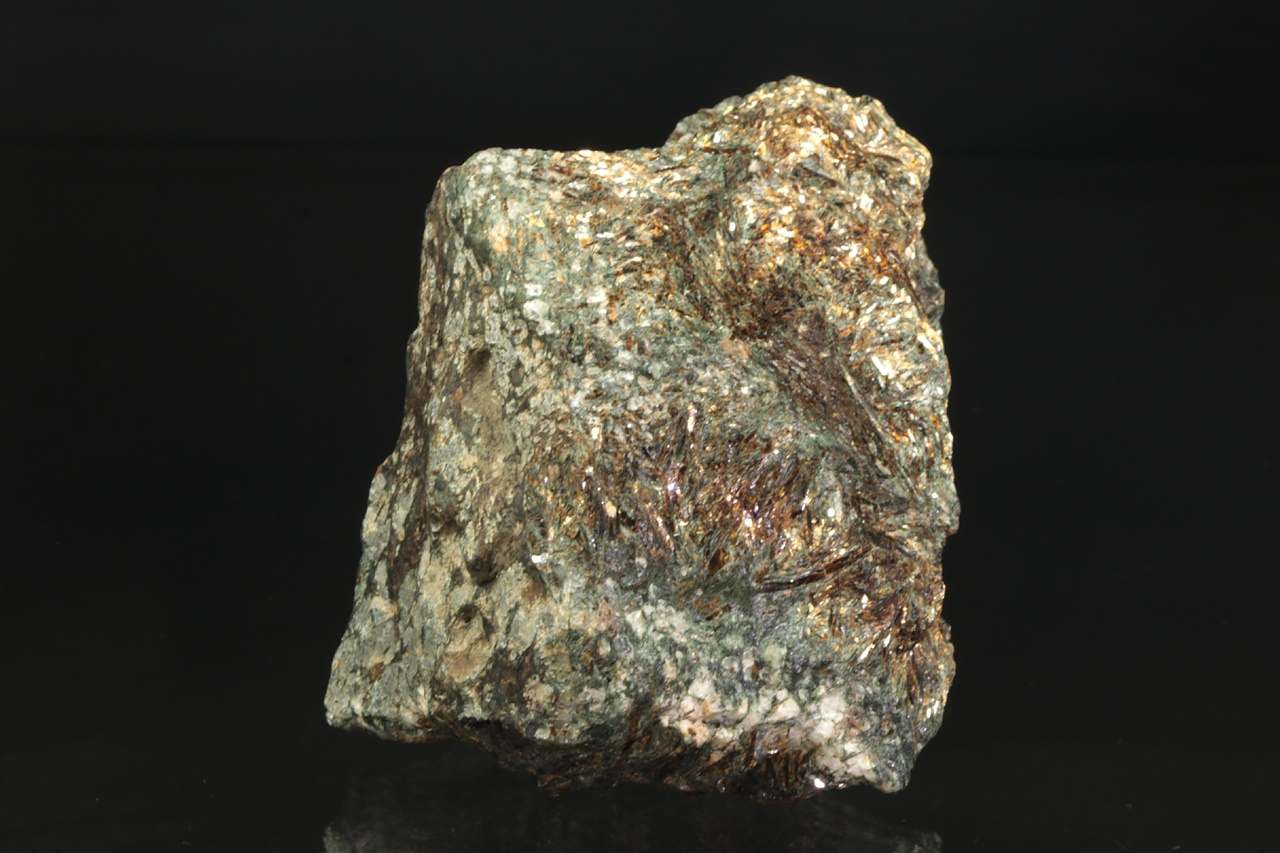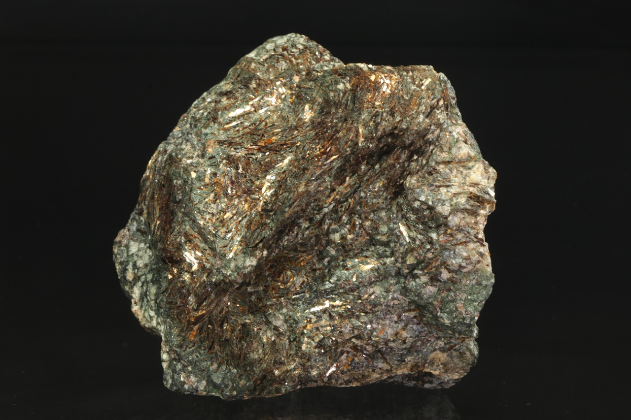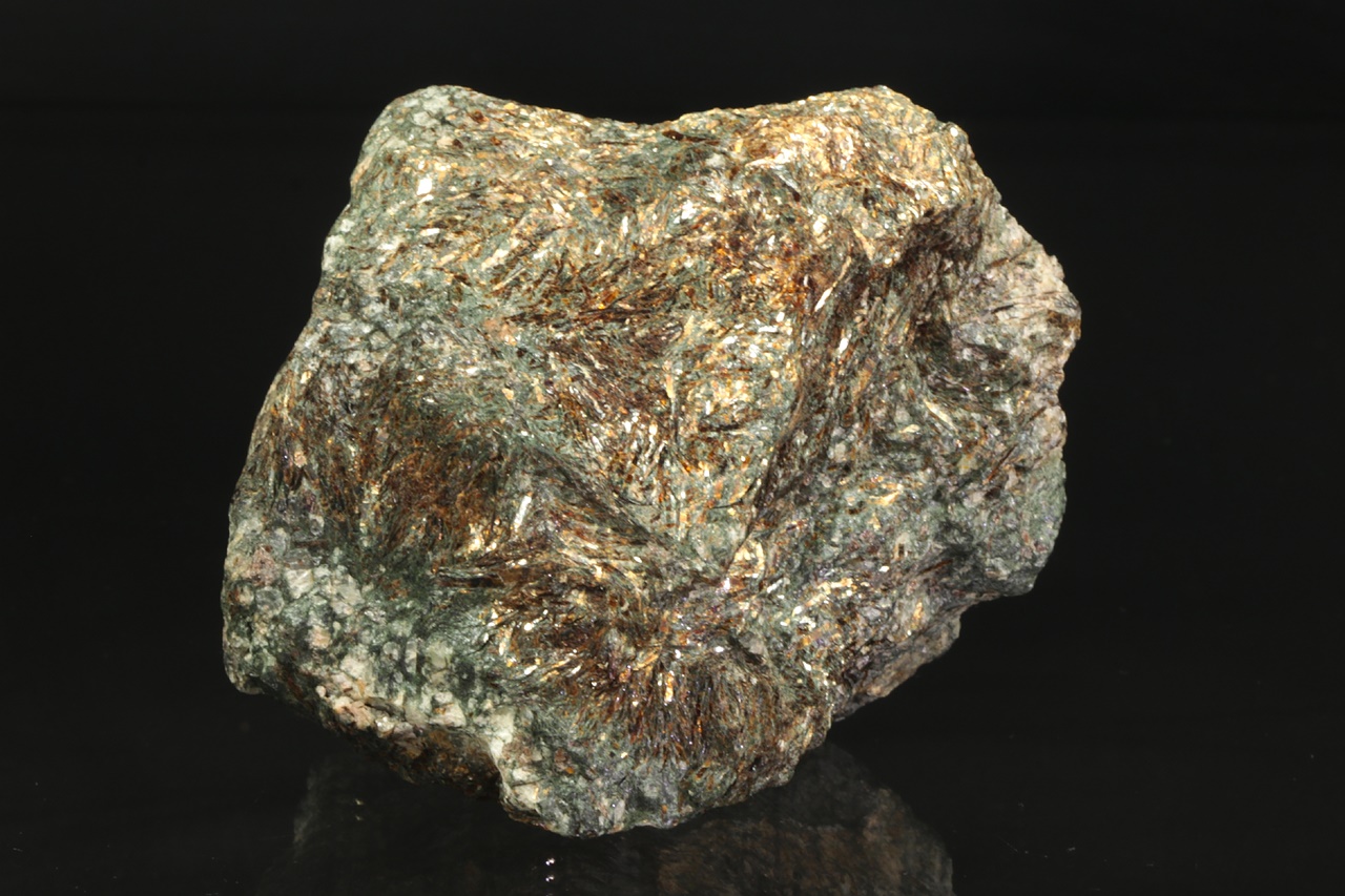 Bohatě narostlé lišty vzácného, bronzově lesklého astrofylitu až 1,5 cm.