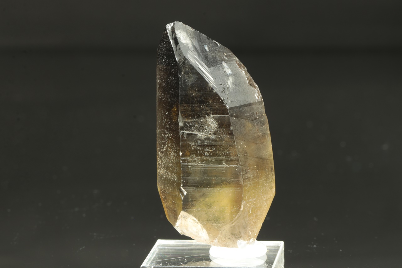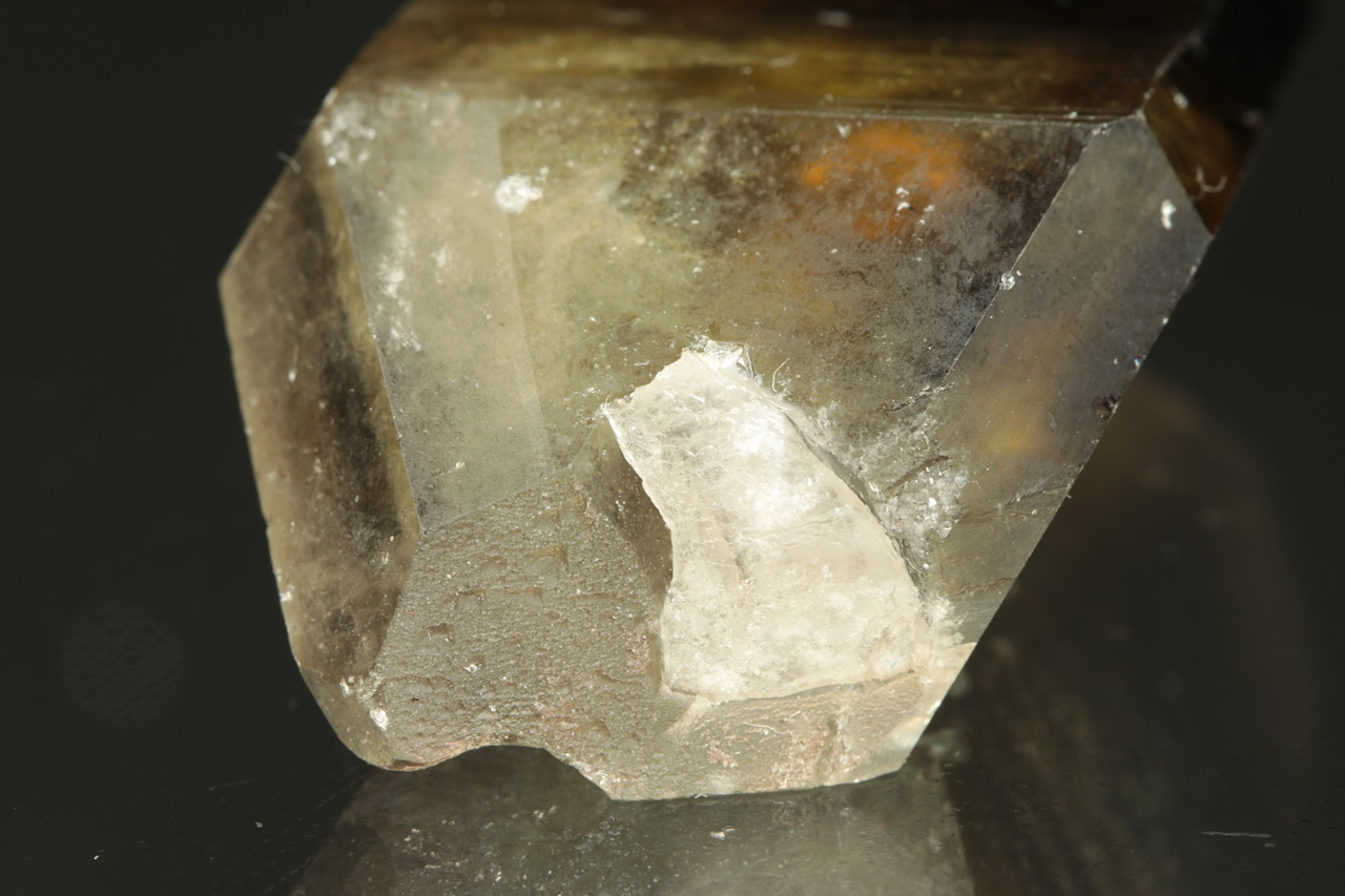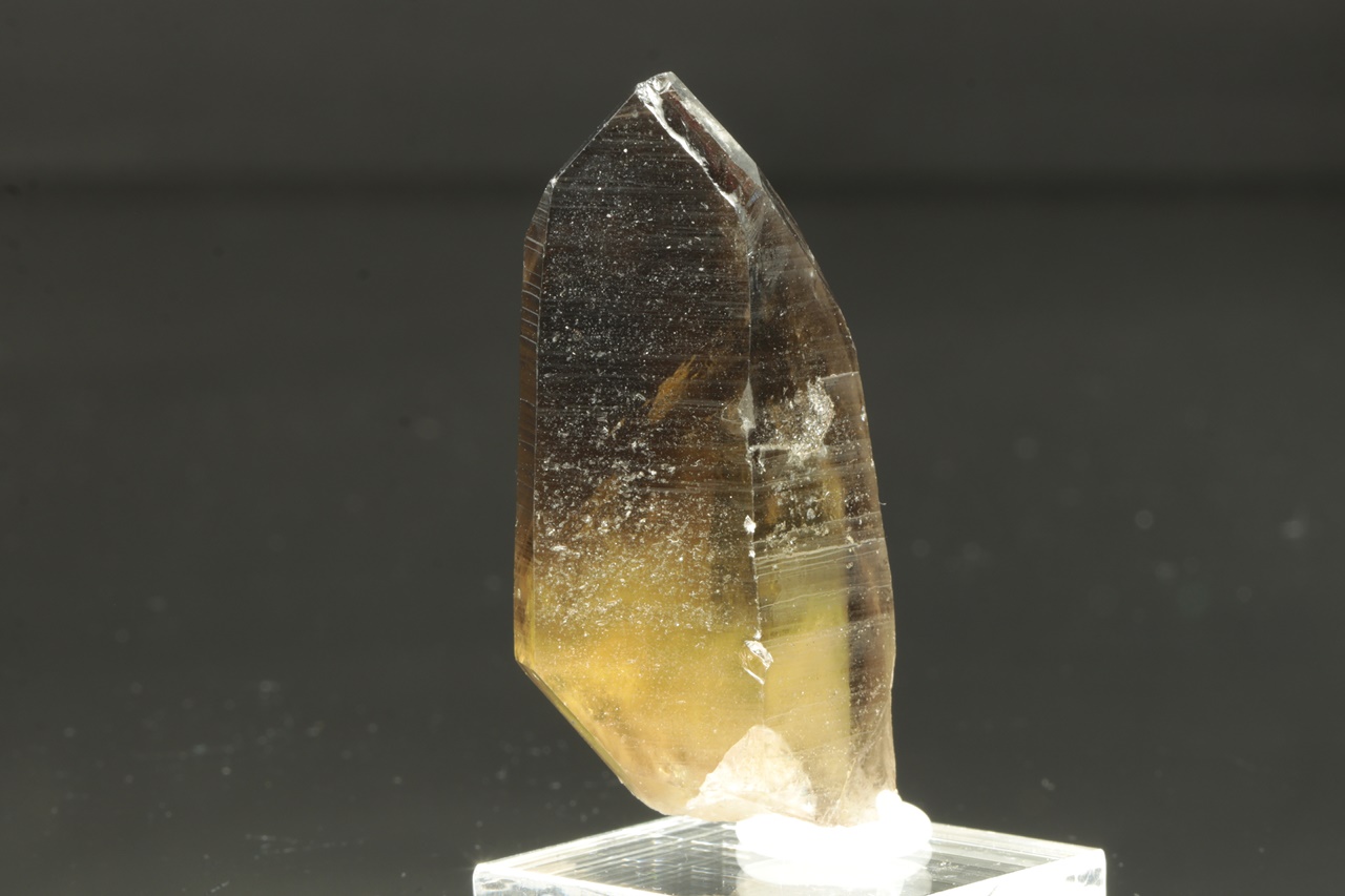 Oboustranně ukončený krystal citrnínu s tmavou špičkou. Ve spodu krystalu je vrostlý bílý křemen.