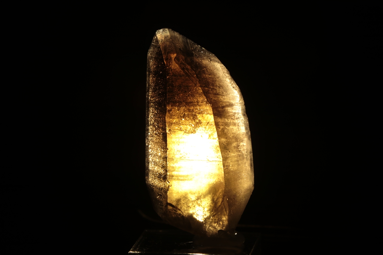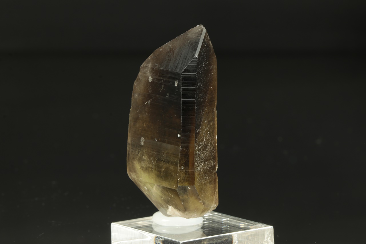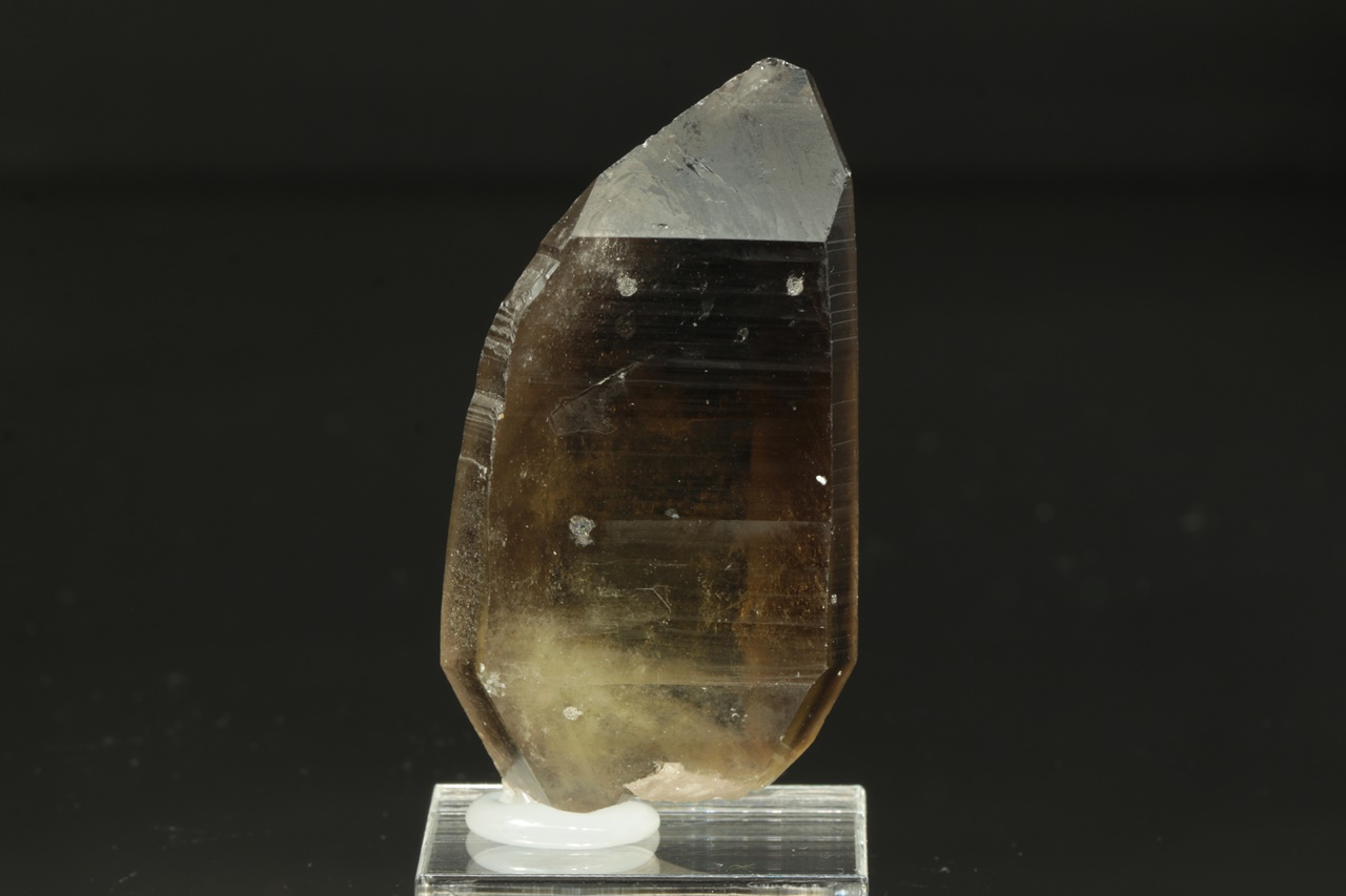 Oboustranně ukončený krystal citrnínu s tmavou špičkou. Ve spodu krystalu je vrostlý bílý křemen.
