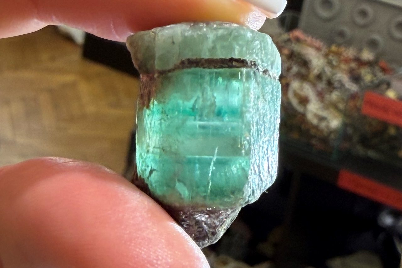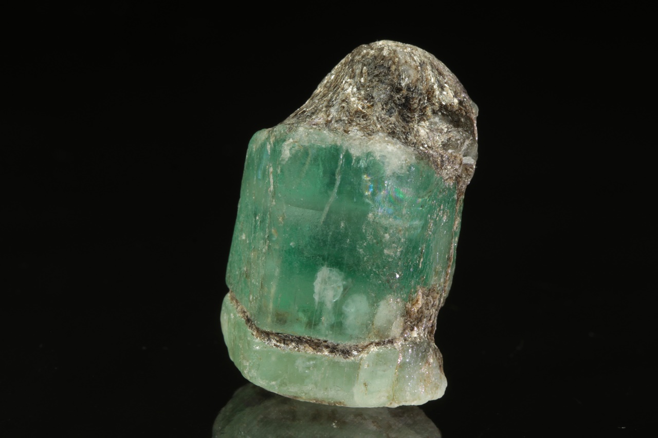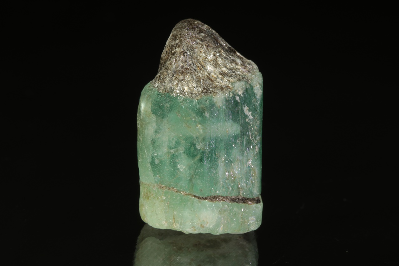 Dva centimetry velký krystal zeleného průsvitného smaragdu s výraznou zonálností. Krystal je z obou stran ukončený bází.