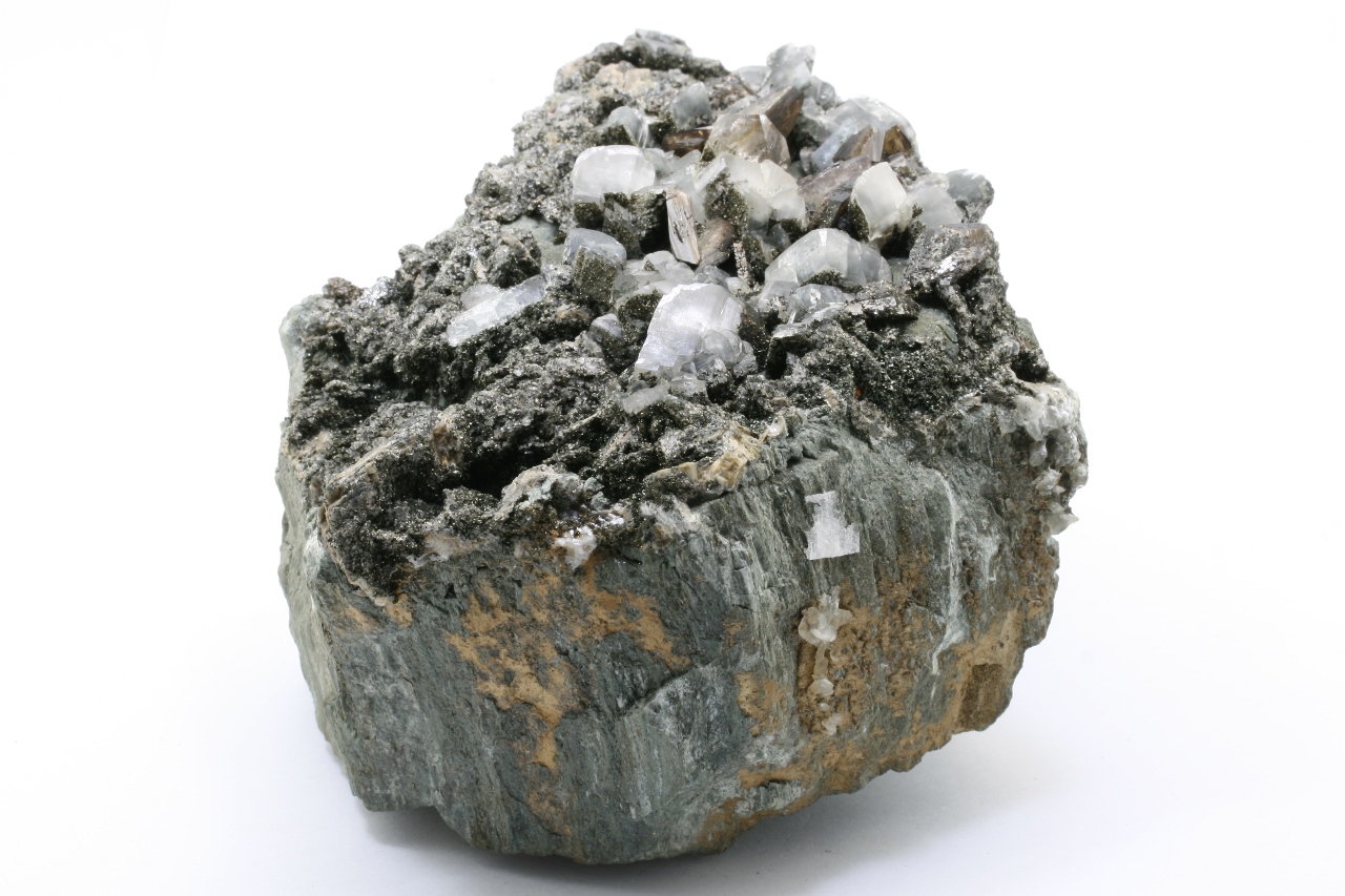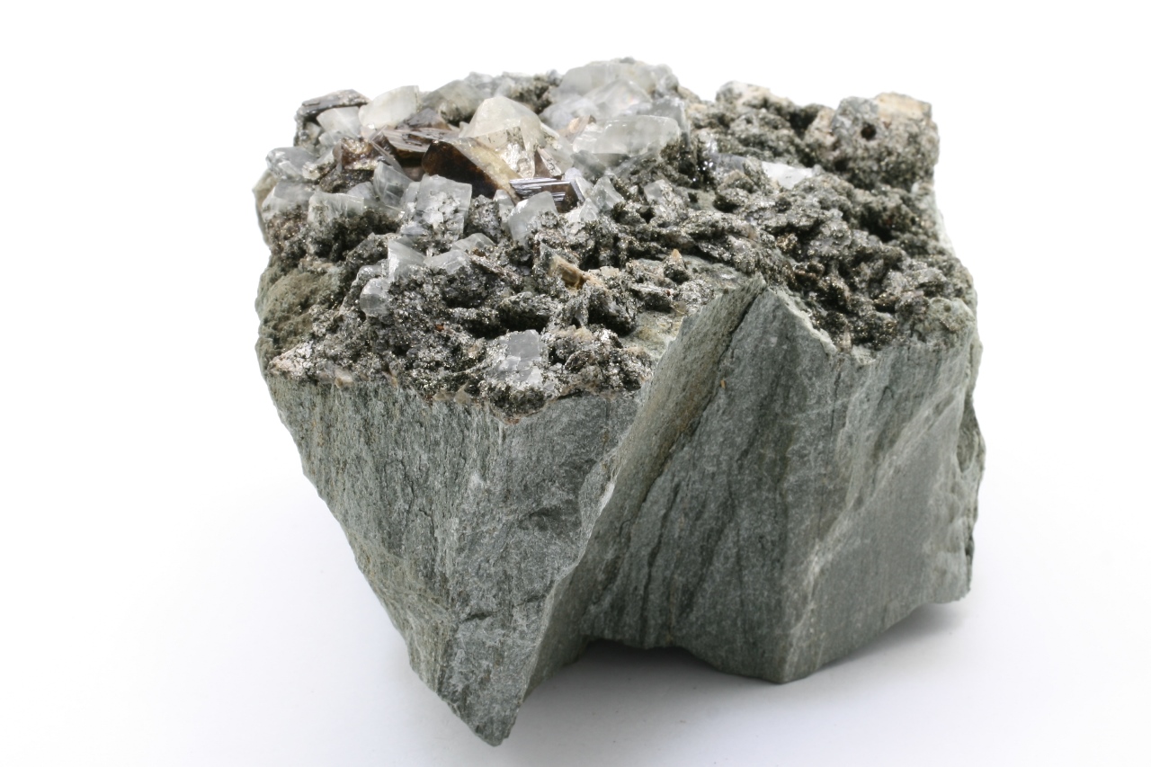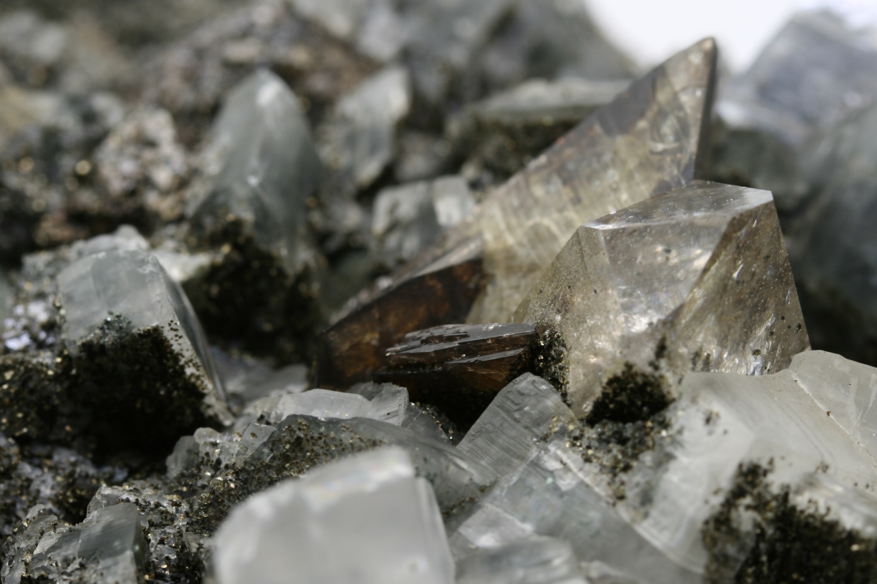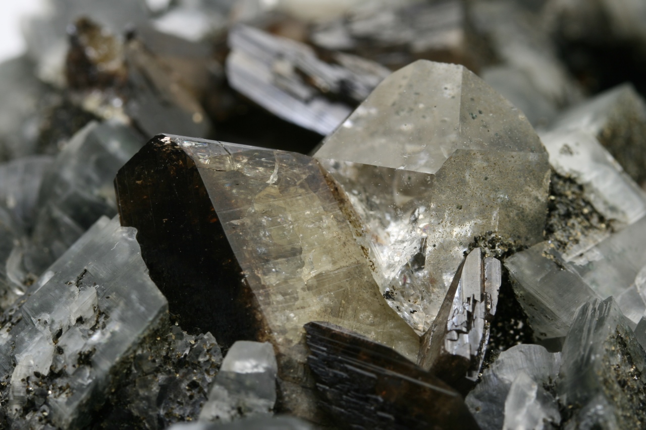 Braune Titanit-Kristalle, weiße Calcit-Klüfte mit einem klaren Quarz-Kristall und kleinen Chlorit-Kristallen. Der größte Titanit-Kristall ist 18 mm groß.