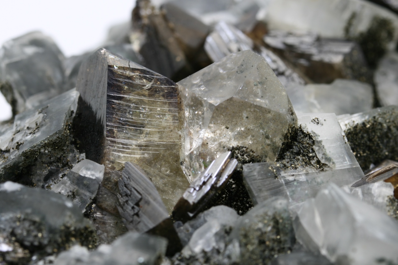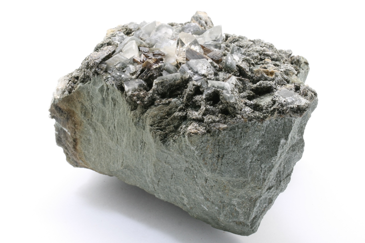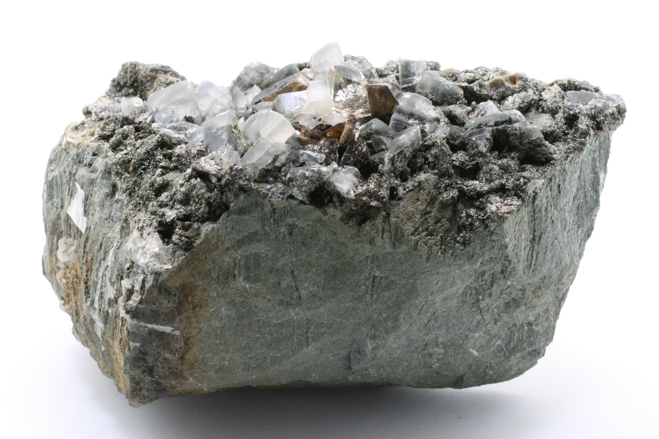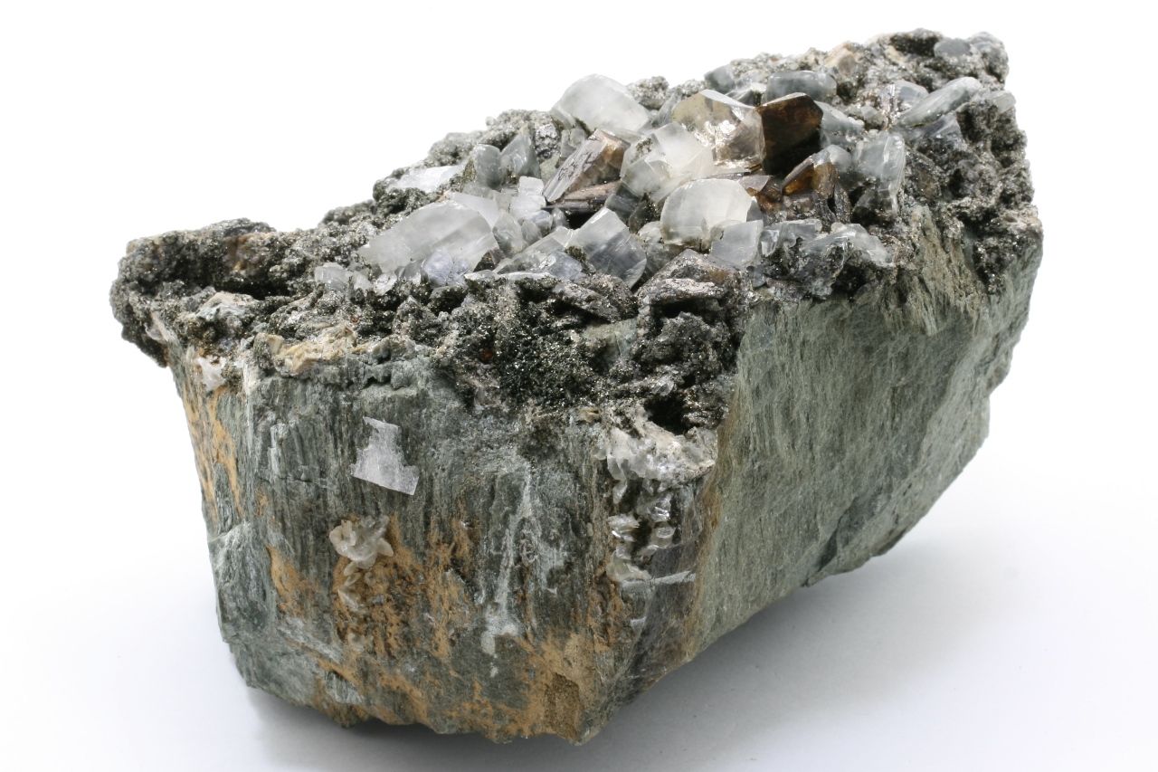 Braune Titanit-Kristalle, weiße Calcit-Klüfte mit einem klaren Quarz-Kristall und kleinen Chlorit-Kristallen. Der größte Titanit-Kristall ist 18 mm groß.