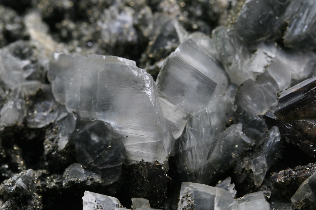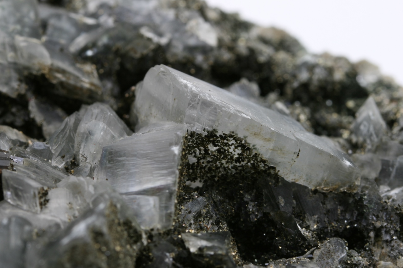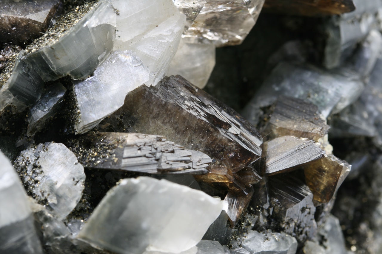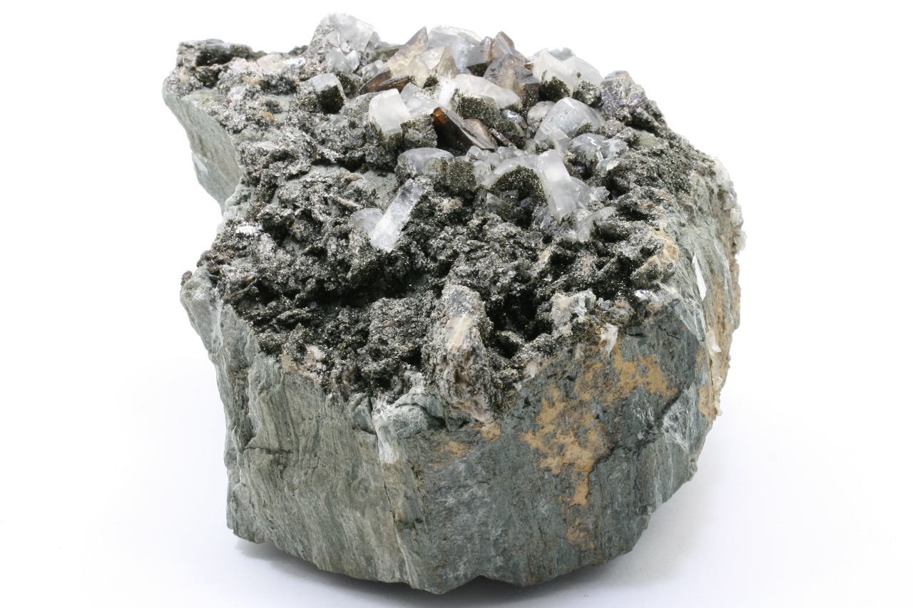Braune Titanit-Kristalle, weiße Calcit-Klüfte mit einem klaren Quarz-Kristall und kleinen Chlorit-Kristallen. Der größte Titanit-Kristall ist 18 mm groß.