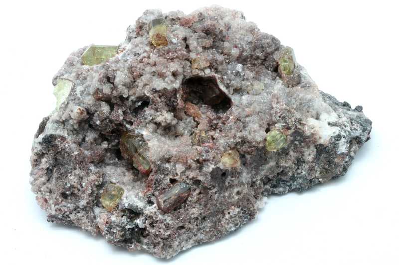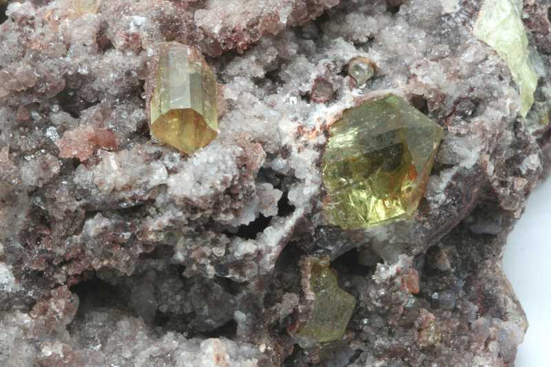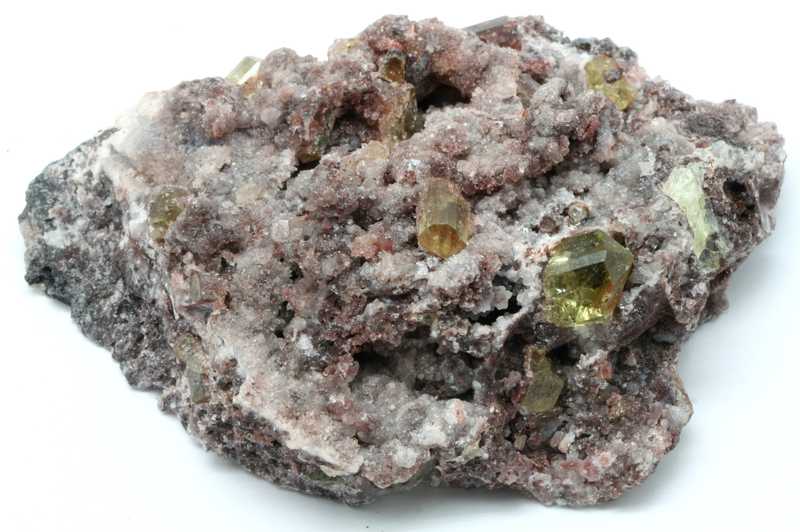 Probe eines intensiv gefärbten Apatits aus Mexiko mit einer Größe von bis zu 13 mm. Grünlich-gelbe, glänzende Apatitkristalle, die in die Unterlage einwachsen.
