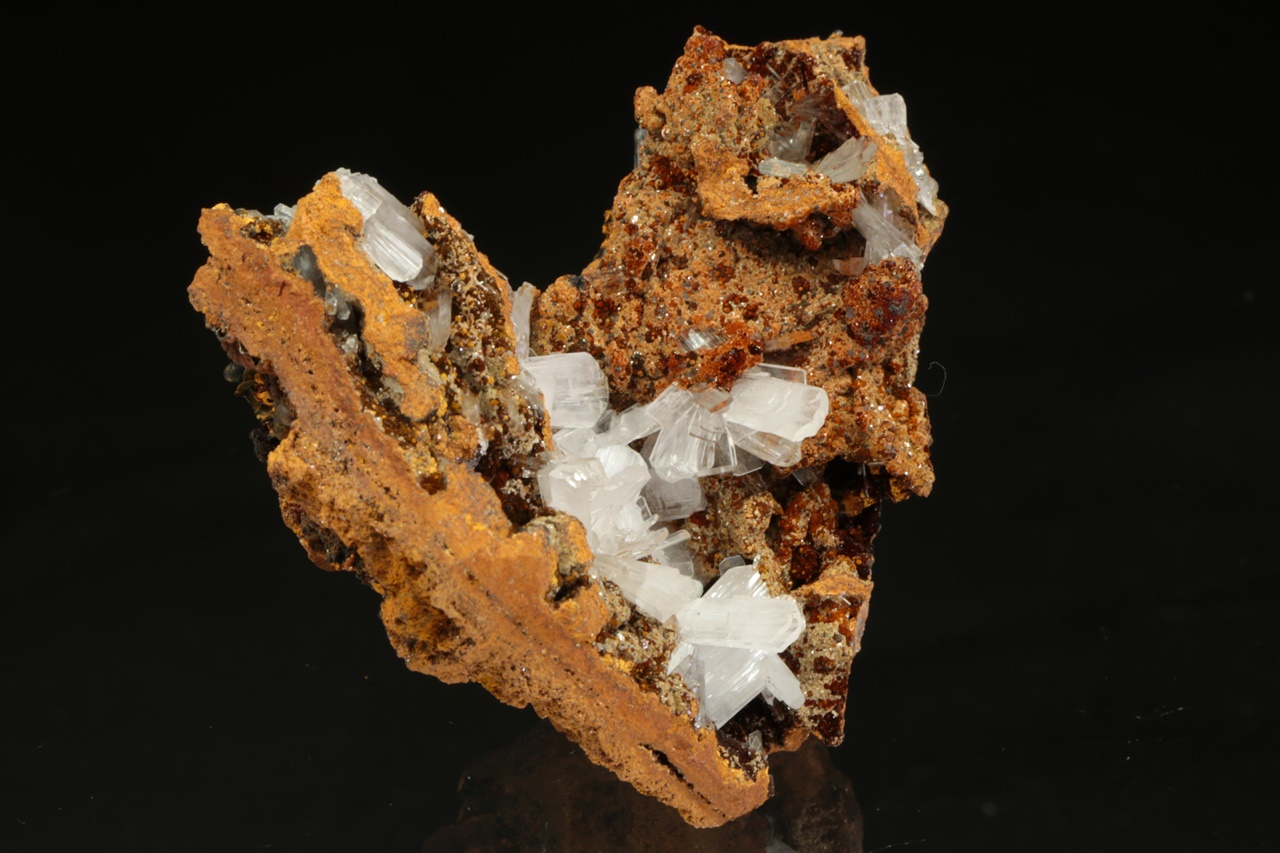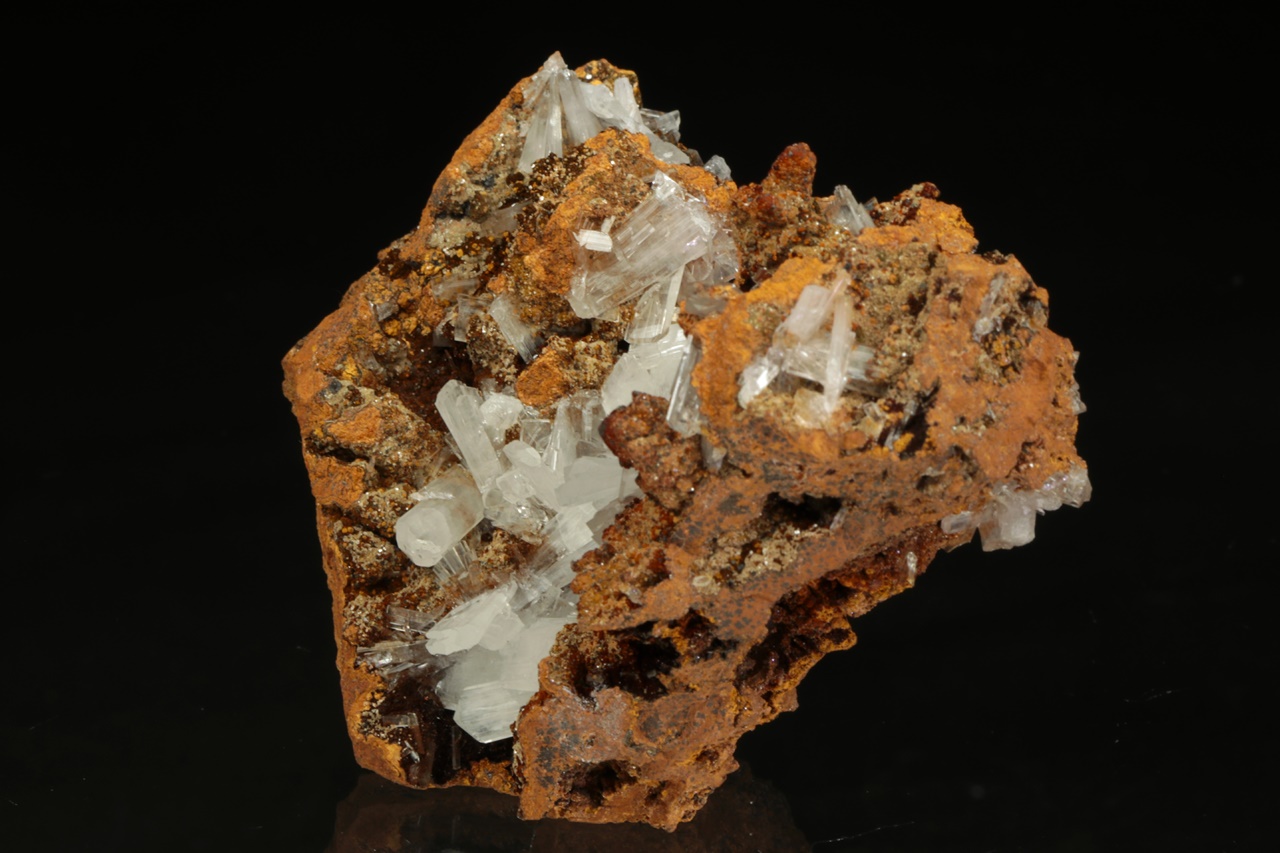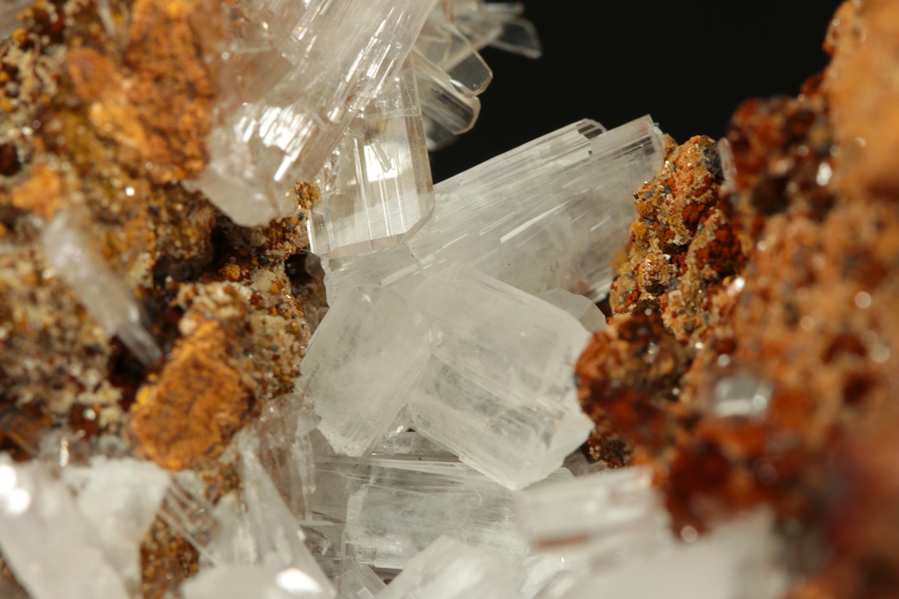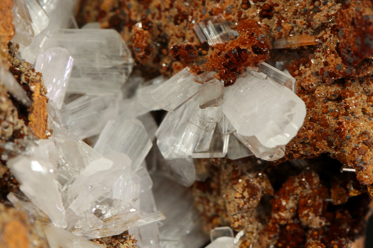 Hemimorfit, Mapimi, Mexiko. Dutinka velmi dobře omezených, průsvitných až mléčně zabarvených krystalů hemimorfitu.