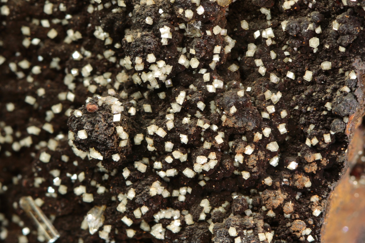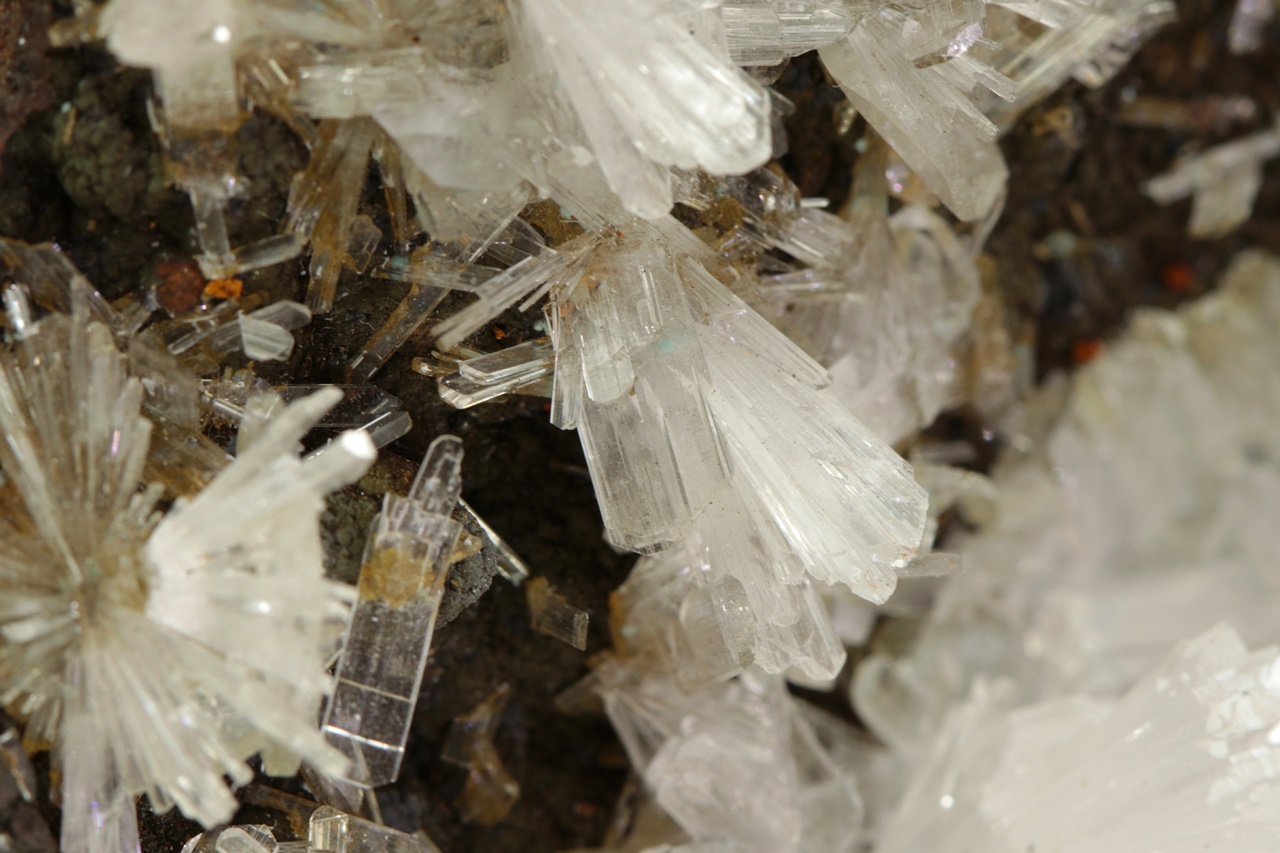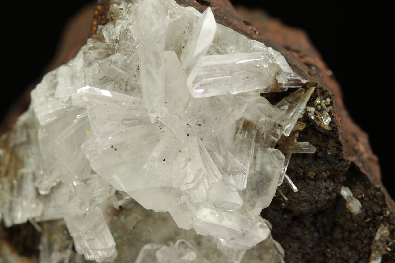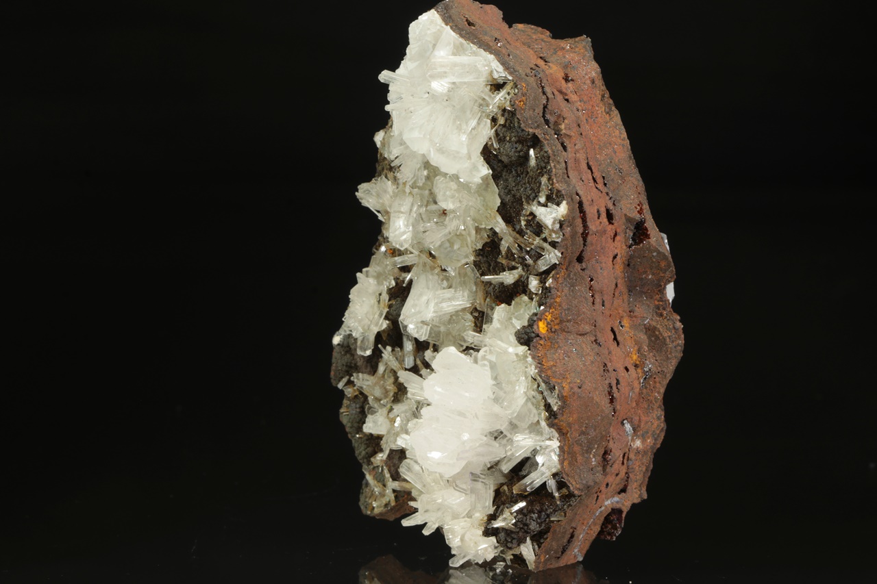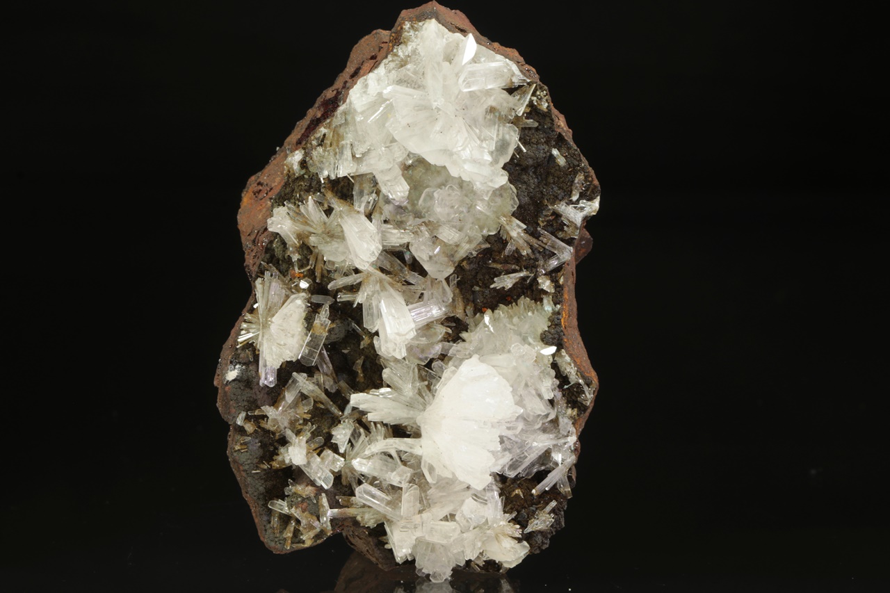 Pěkný vzorek hemimorfitu z mexické lokality tvořícího bílé až čiré lesklé krystaly o velikosti až 13 mm, na zadní straně vzorku jsou pak drobné krystalky kalcitu.