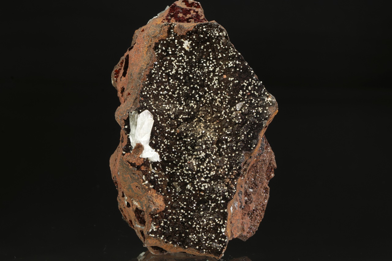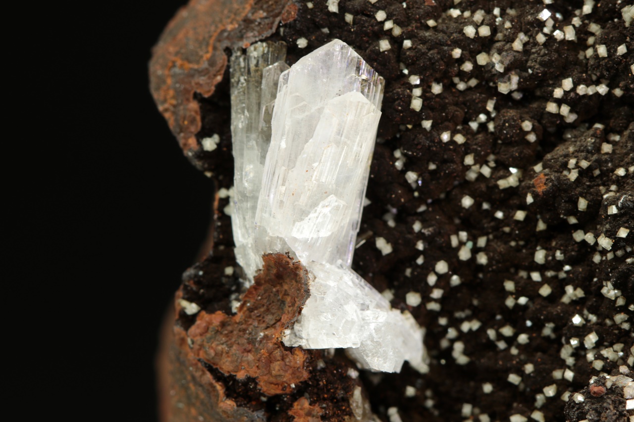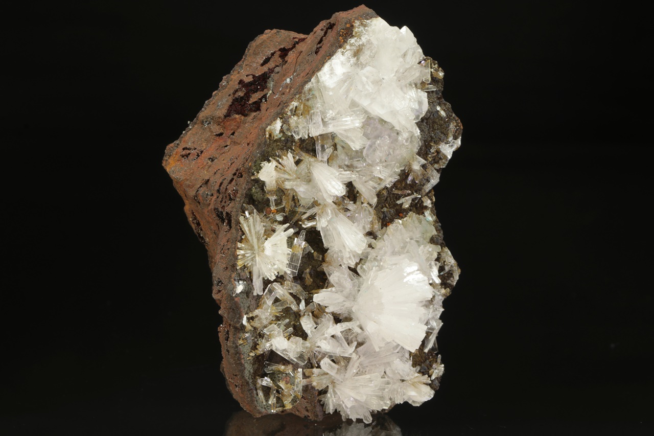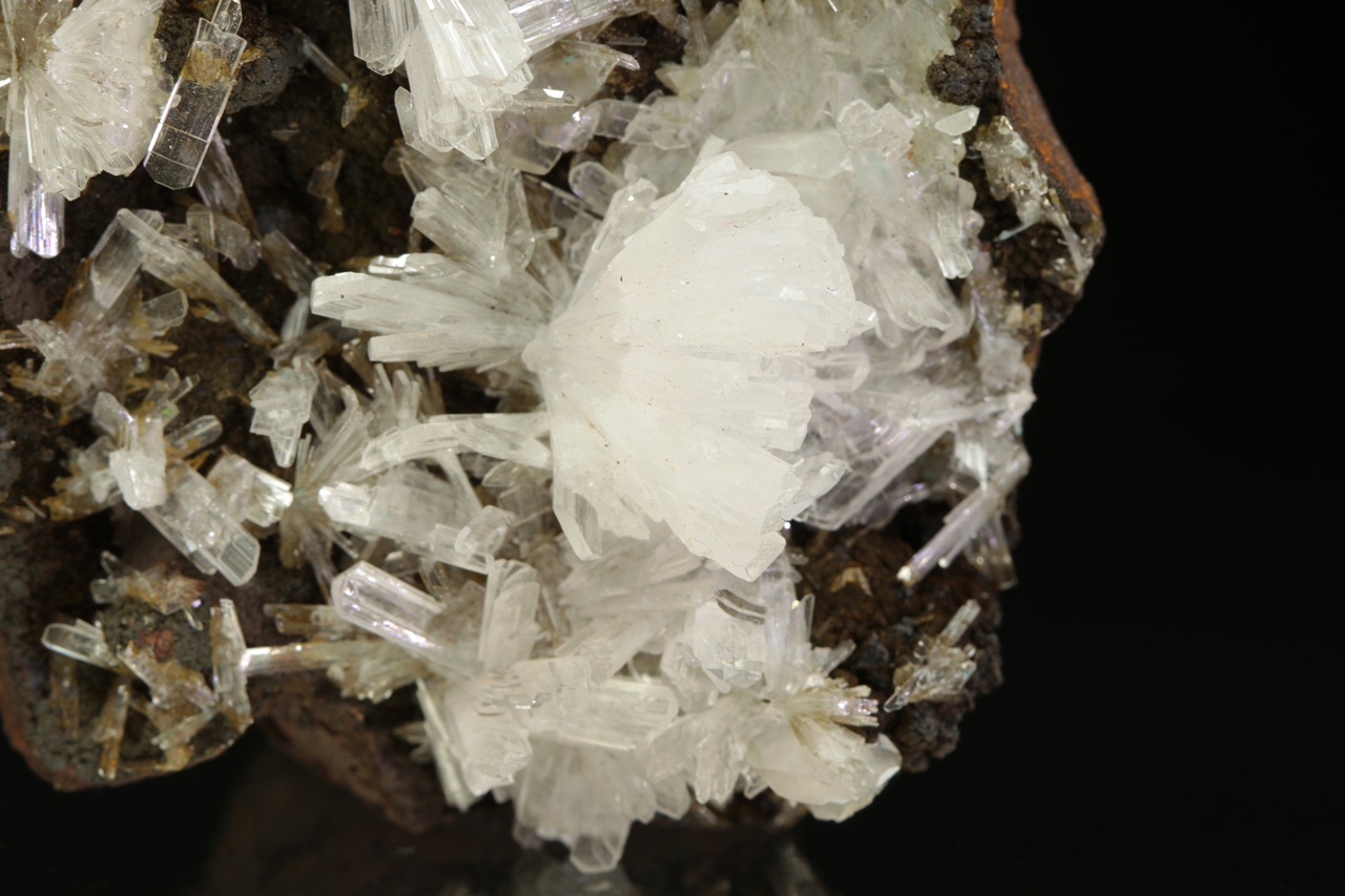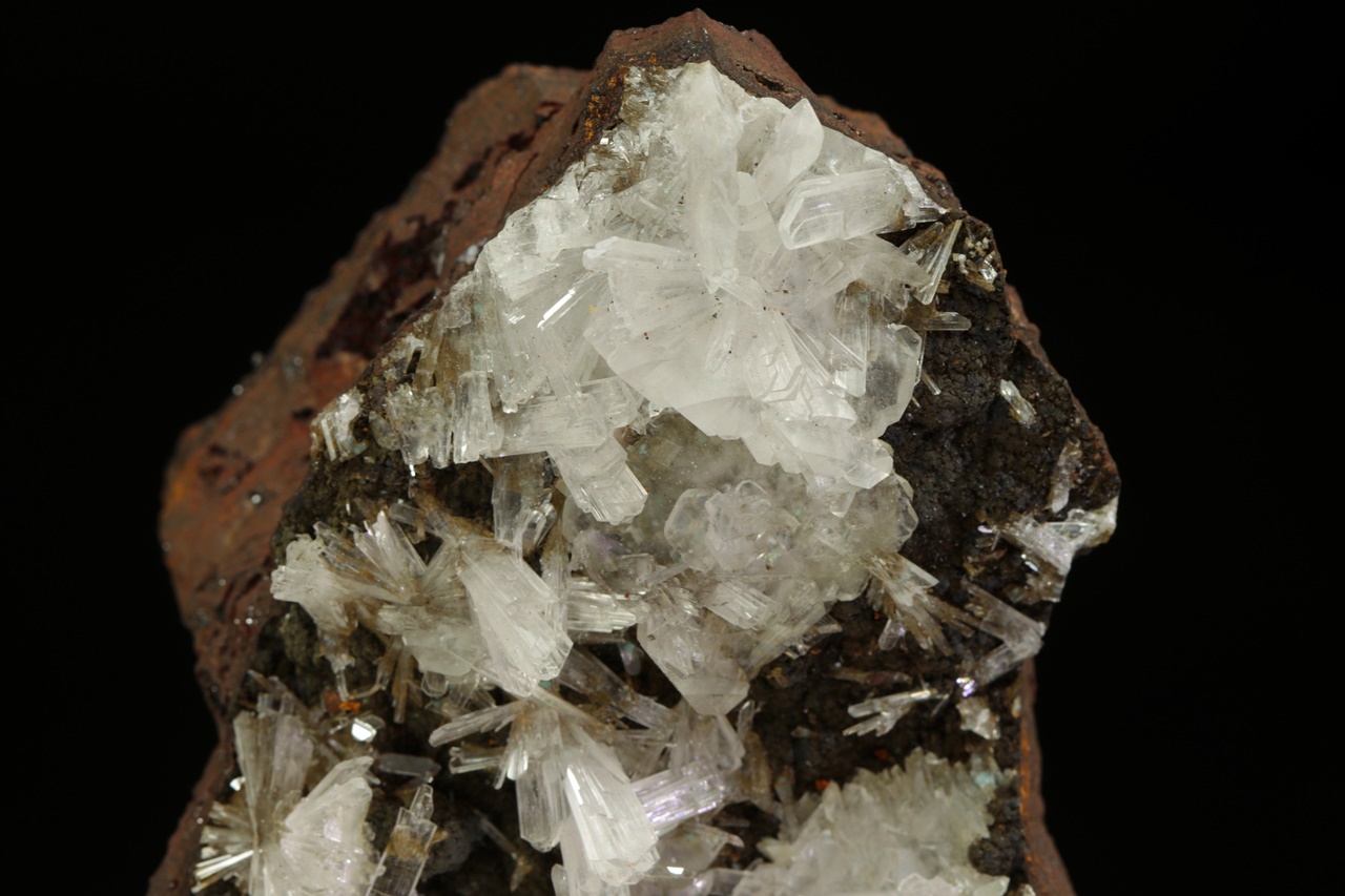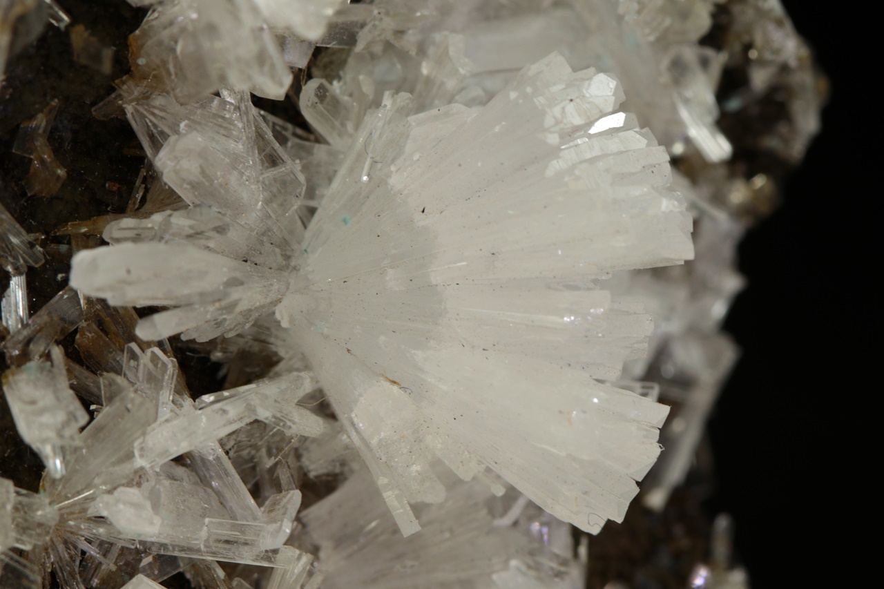 Pěkný vzorek hemimorfitu z mexické lokality tvořícího bílé až čiré lesklé krystaly o velikosti až 13 mm, na zadní straně vzorku jsou pak drobné krystalky kalcitu.