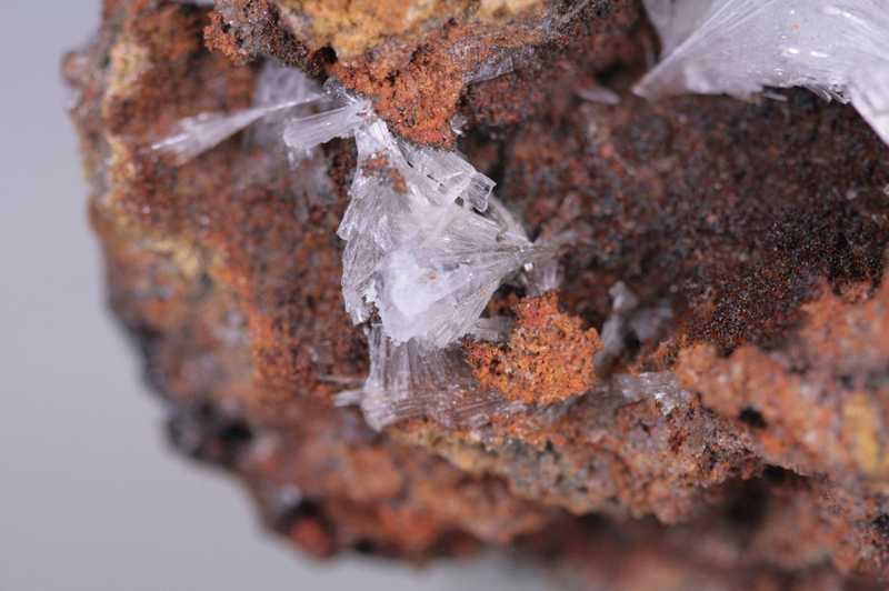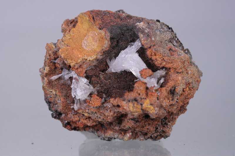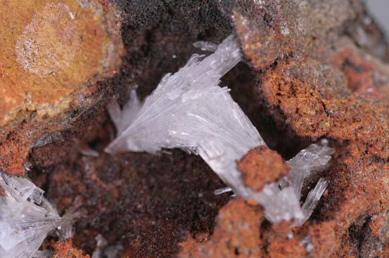Velmi esteticky vypadající ukázka kontrastně zabarveného hemimorfitu na tmavé matrix z klasické mexické lokality. Pěkná ukázka bezbarvých průhledných krystalů hemimorfitu vyrůstající v dutině zvětralé rudy