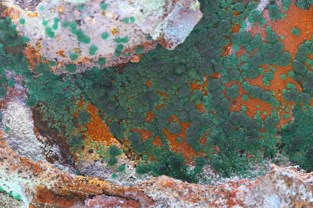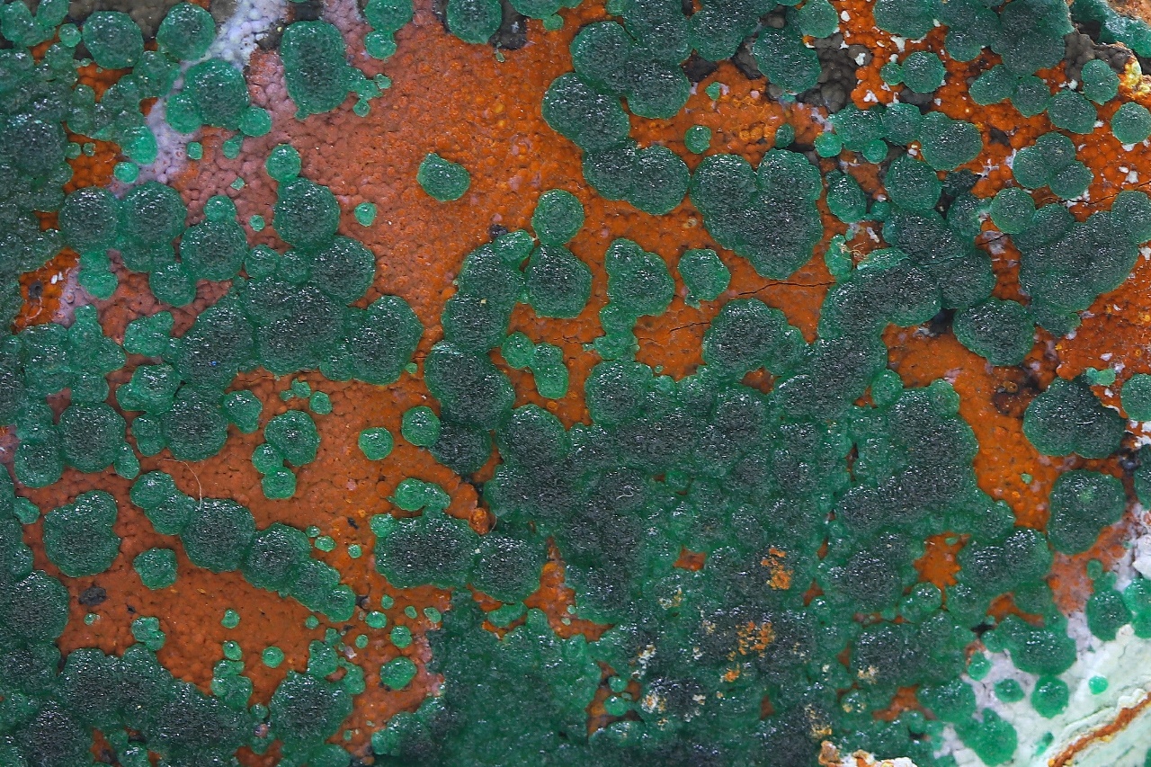 Zuwächse von radialen Aggregaten aus gesättigtem grünem Kupferphosphat bis zu 1 cm groß.