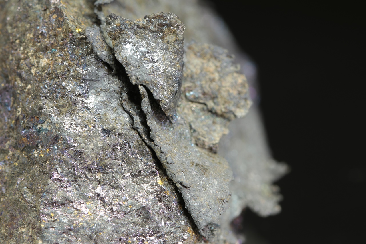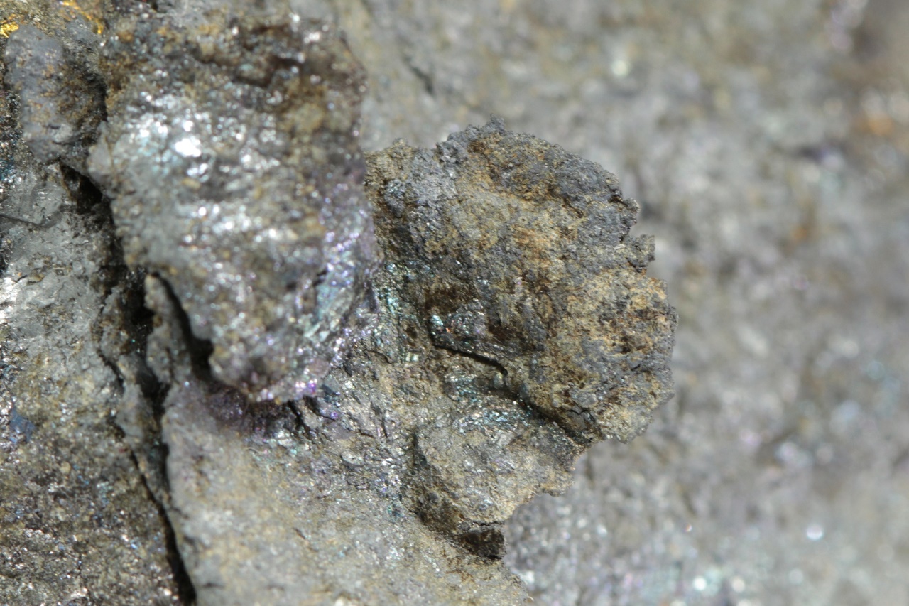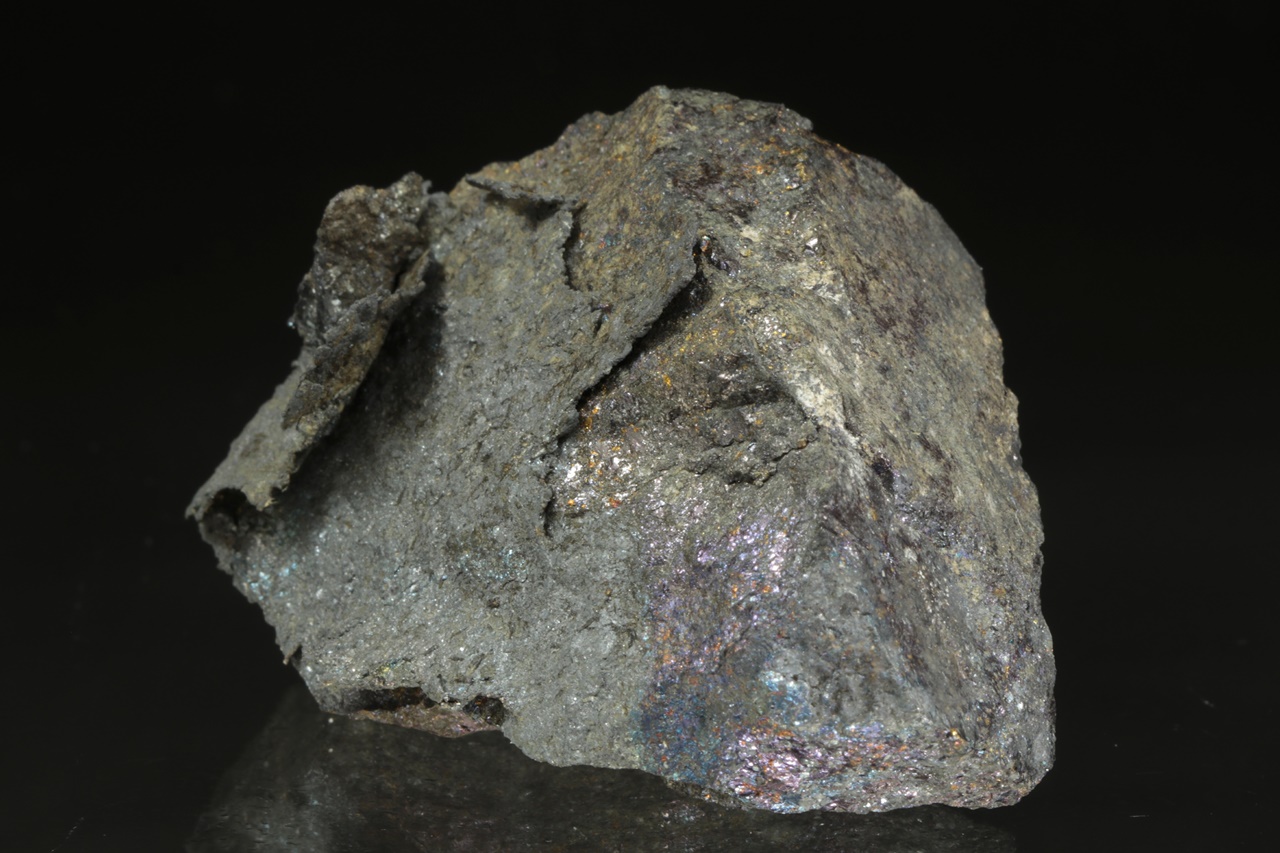 Plech přírodního stříbra, místy pokrytý bornitem, narůstající na podložku z masivního bornitu s výraznými náběhovými barvami. Historický vzorek z Mexika.