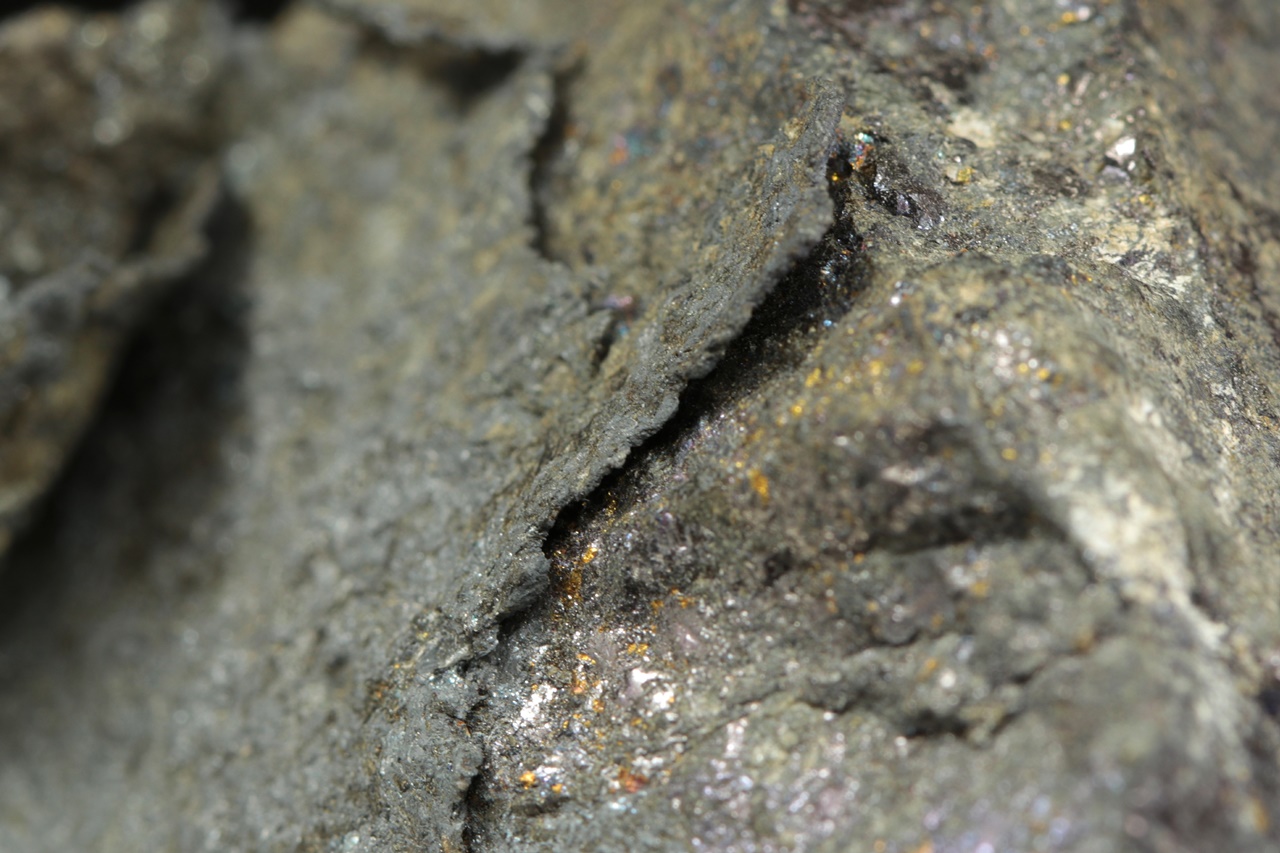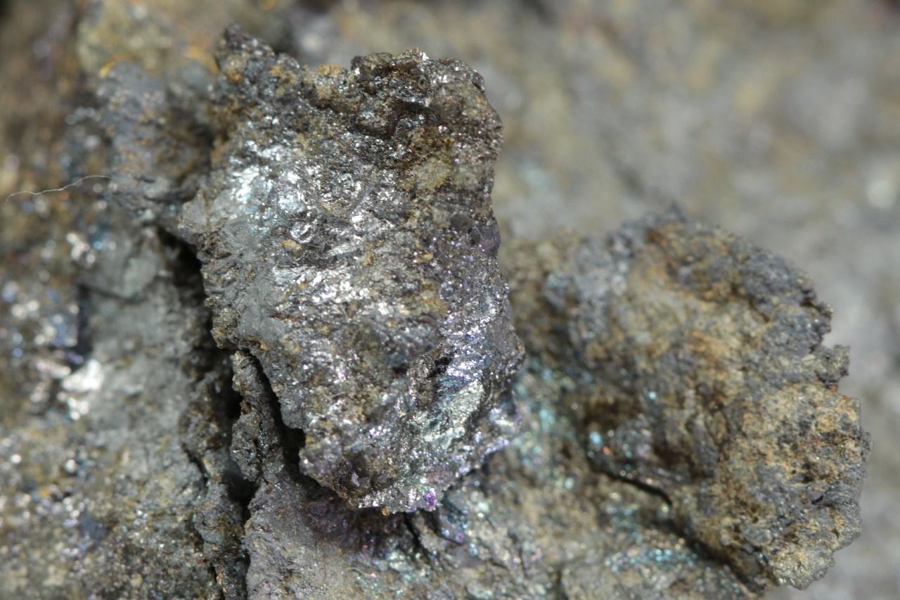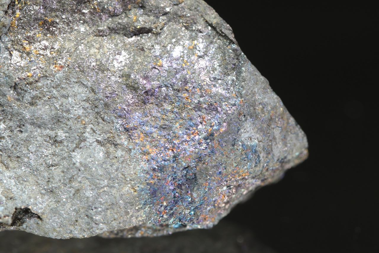 Plech přírodního stříbra, místy pokrytý bornitem, narůstající na podložku z masivního bornitu s výraznými náběhovými barvami. Historický vzorek z Mexika.