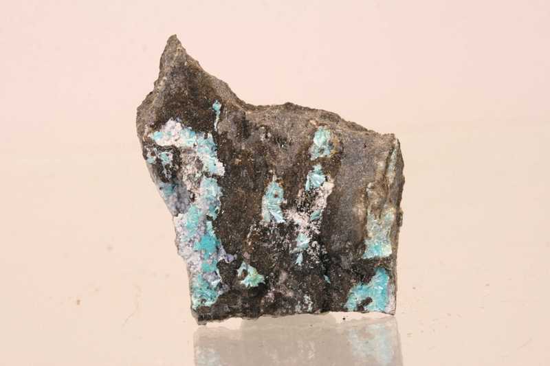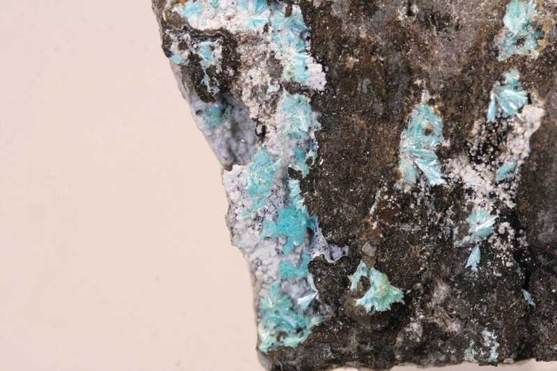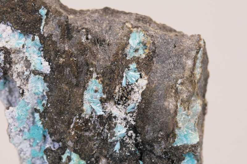 Ästhetisches Exemplar des schön blauen Zink-Kupfer-Karbonats Aurichalcit aus den USA. Nadelförmige Kristalle bis zu büschelförmigen Aggregaten von hellblauem Aurichalcit aus Arizona.