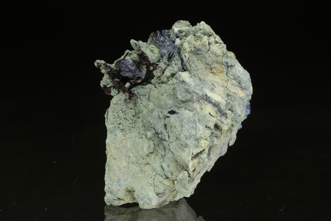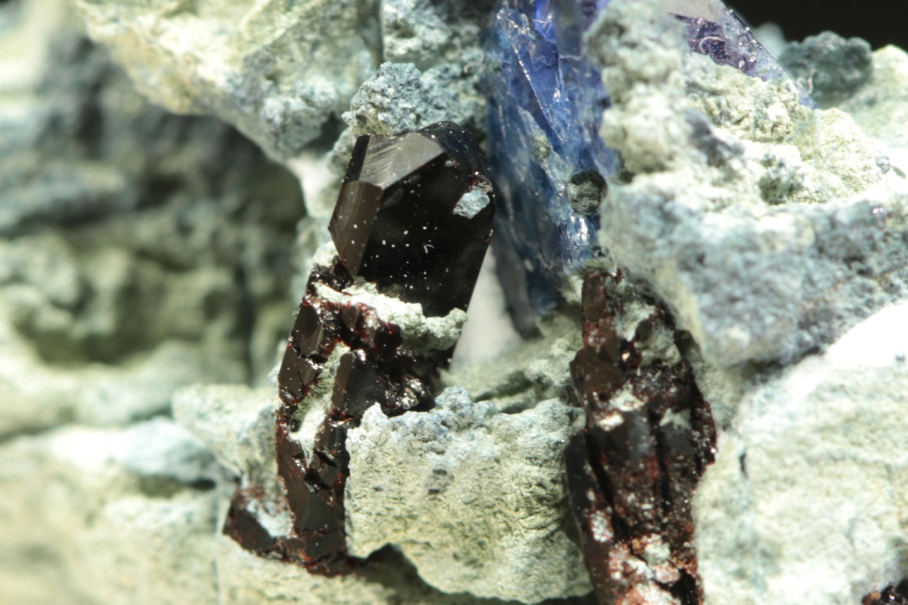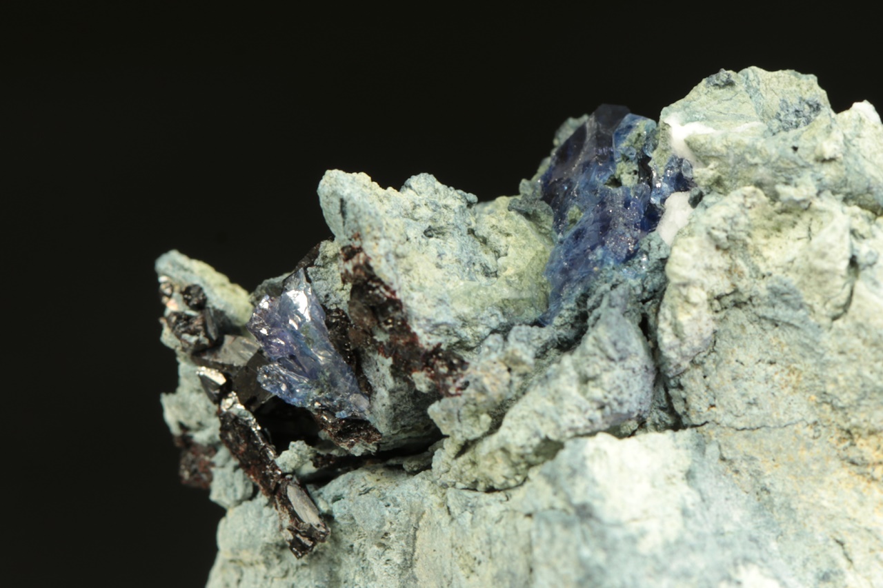 Kvalitní ukázka velmi vzácného benitoitu tvořícího tmavě modré průsvitné krystaly až 1 cm velké s také velmi vzácným černým sloupcovitým neptunitem.